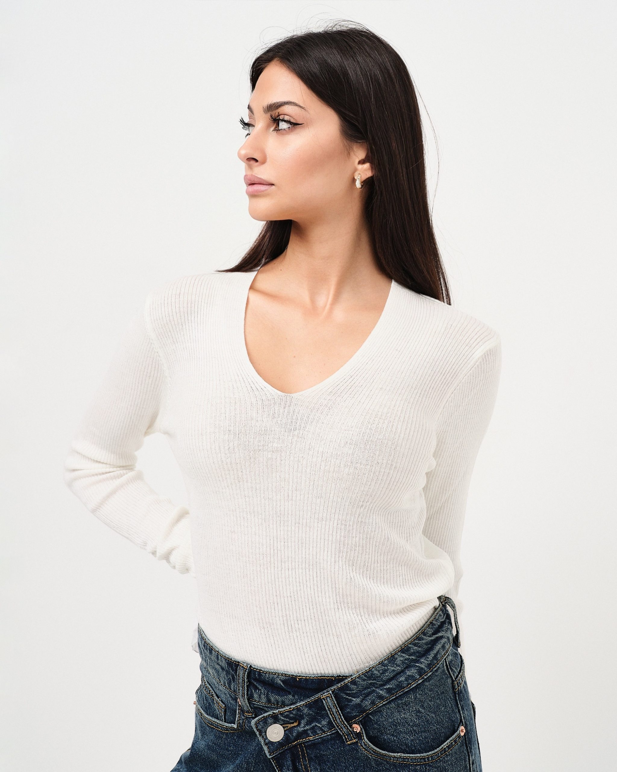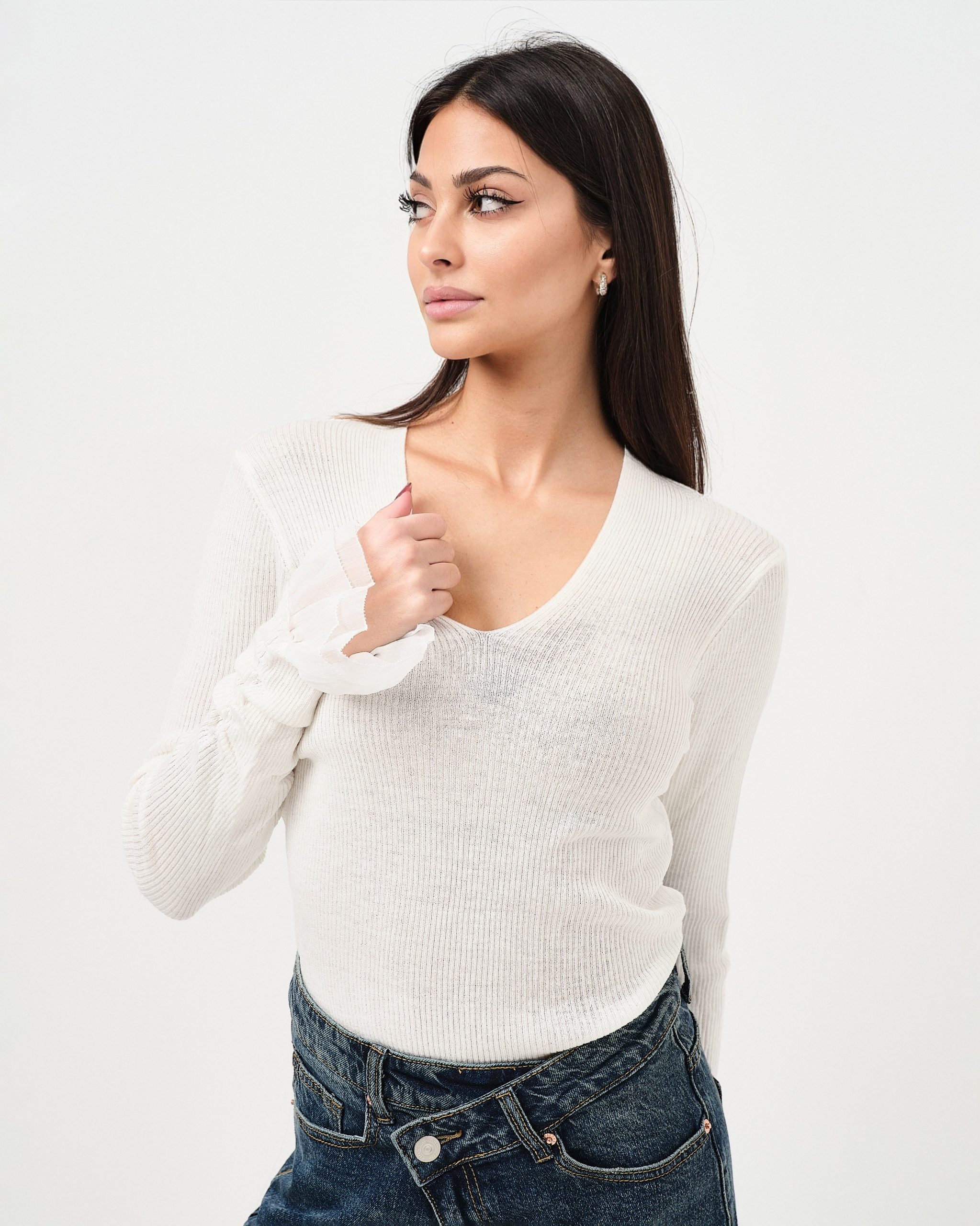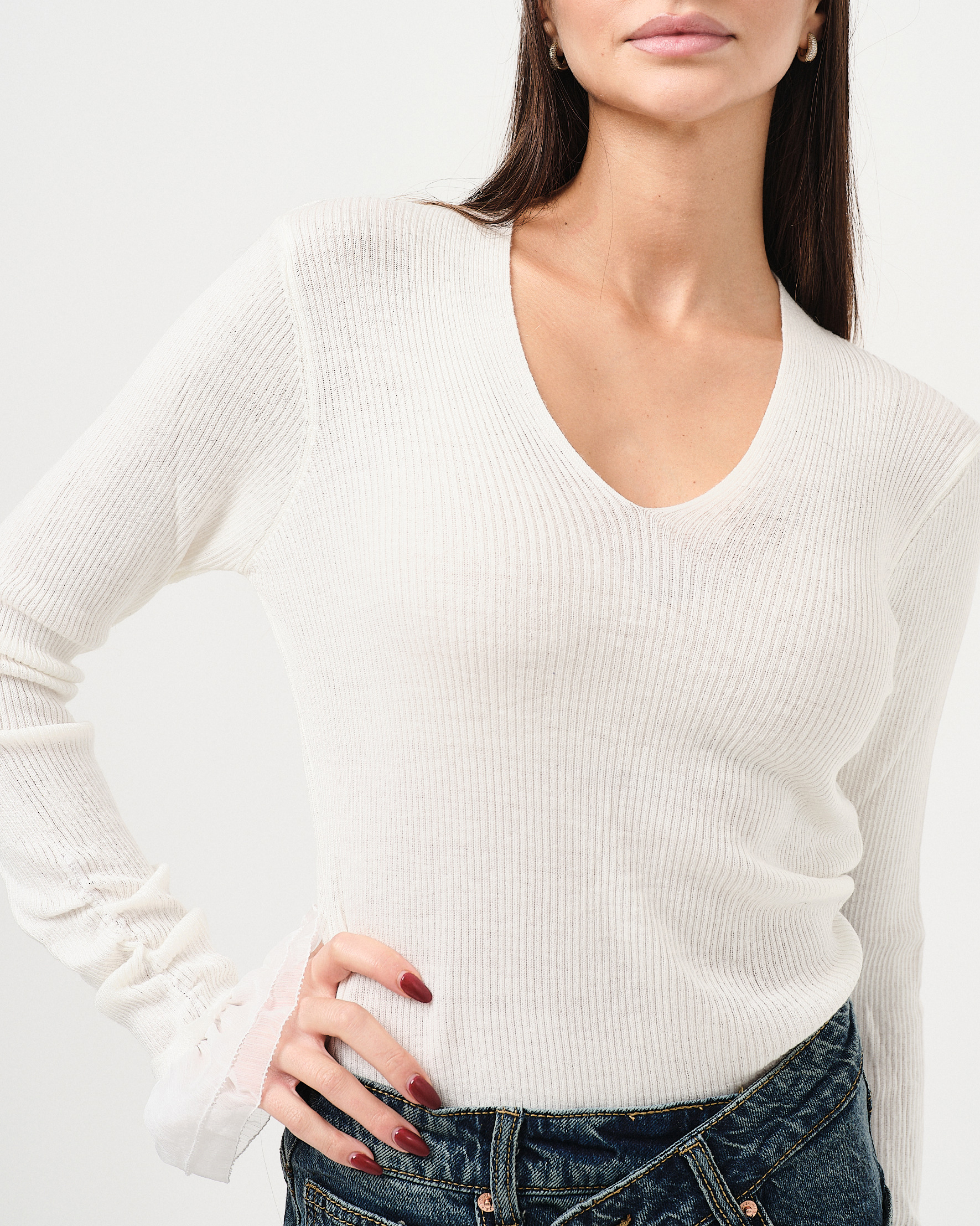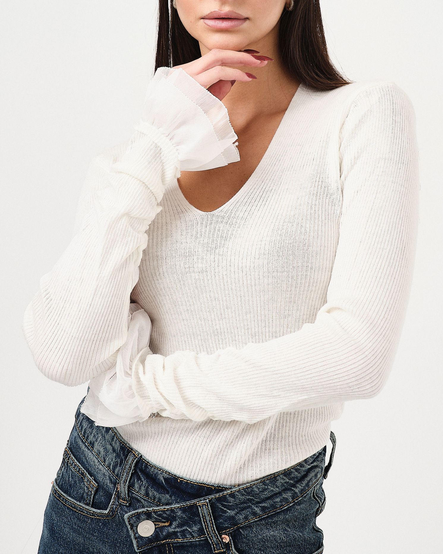 Maglia elasticizzata a manica lunga a costine con scollo a V e volant sul fondo.