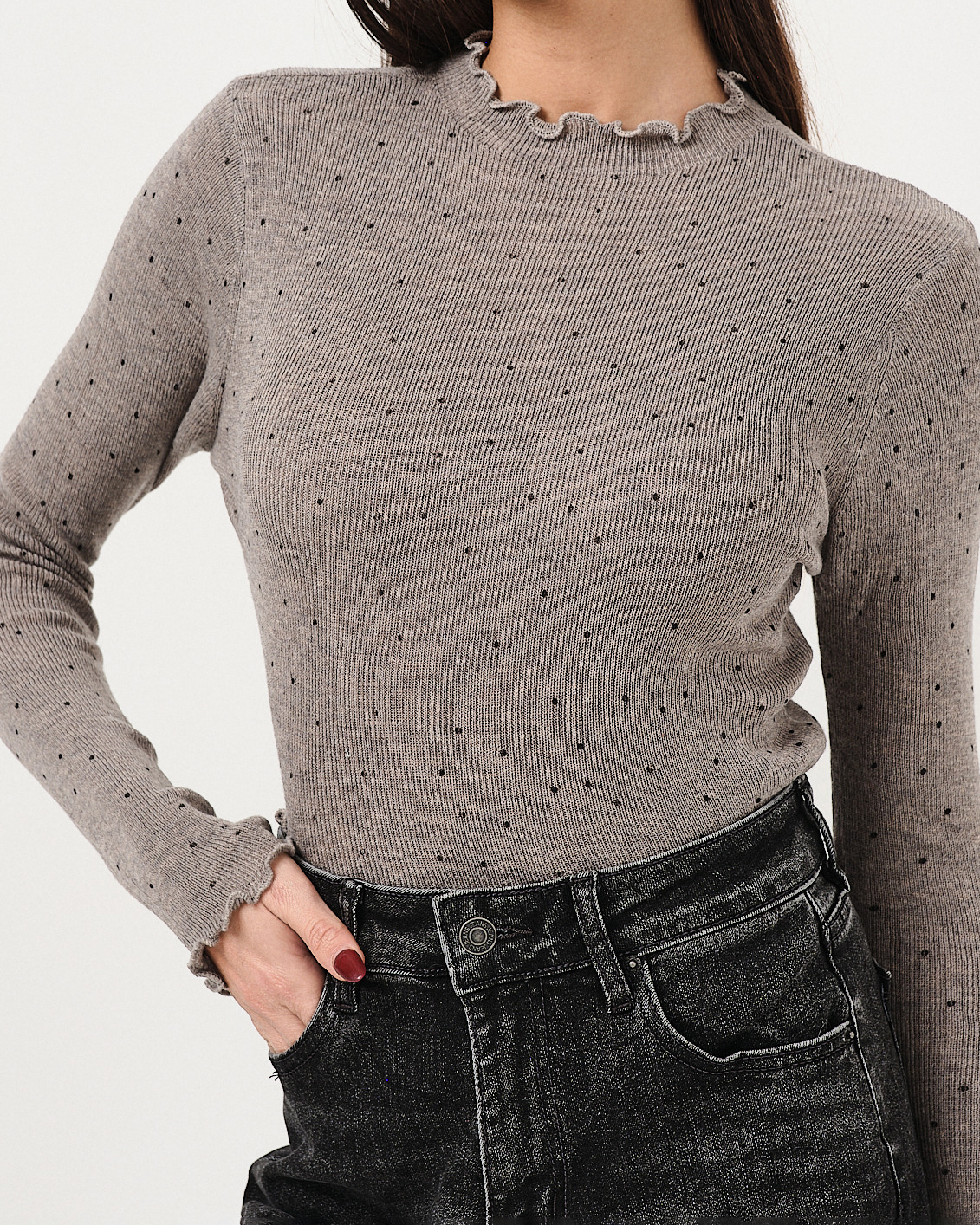 T-shirt slim fit a costine a manica lunga con collo a lupetto a pois.