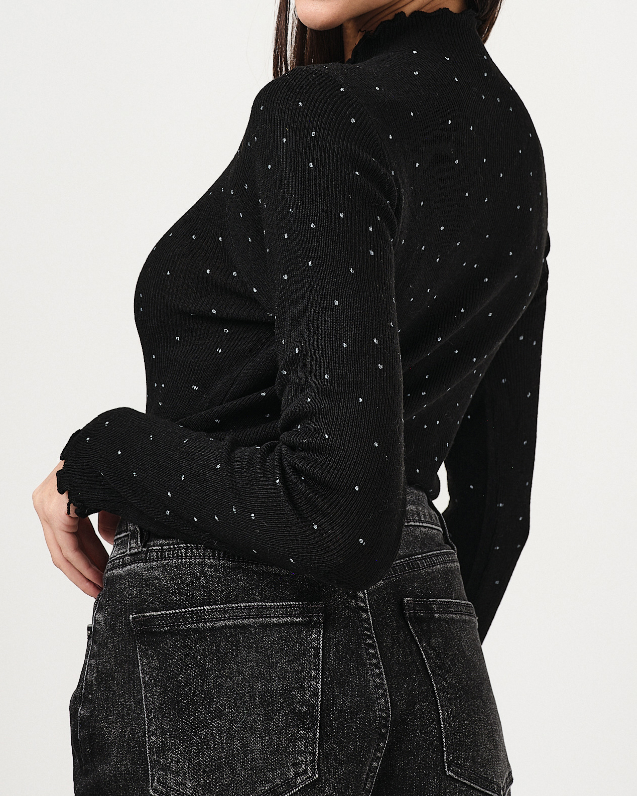 T-shirt slim fit a costine a manica lunga con collo a lupetto a pois.