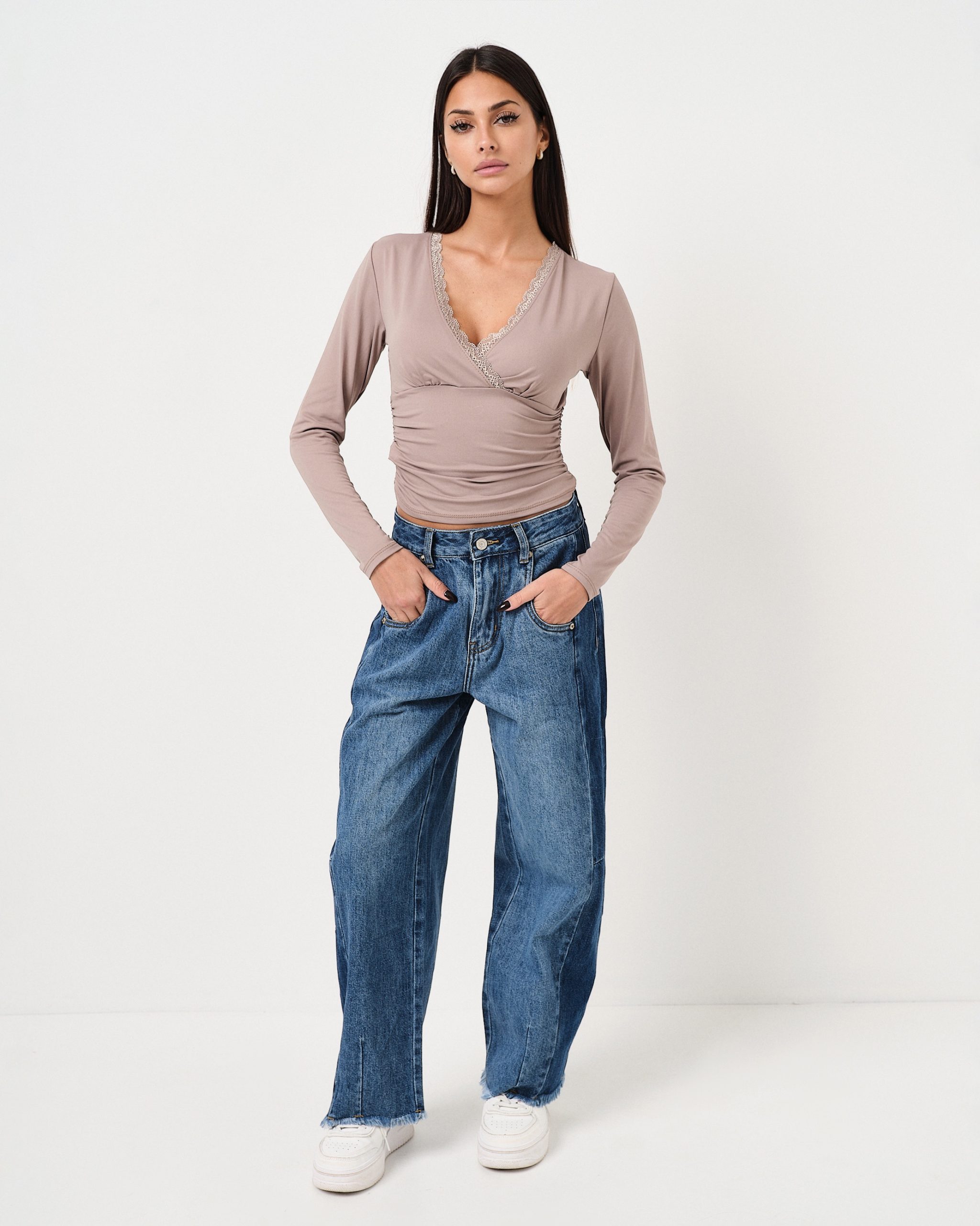 T-shirt cropped a manica lunga in lycra elasticizzata con scollatura a V e pizzo tono su tono.