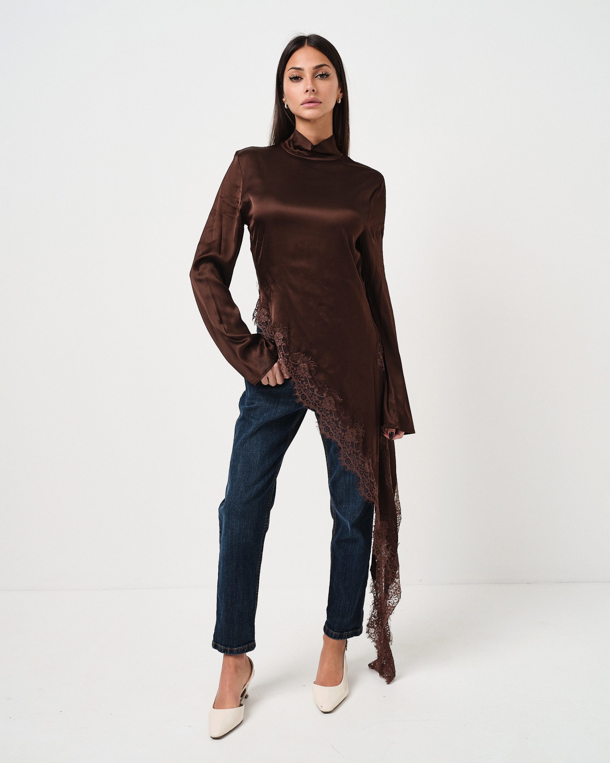 Top a manica lunga accollato e asimmetrico con strascico in pizzo.