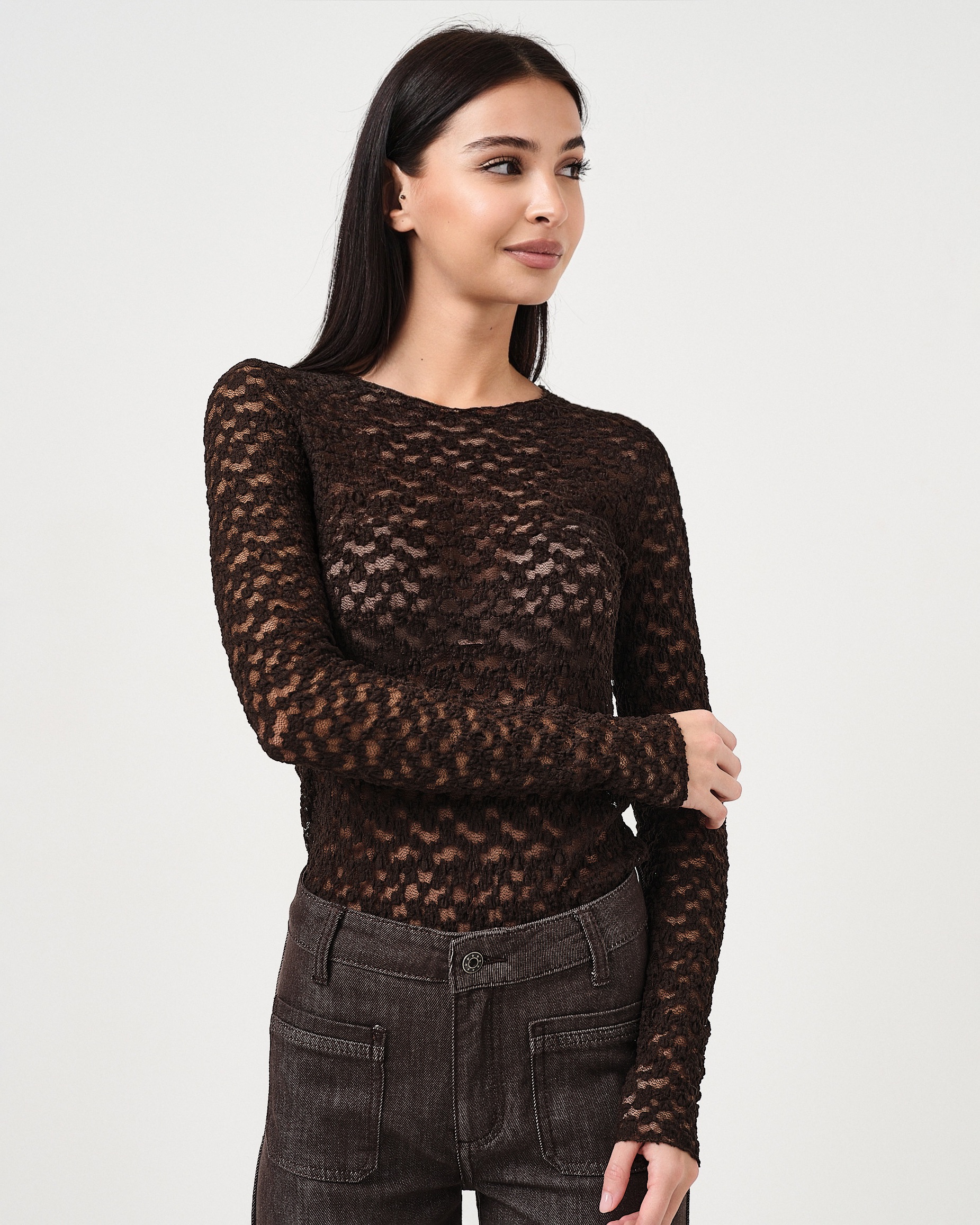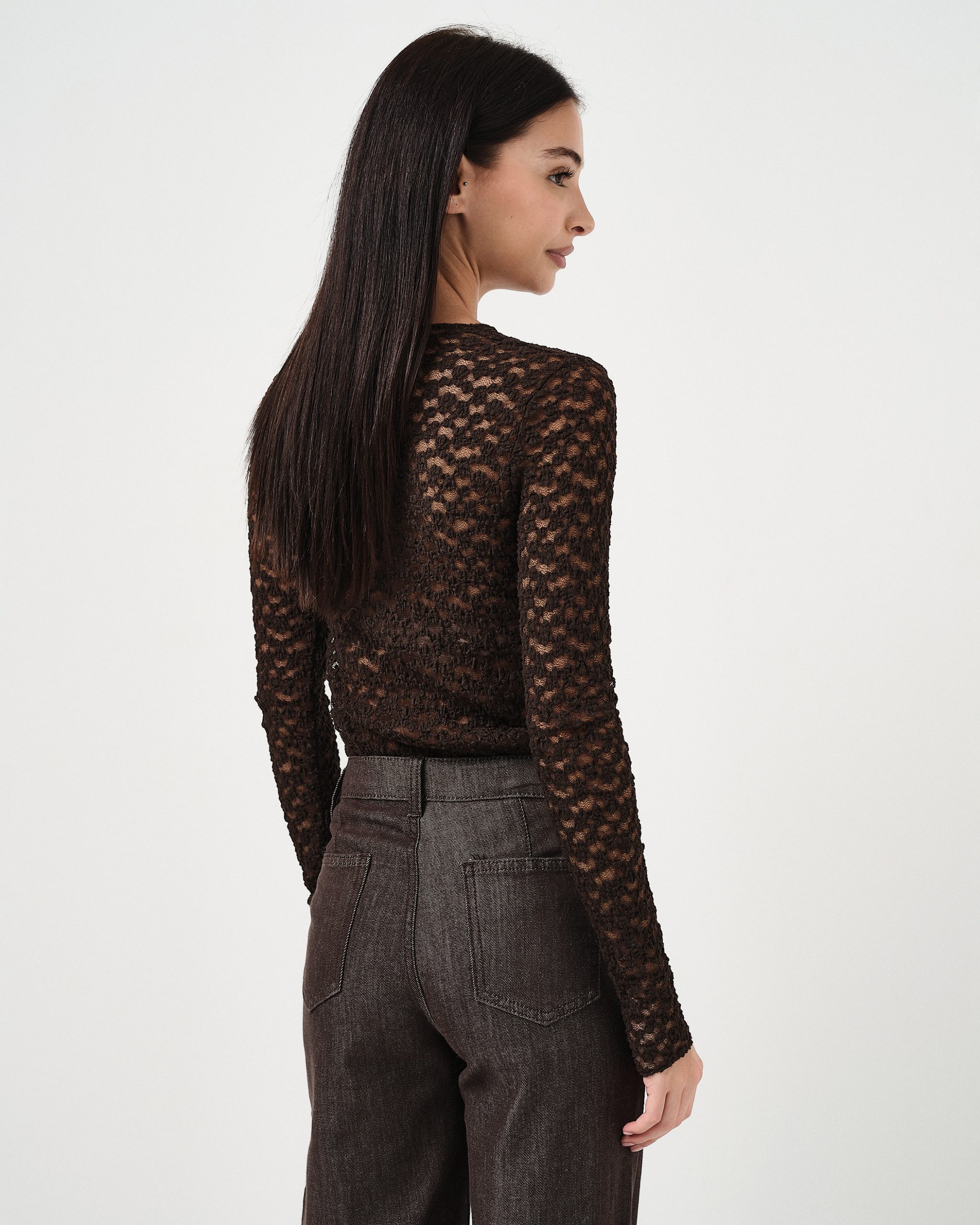 T-shirt slim fit a manica lunga girocollo in pizzo trasparente elasticizzato.