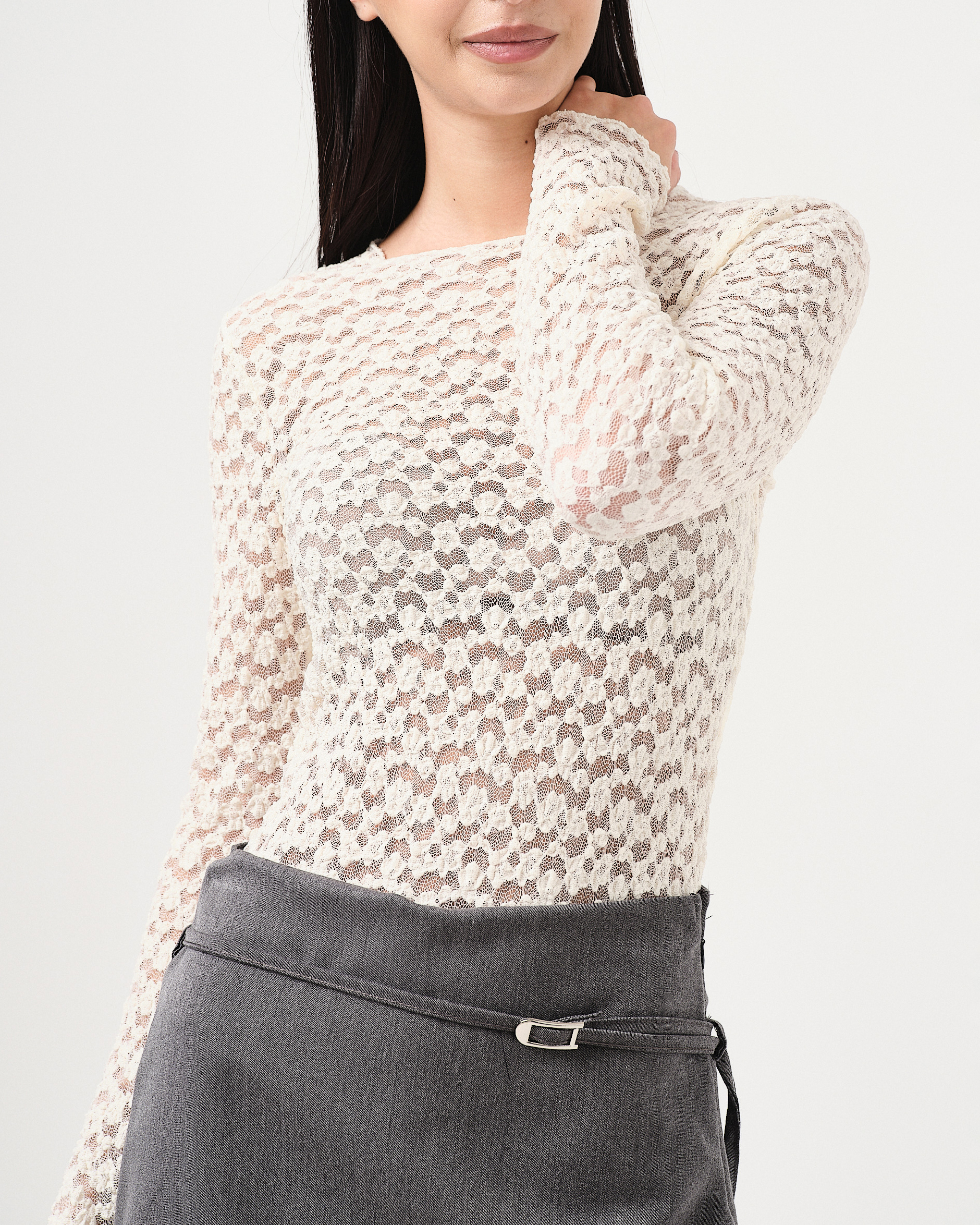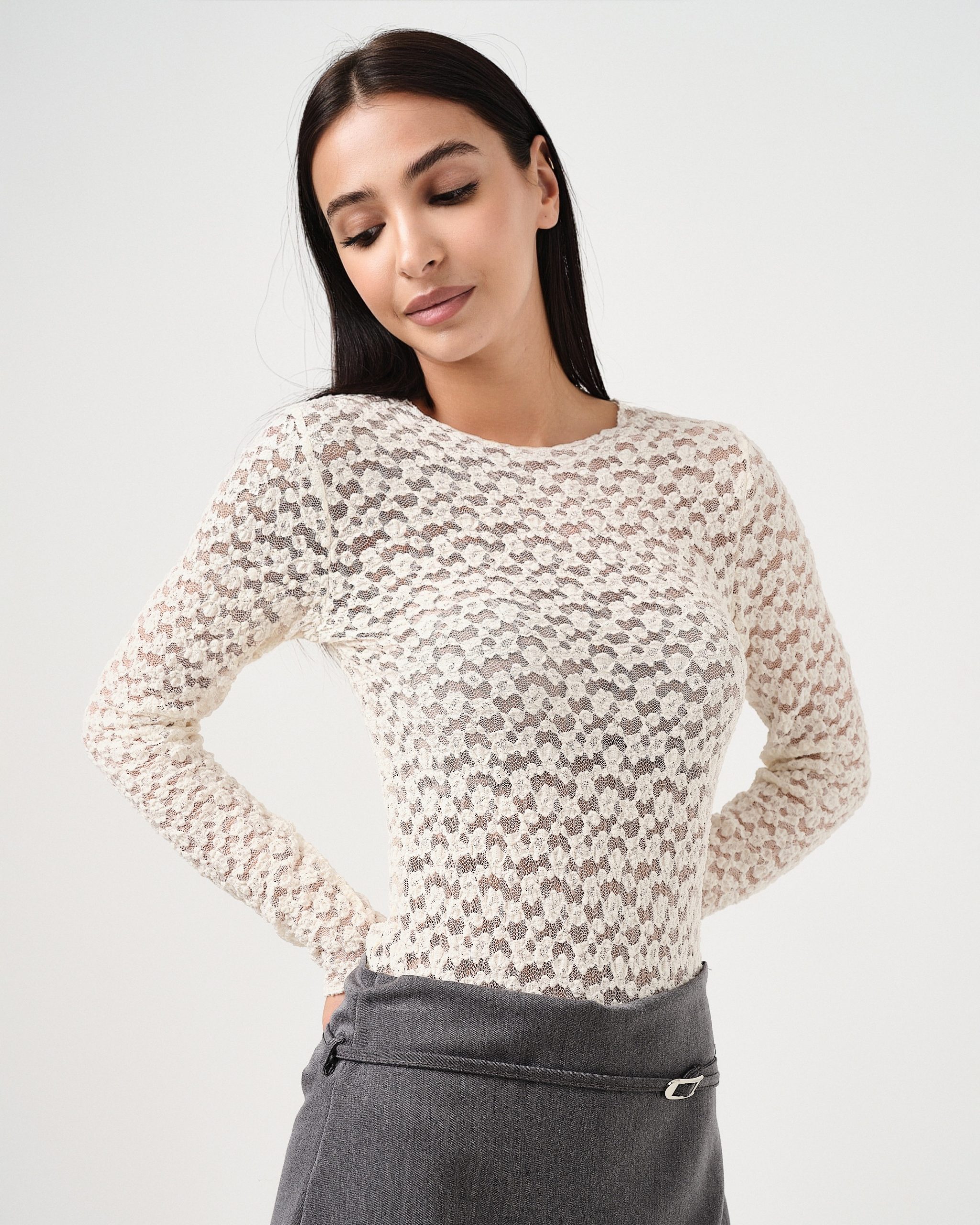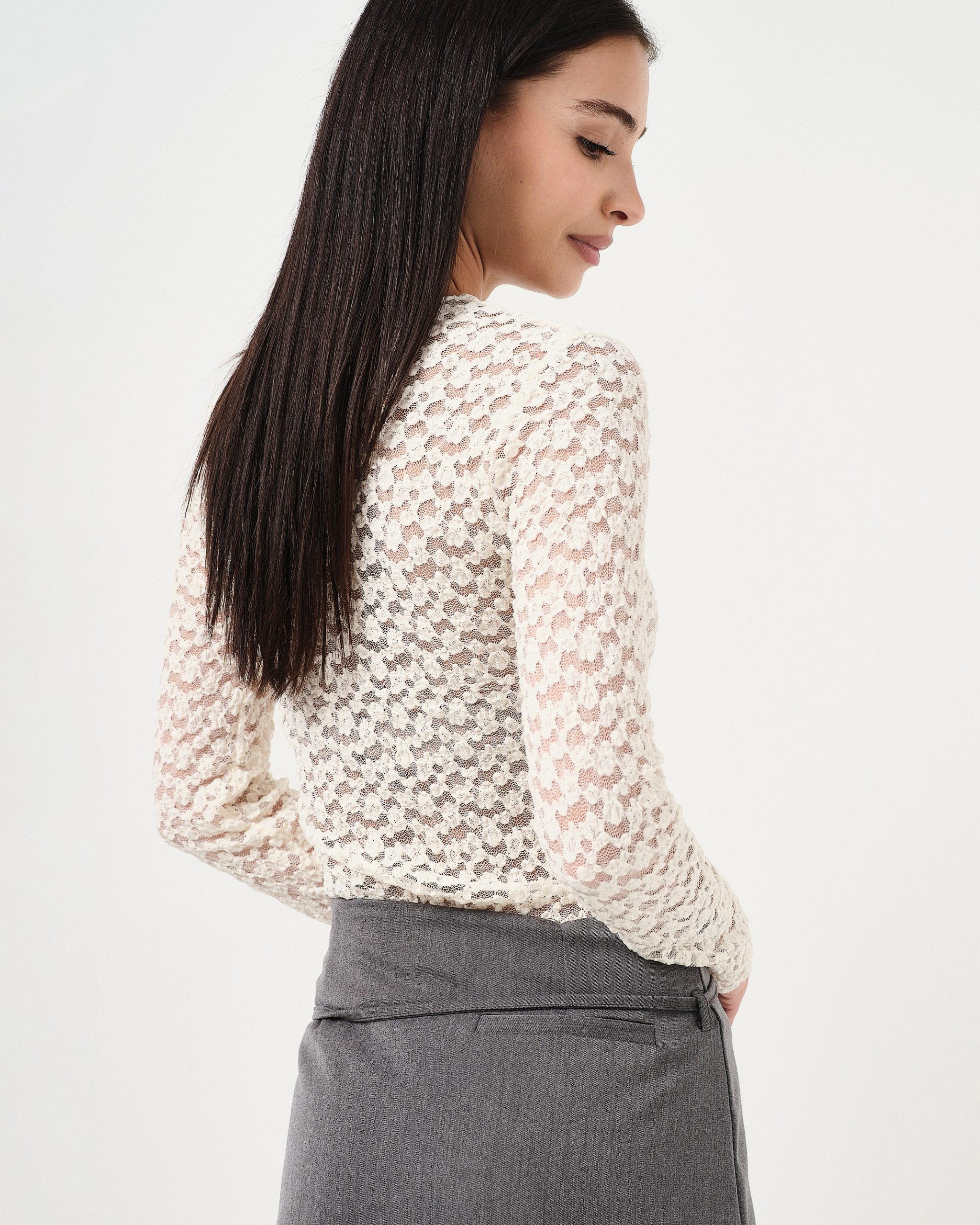 T-shirt slim fit a manica lunga girocollo in pizzo trasparente elasticizzato.