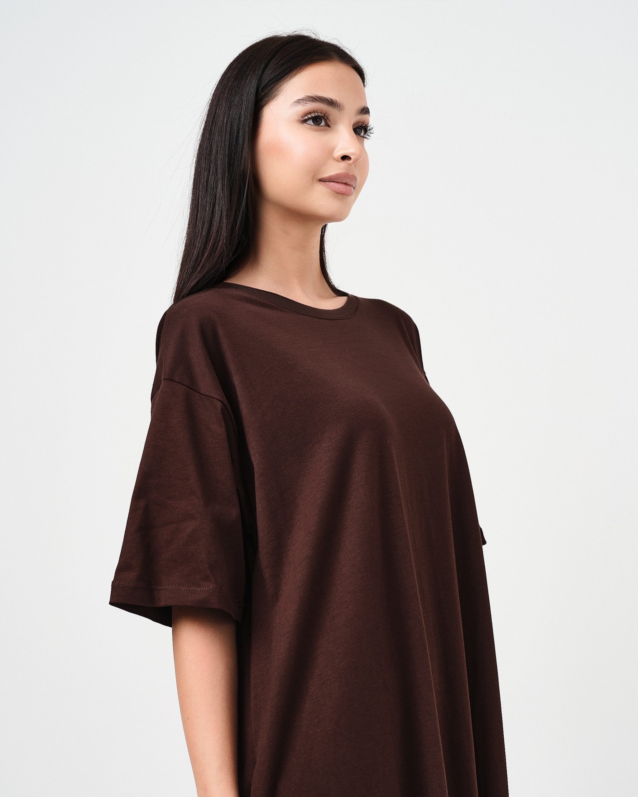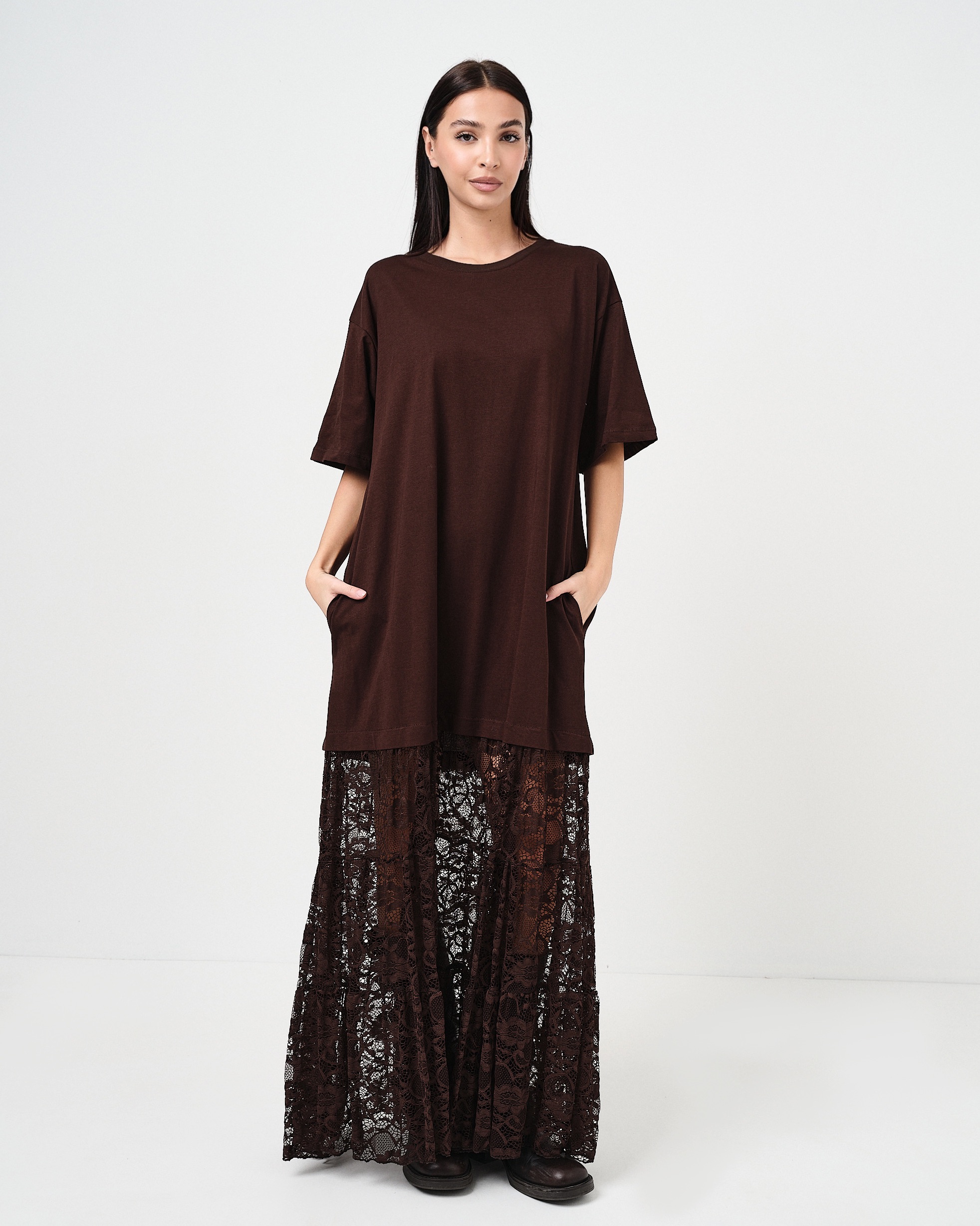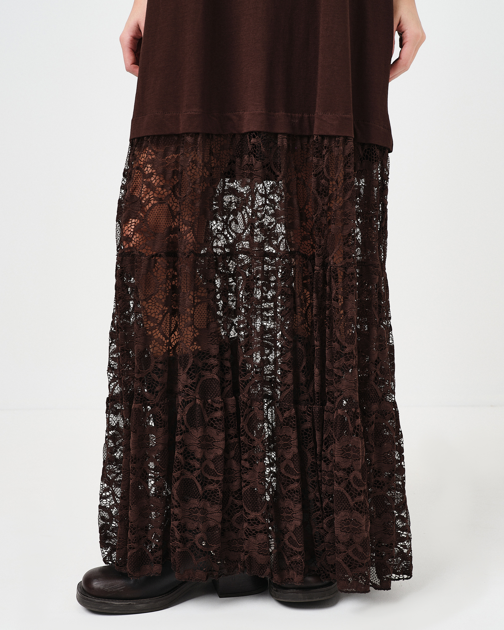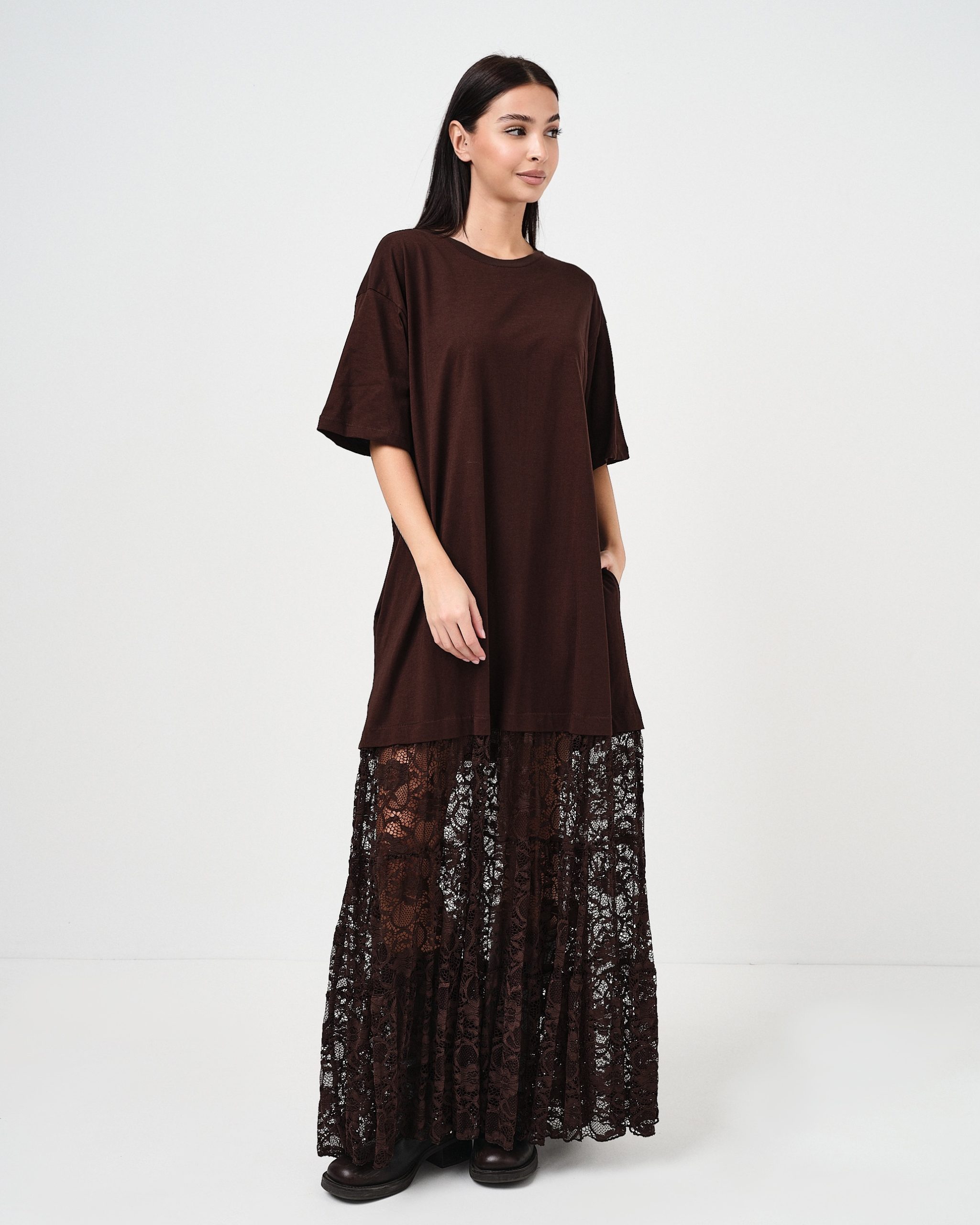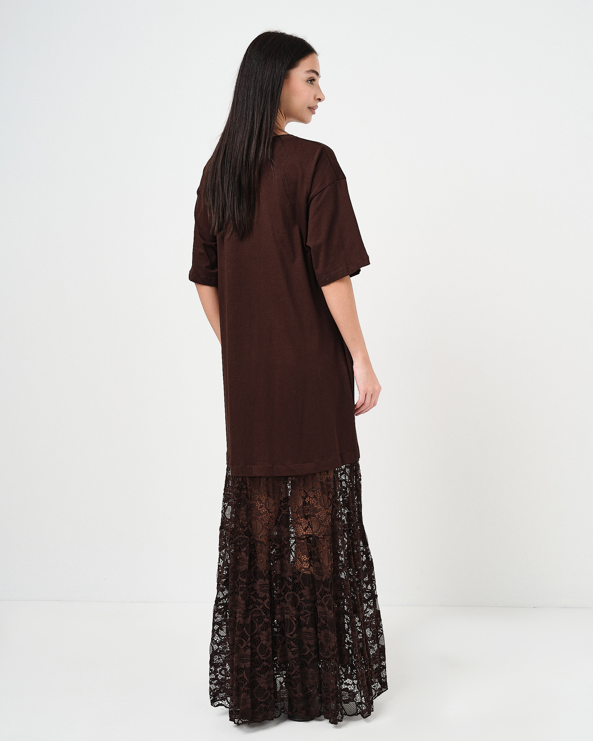 Abito lungo a mezza manica con fondo a balze in pizzo.