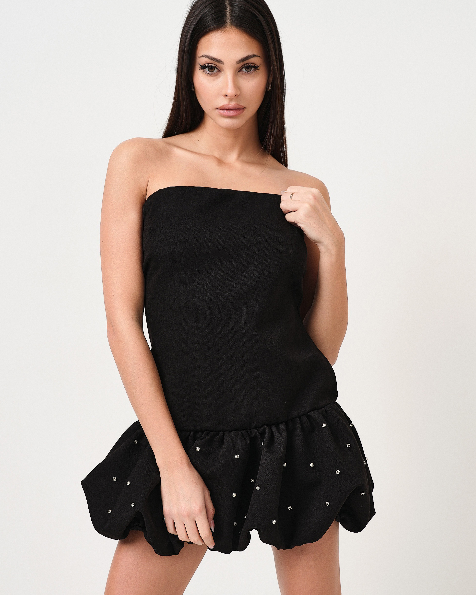 Mini dress con scollo a barchetta e fondo a palloncino con strass applicati.