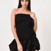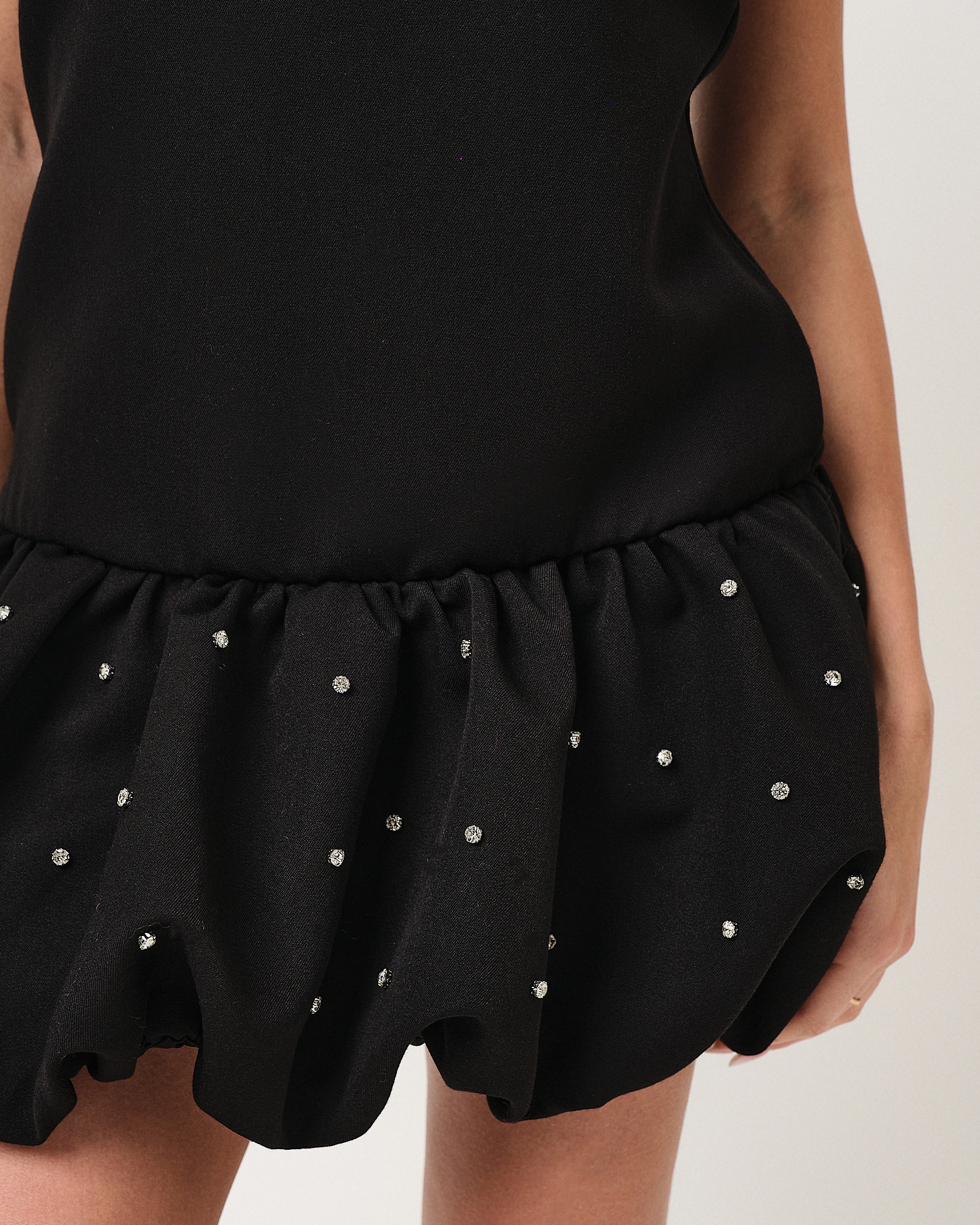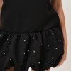 Mini dress con scollo a barchetta e fondo a palloncino con strass applicati.