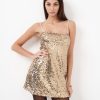 Mini abito elasticizzato con paillettes dorate e spalline sottili.