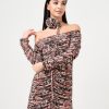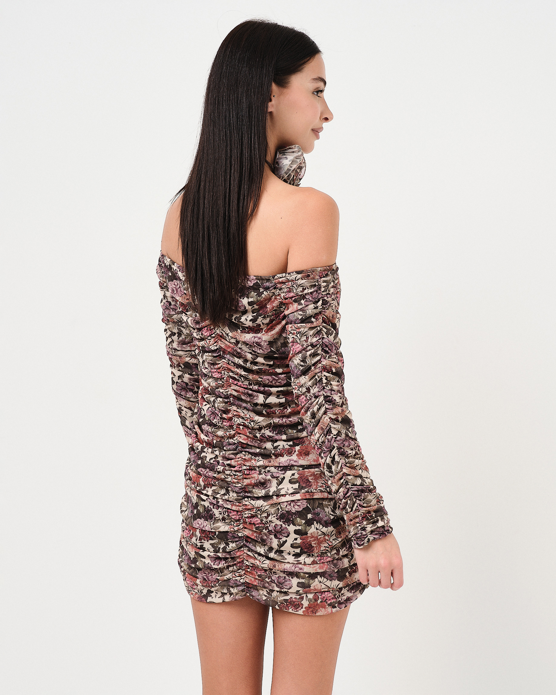 Mini abito in tulle elasticizzato con scollo a barchetta e accessorio.