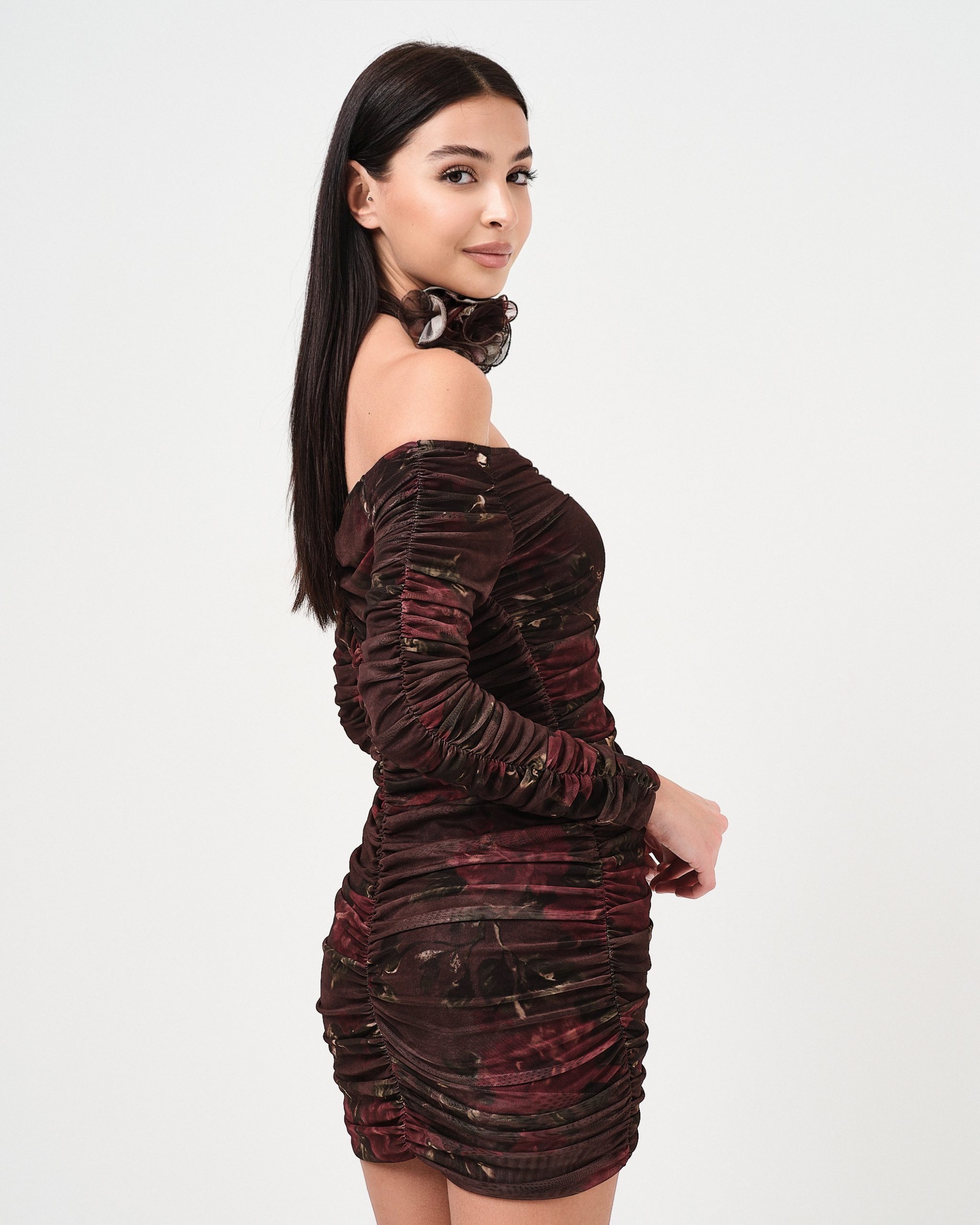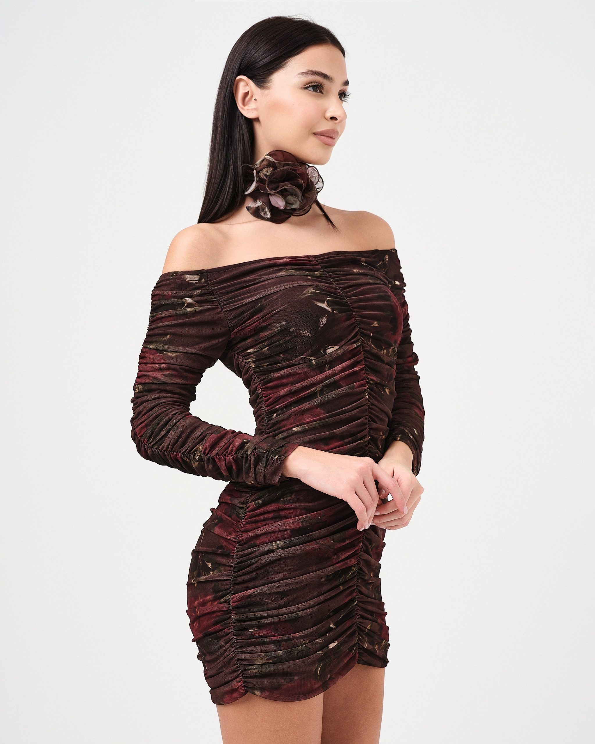 Mini abito in tulle elasticizzato con scollo a barchetta e accessorio.