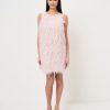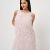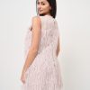 Abito smanicato con frange applicate e chiusura sul retro con bottoncino.