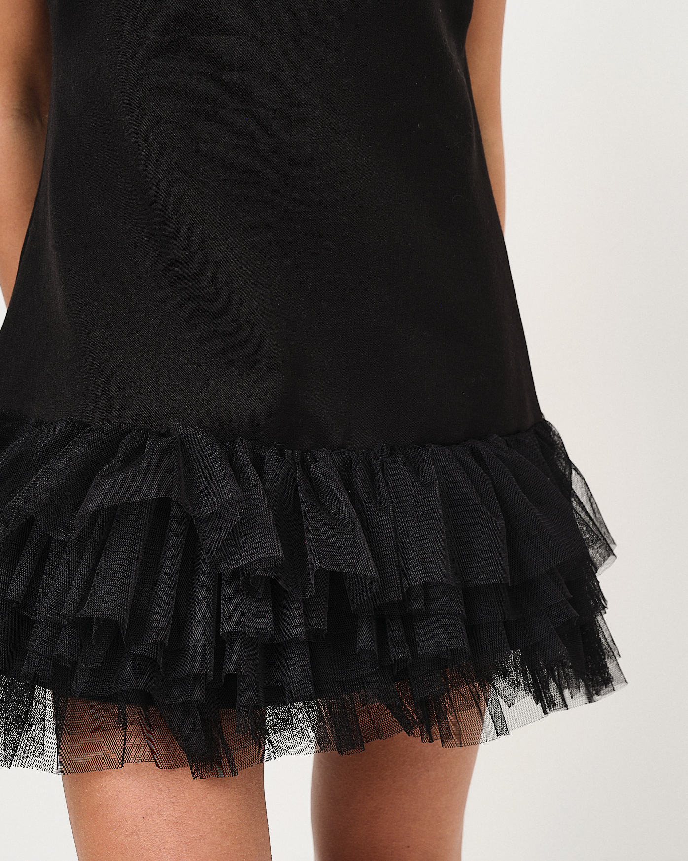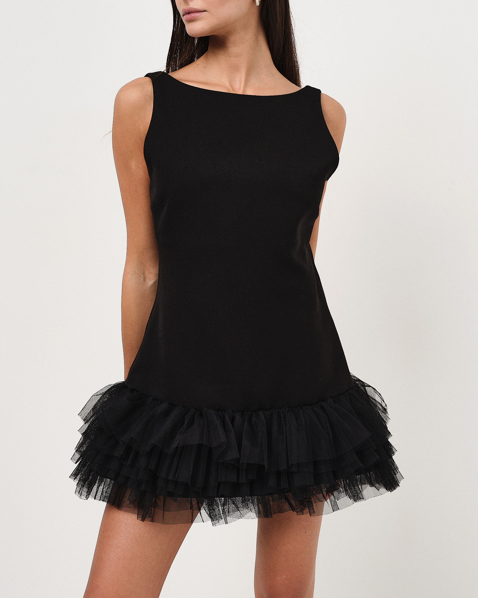 Mini abito strutturato con schiena scoperta e doppia balza in tulle.