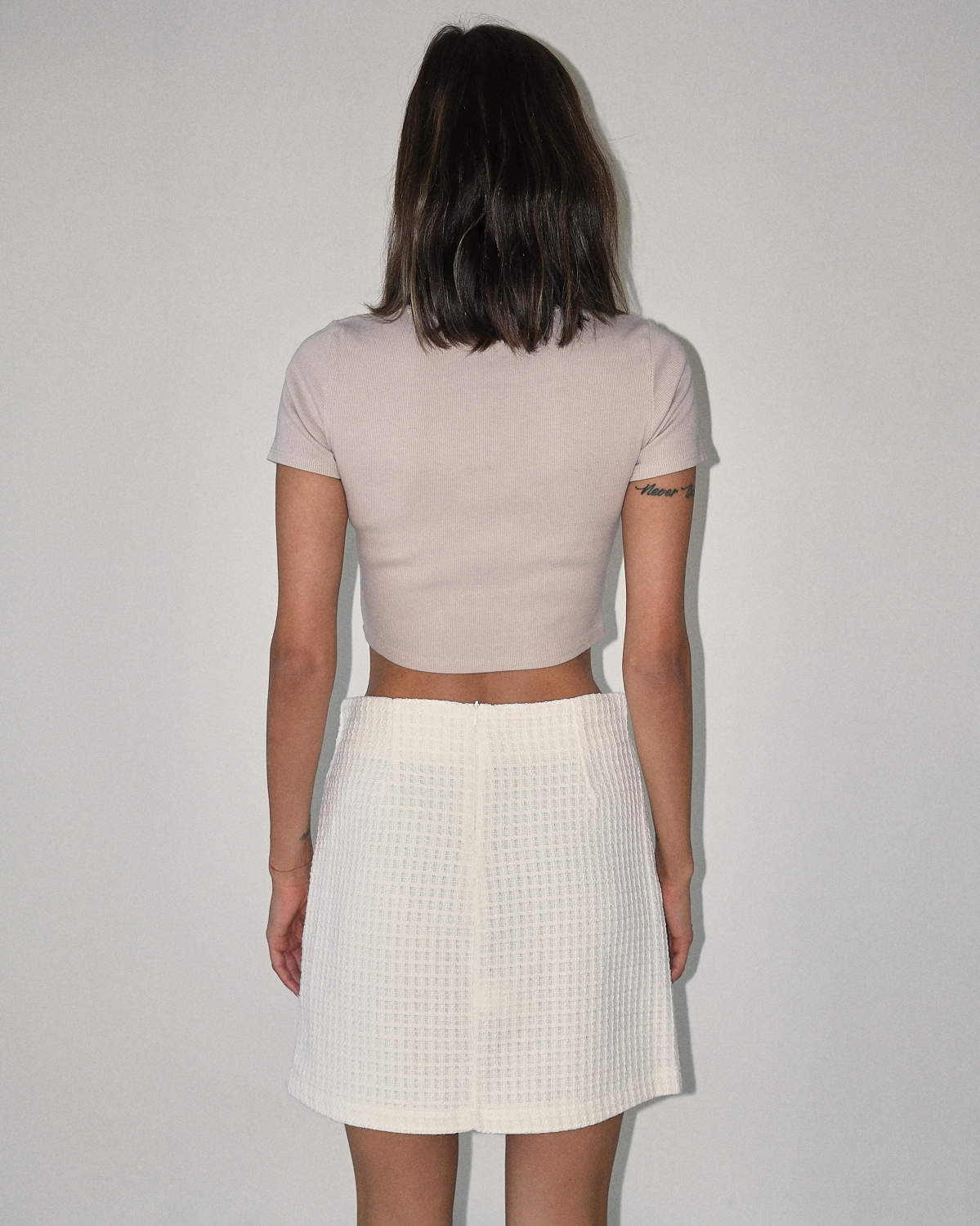 Minigonna in tessuto tweed con pence e zip di chiusura.