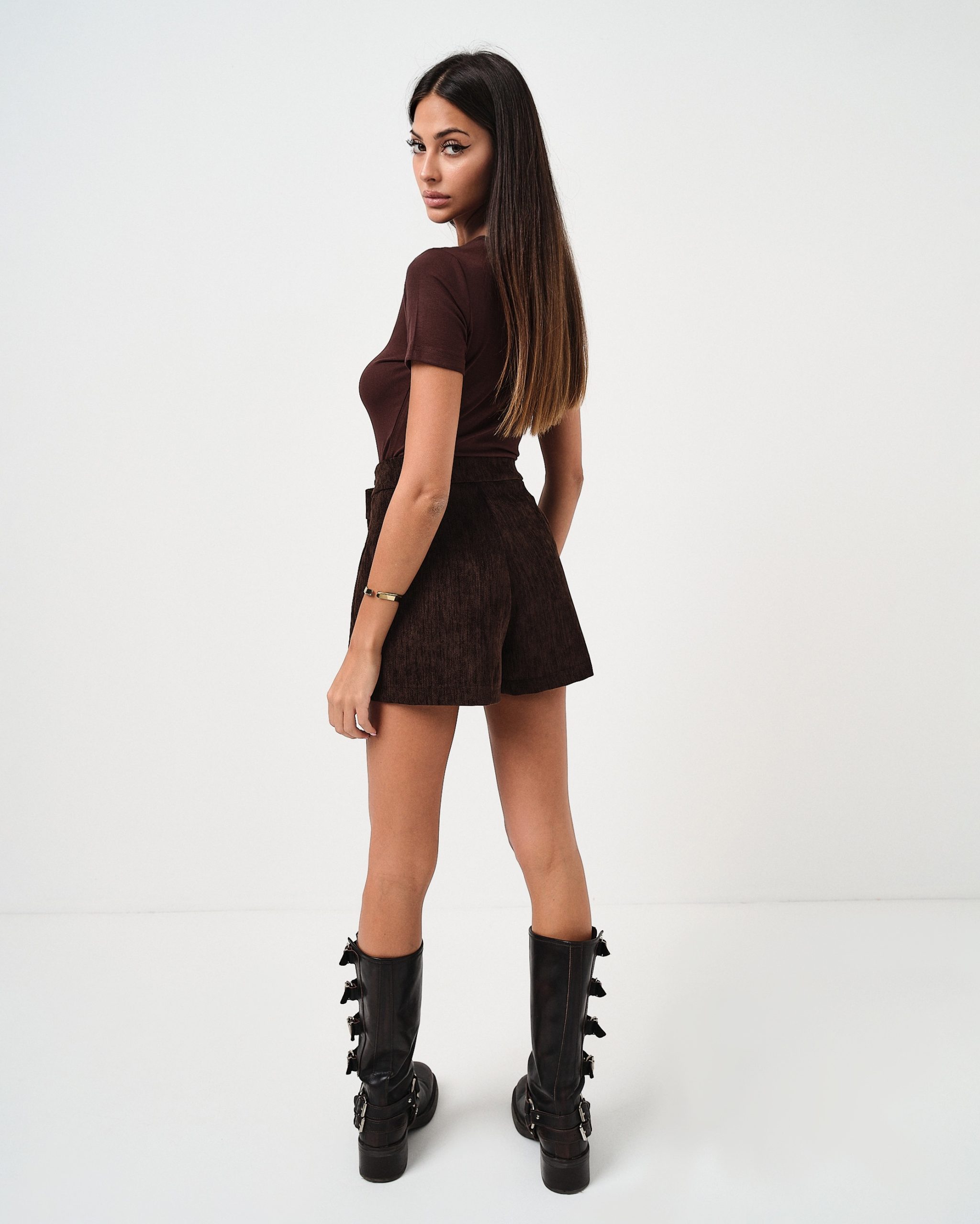 Minigonna pantaloncino effetto scamosciato con chiusura incrociata, tasche e zip laterale.