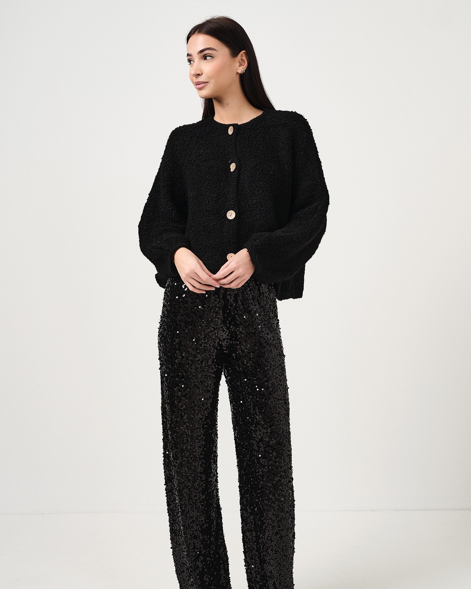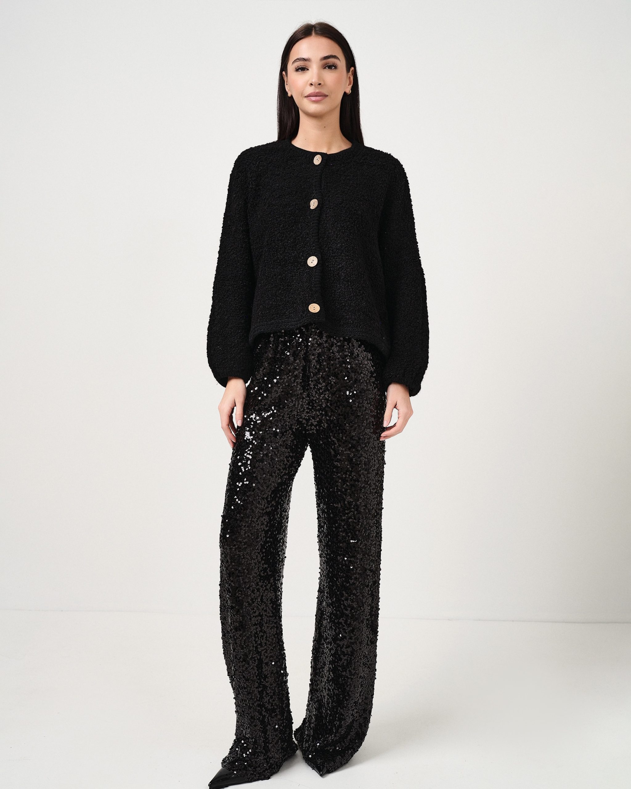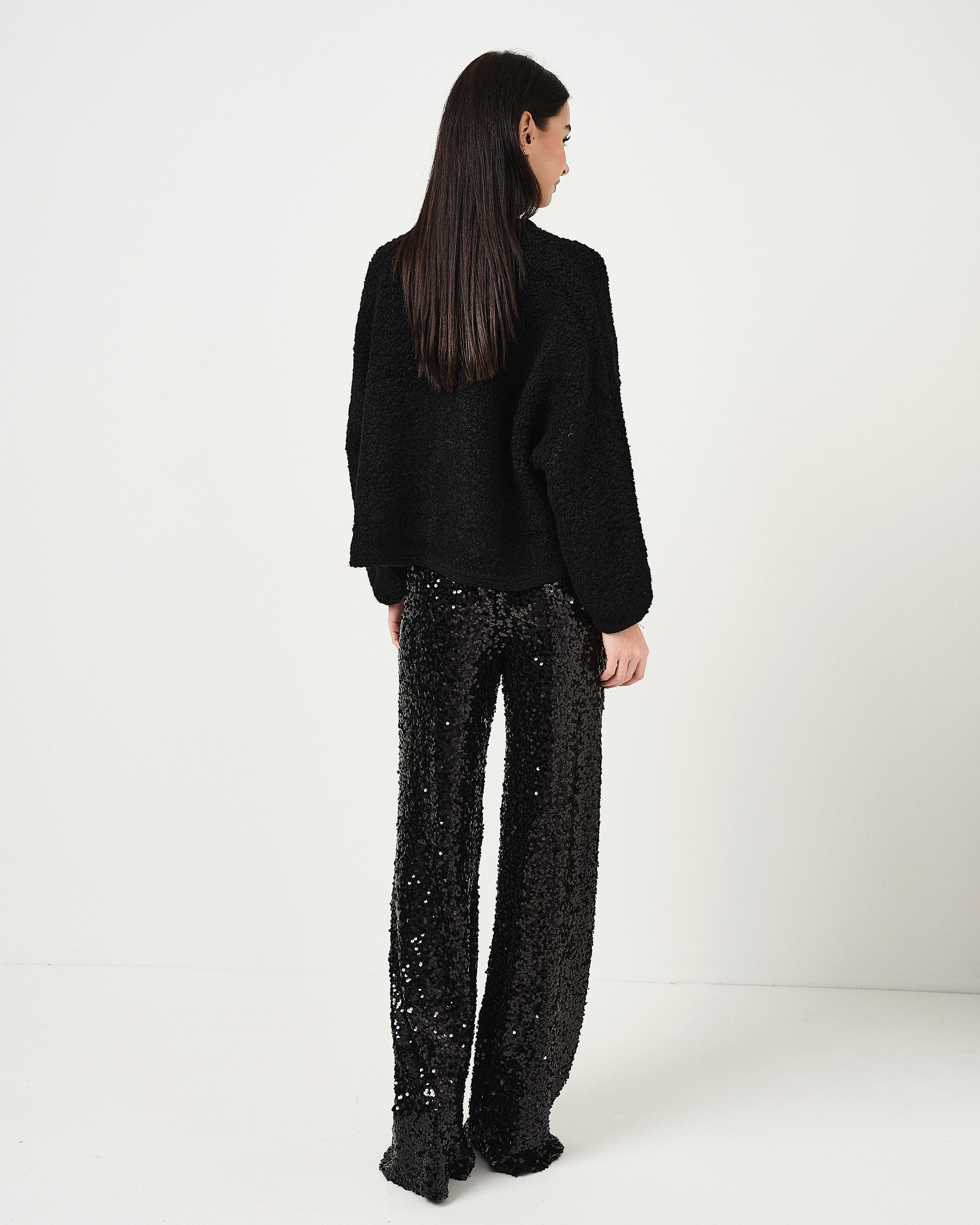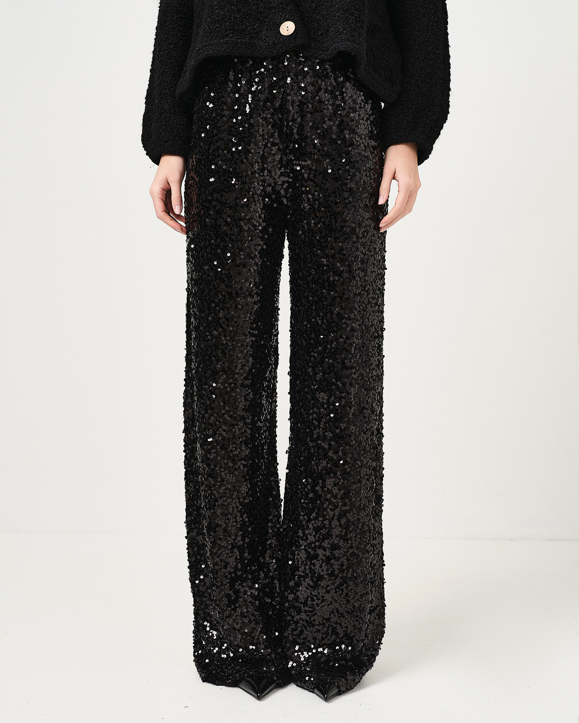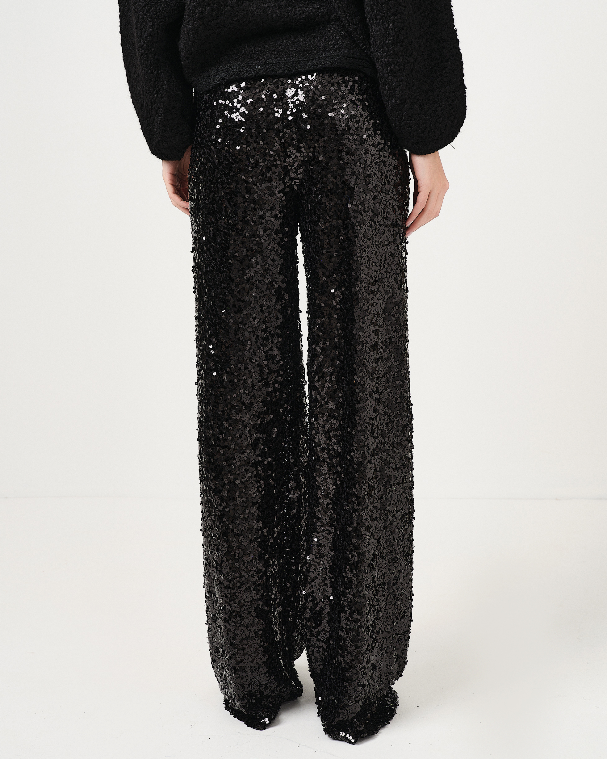 Pantalone a palazzo con paillettes ricamate ed elastico in vita.