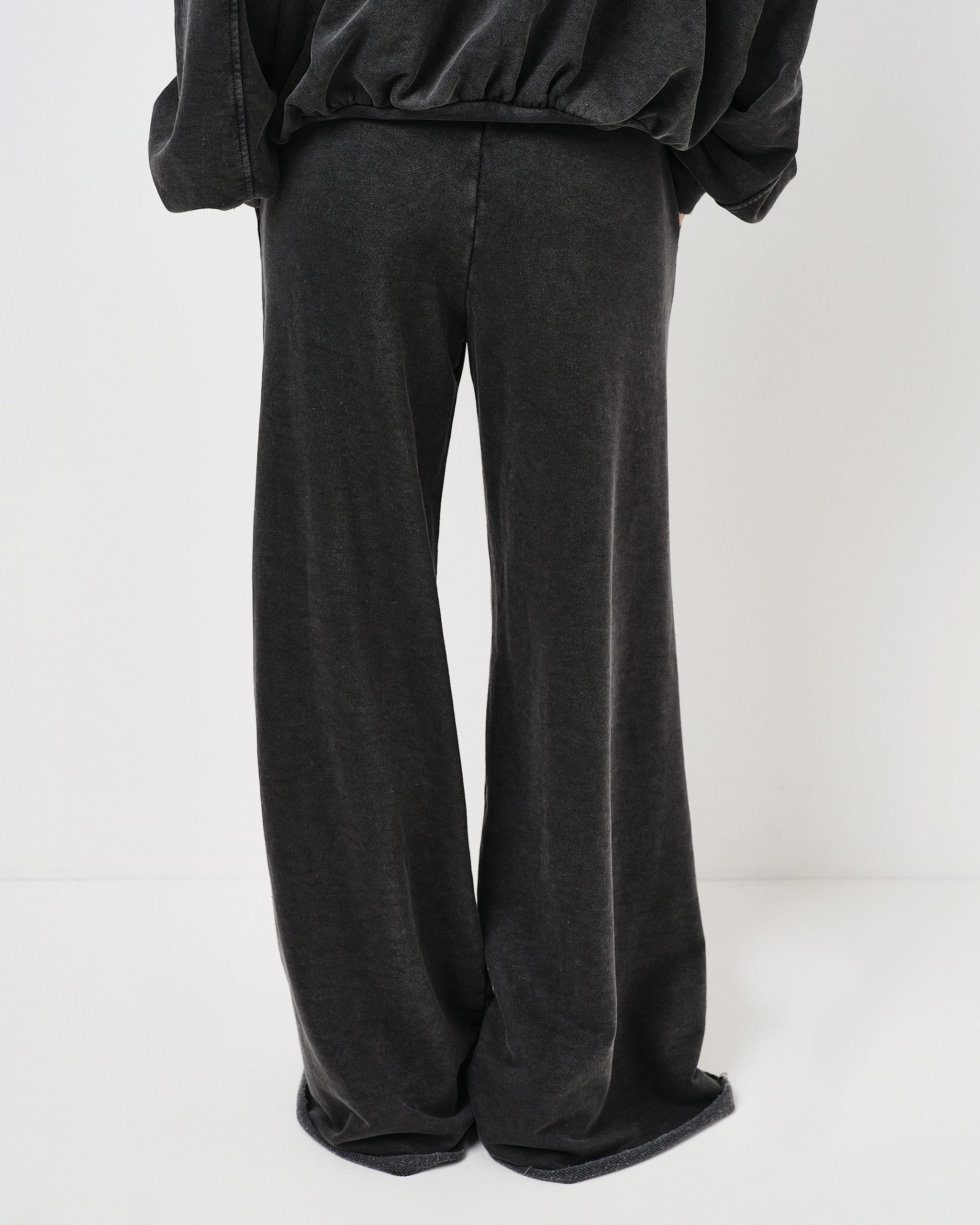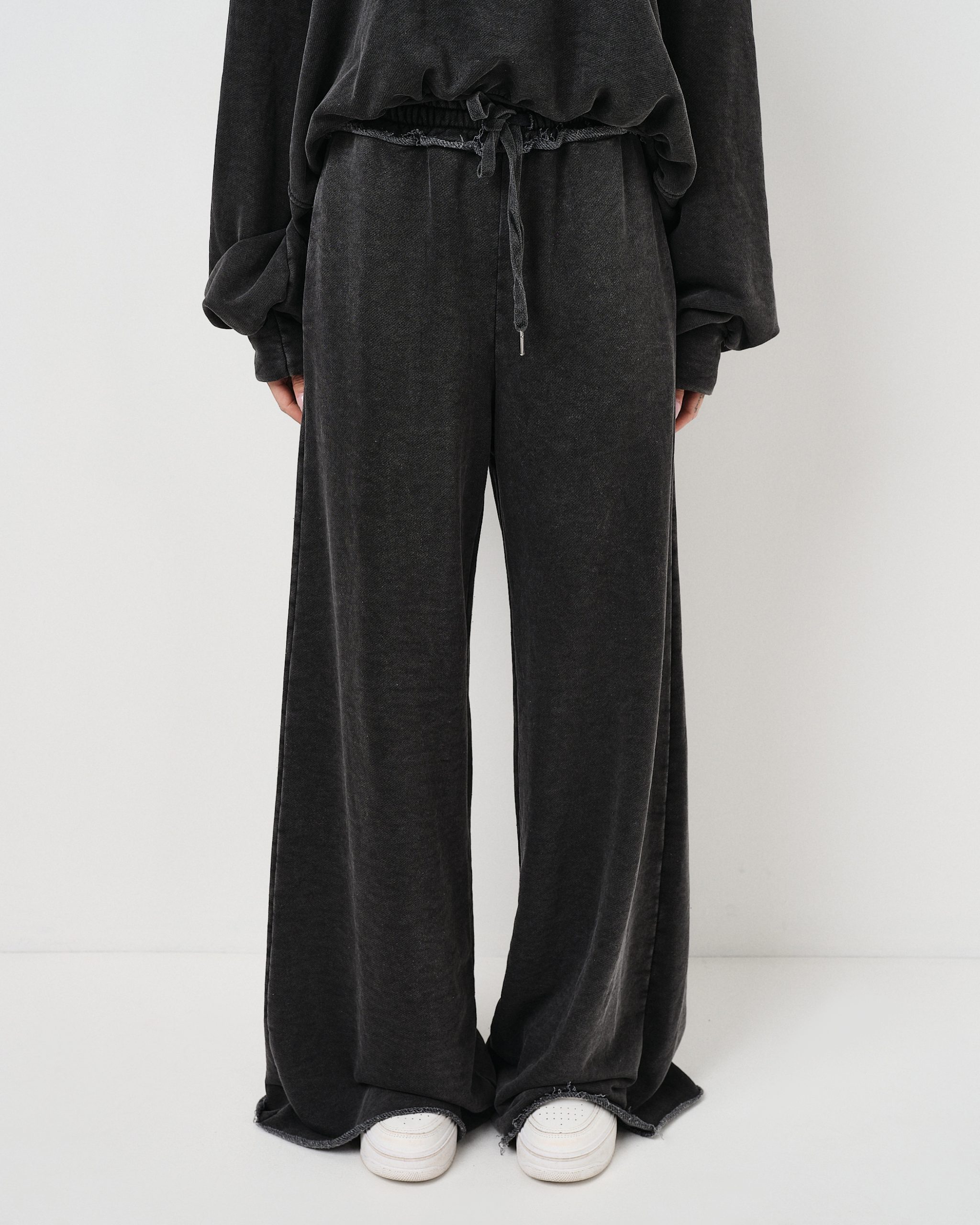 Pantalone della tuta invecchiato e tagliato a vivo, con elastico in vita e coulisse.