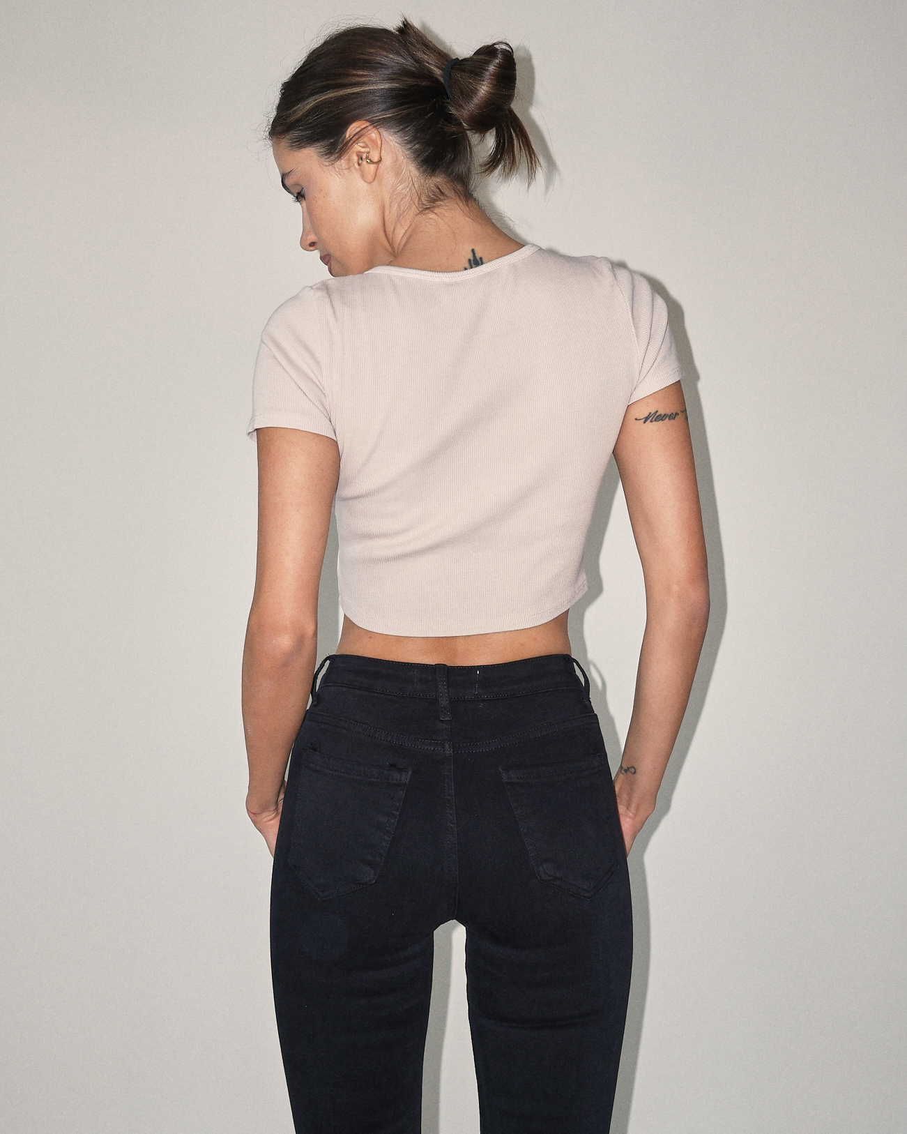 Pantalone in denim elasticizzato con fondo a trombetta sfrangiato.