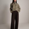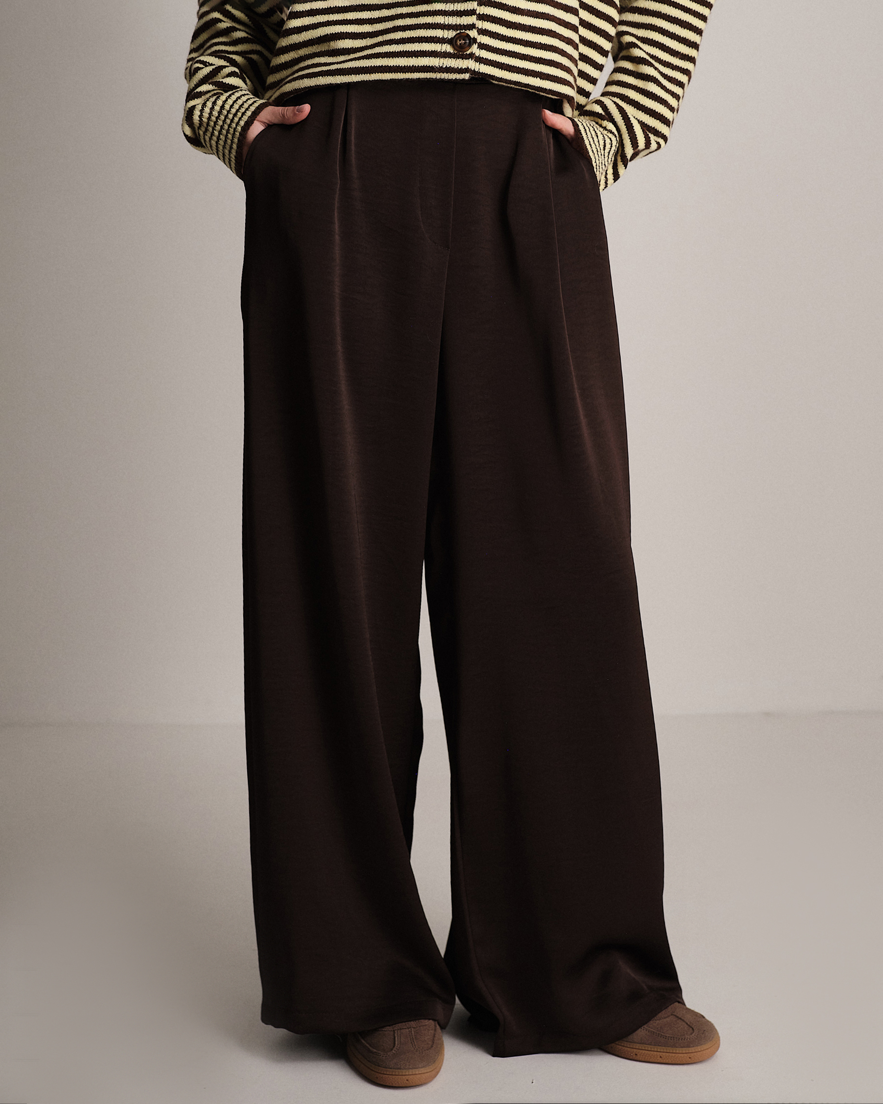 Pantalone morbido in raso con pence e tasche.