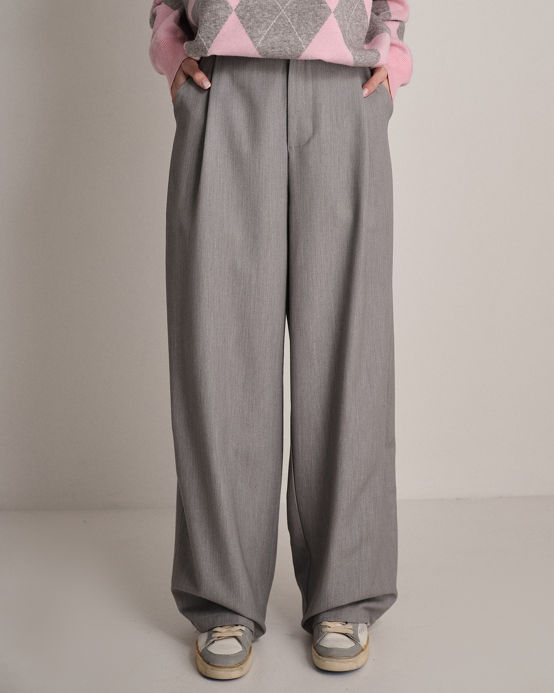 Pantalone ampio a vita alta con pence, tasche e fondo leggermente svasato.