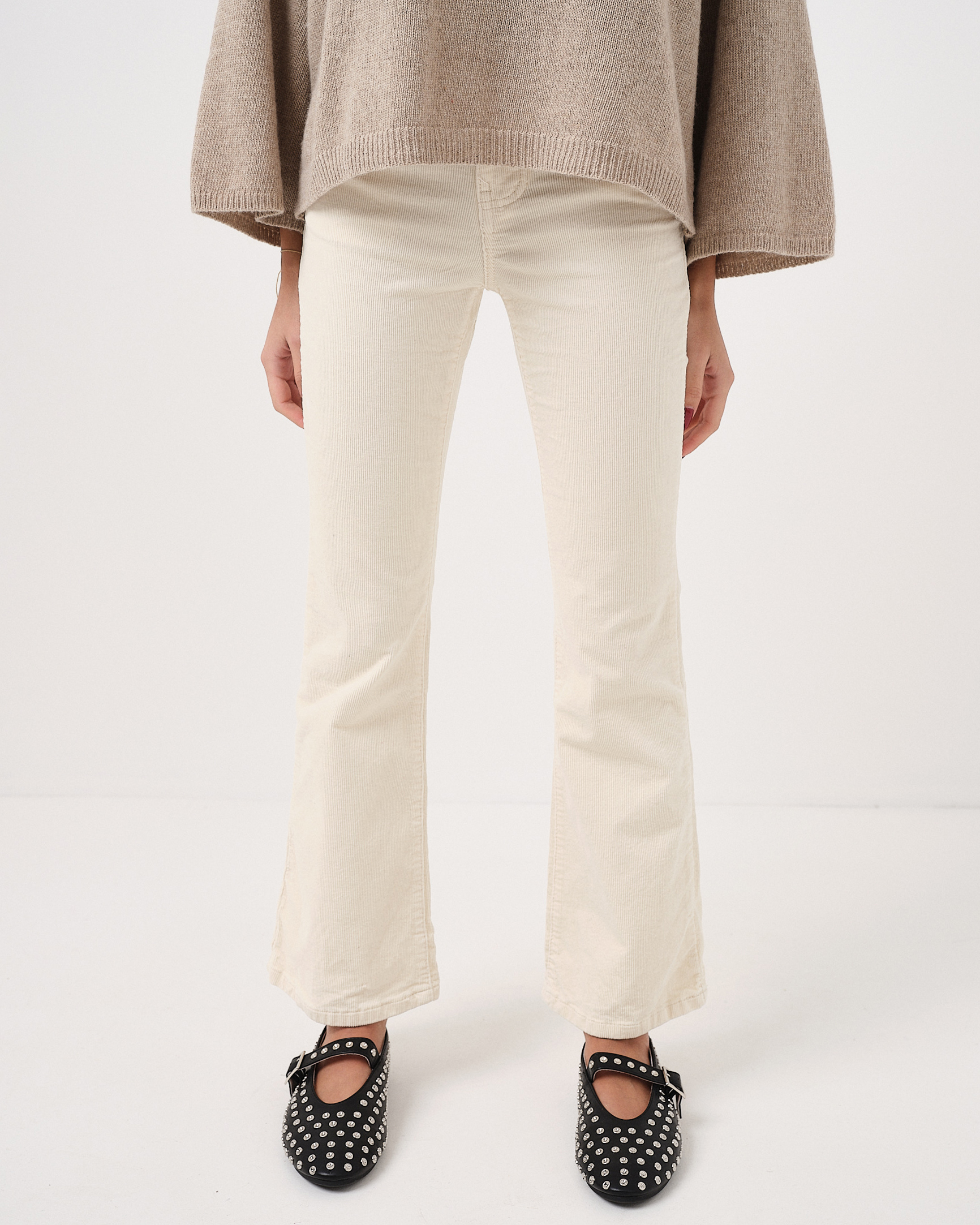 Pantalone flare elasticizzato a vita alta in velluto rigato con tasche.