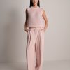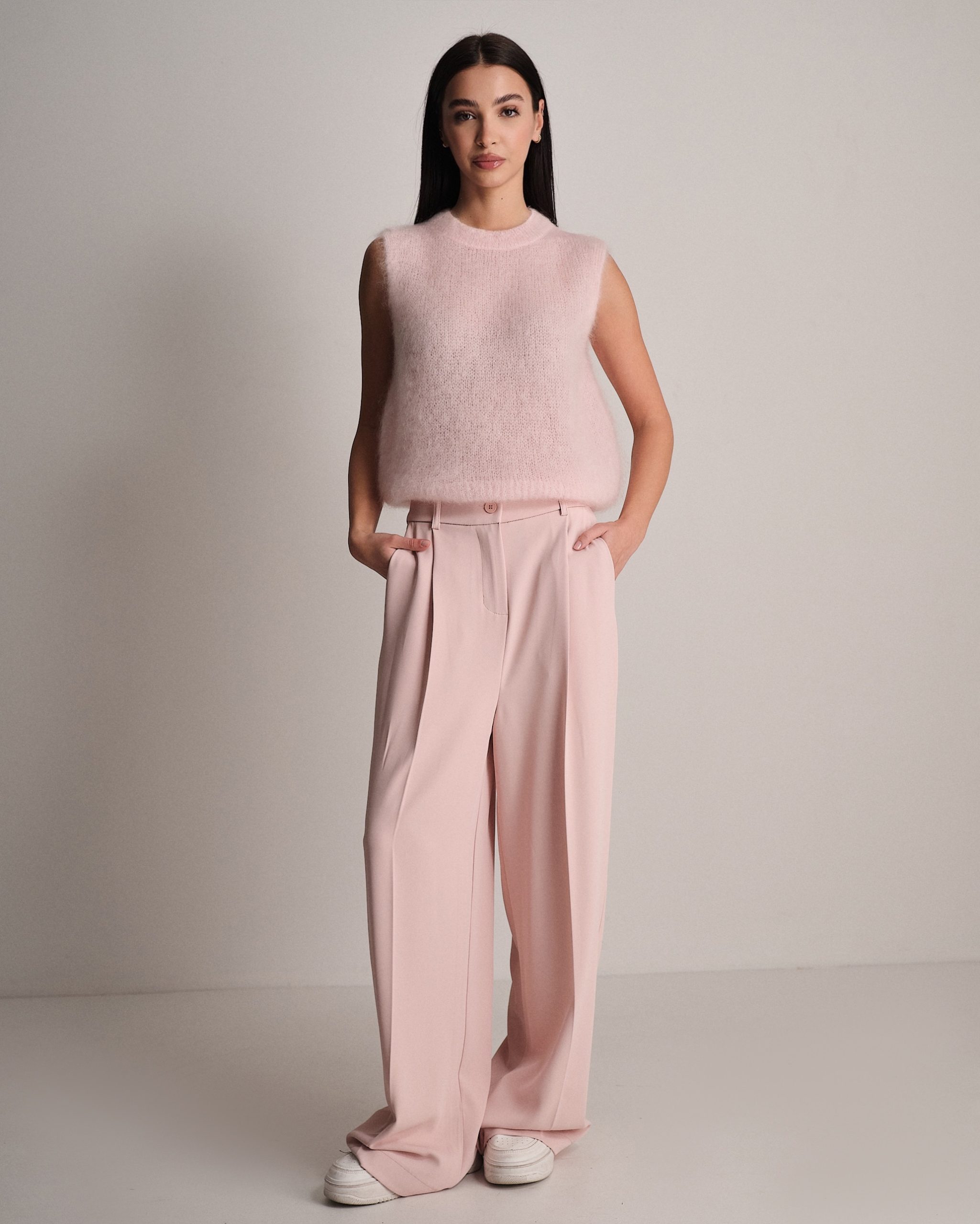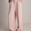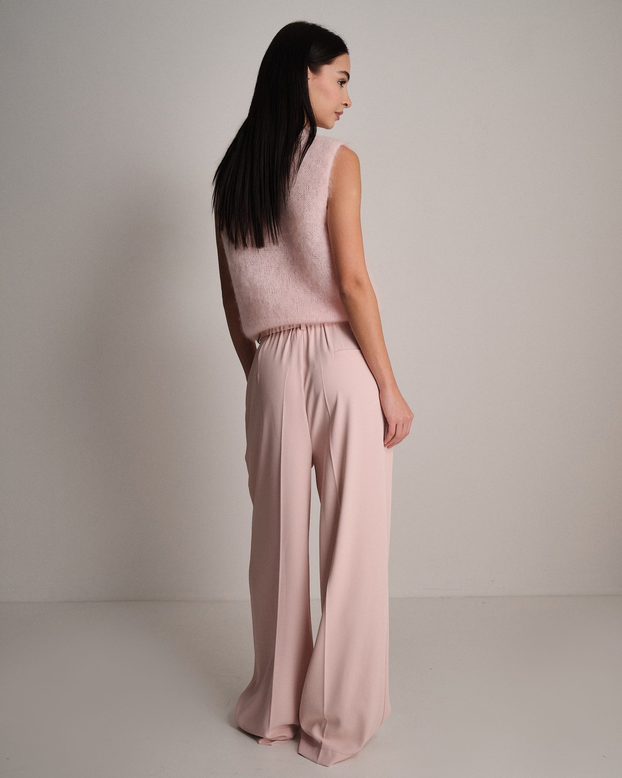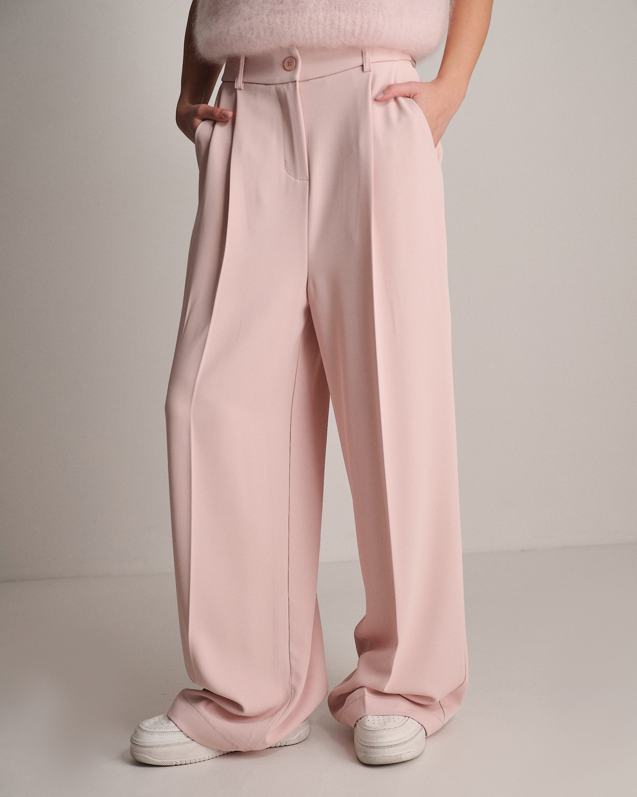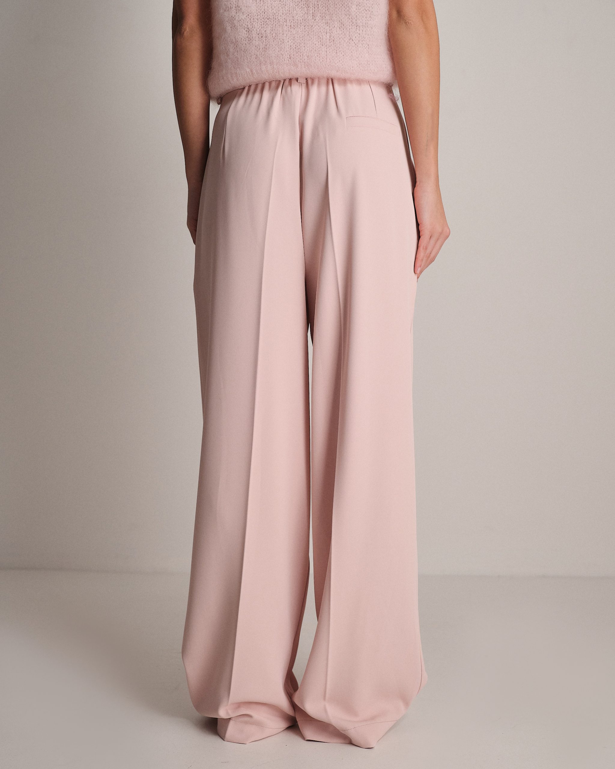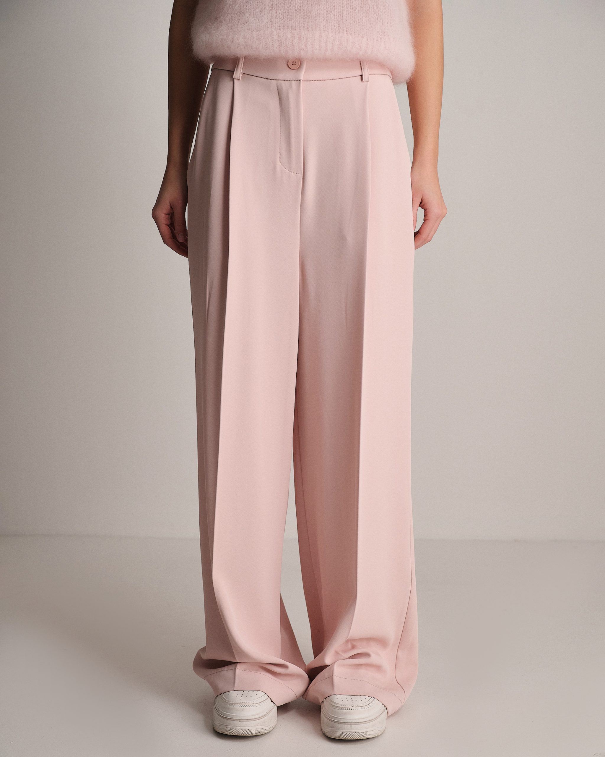Pantalone ampio in crepe con pence, passanti e bottone.