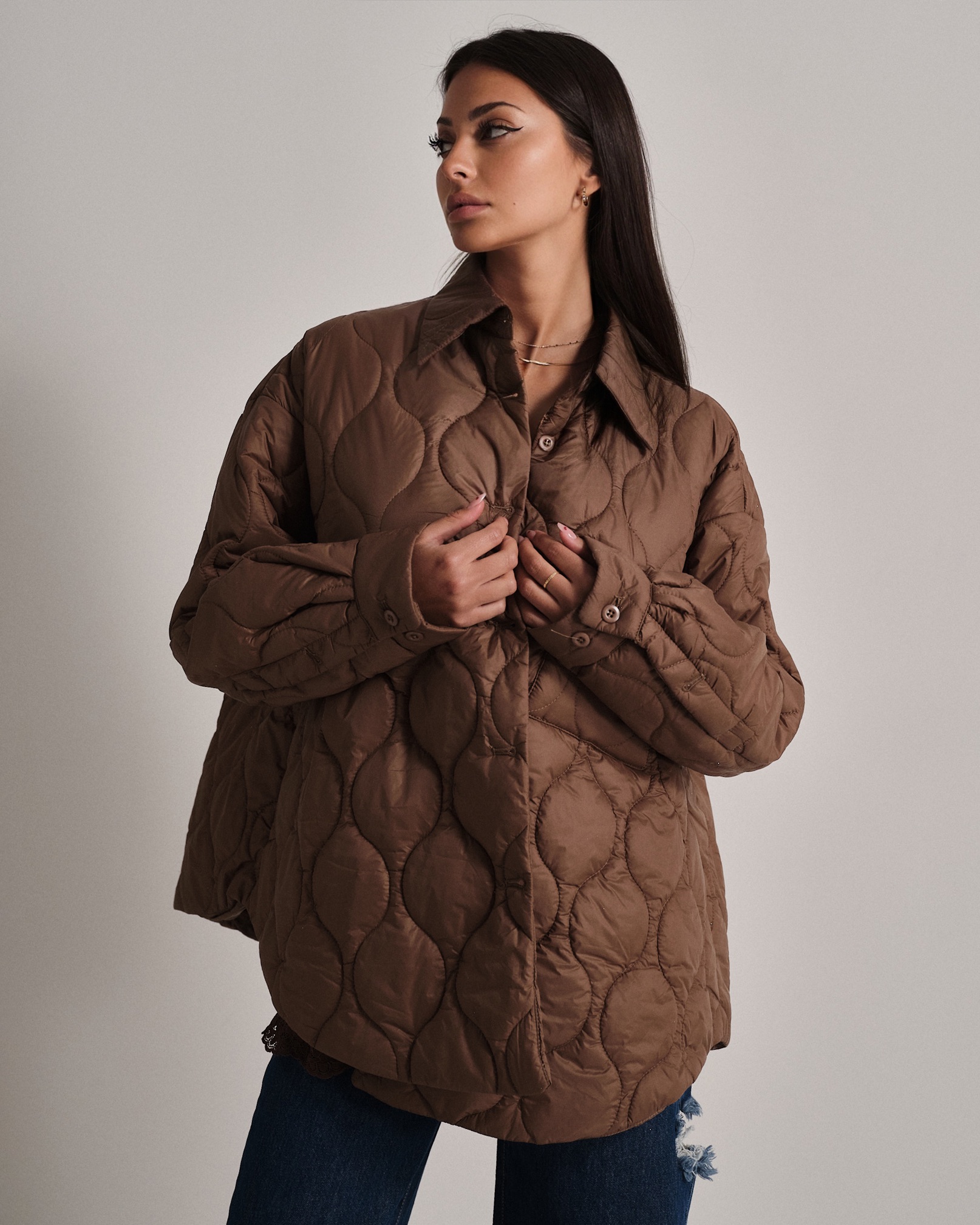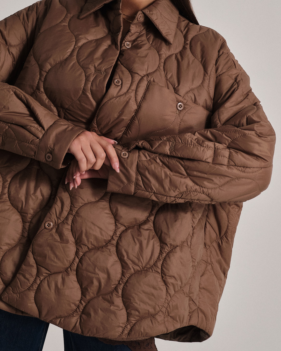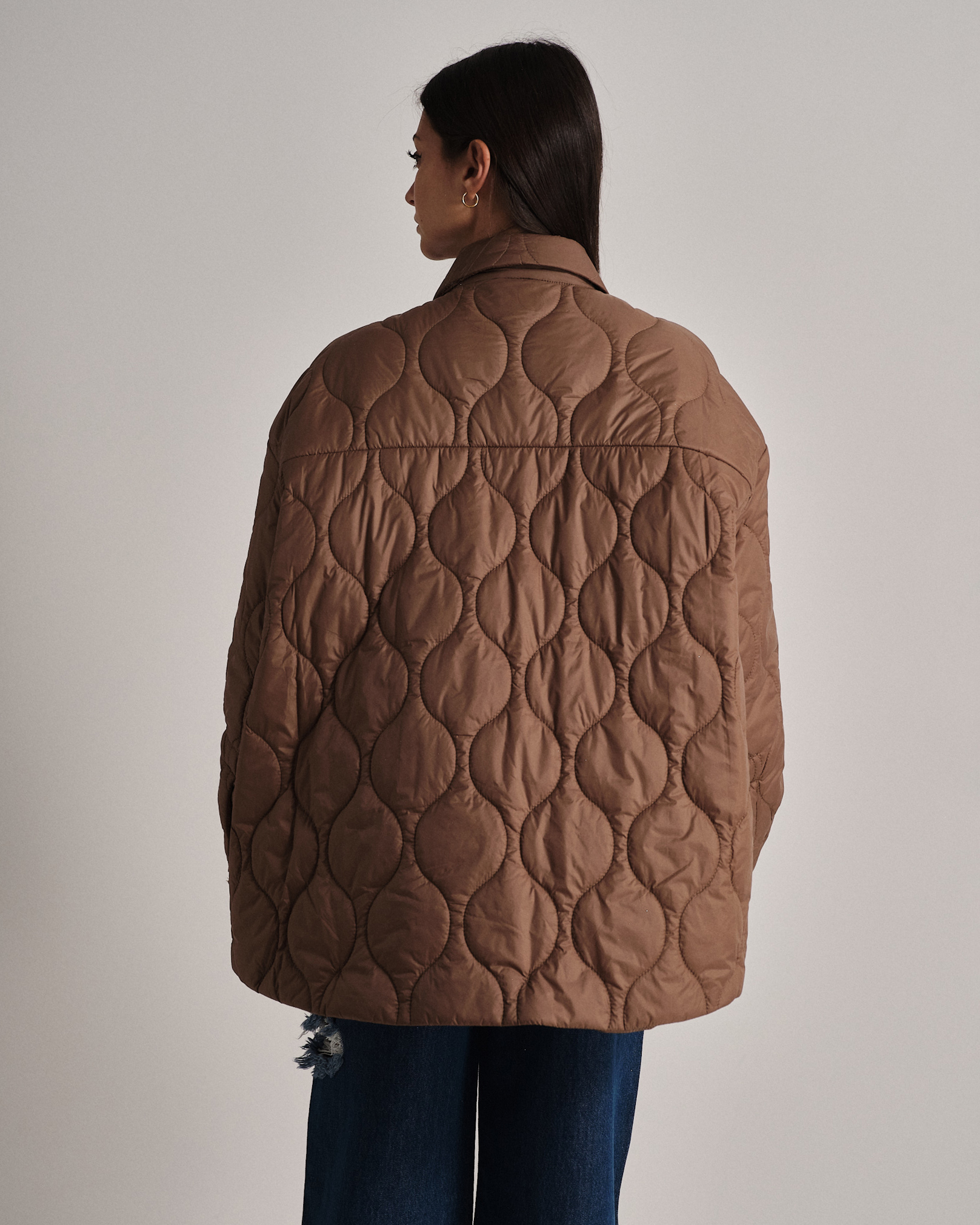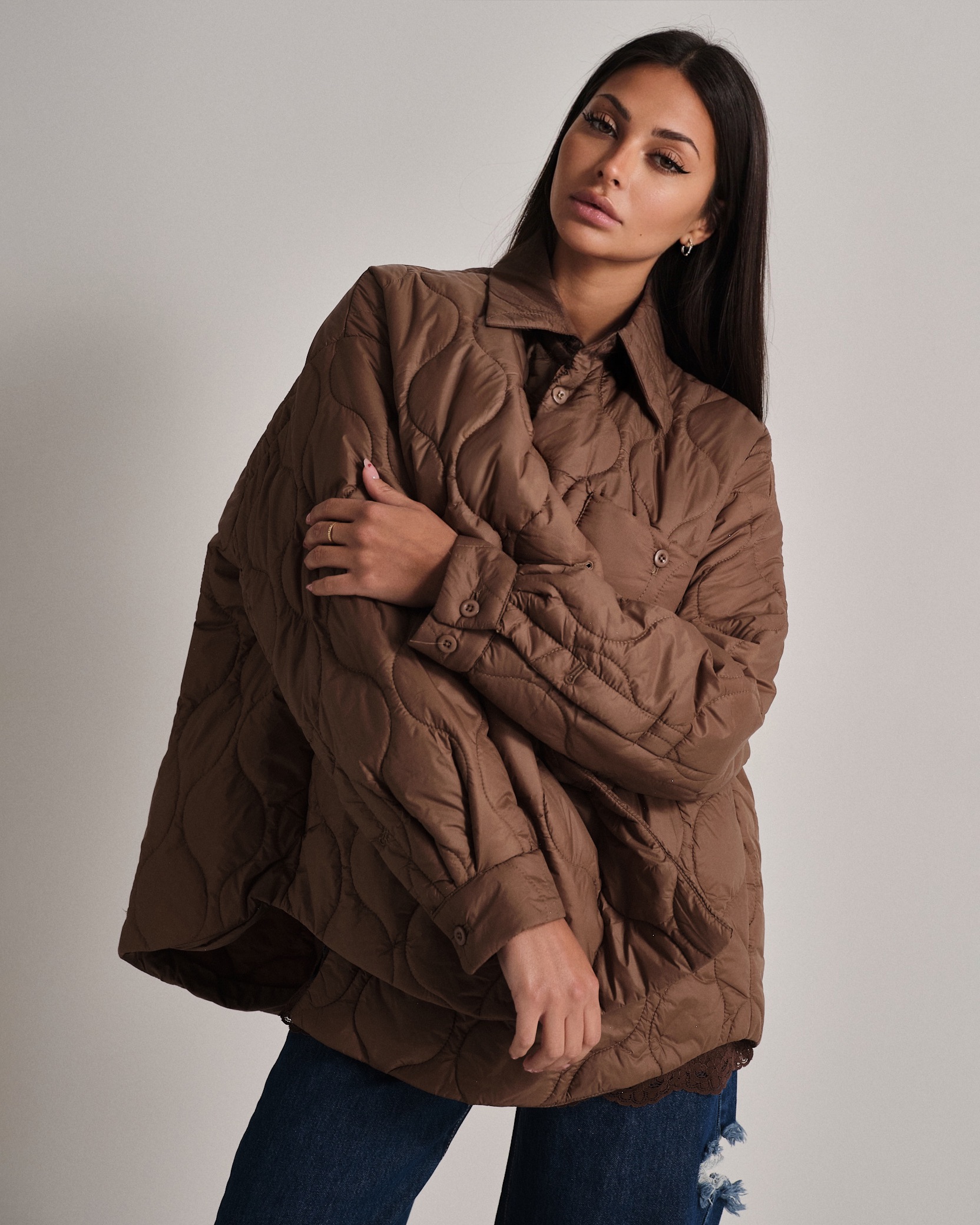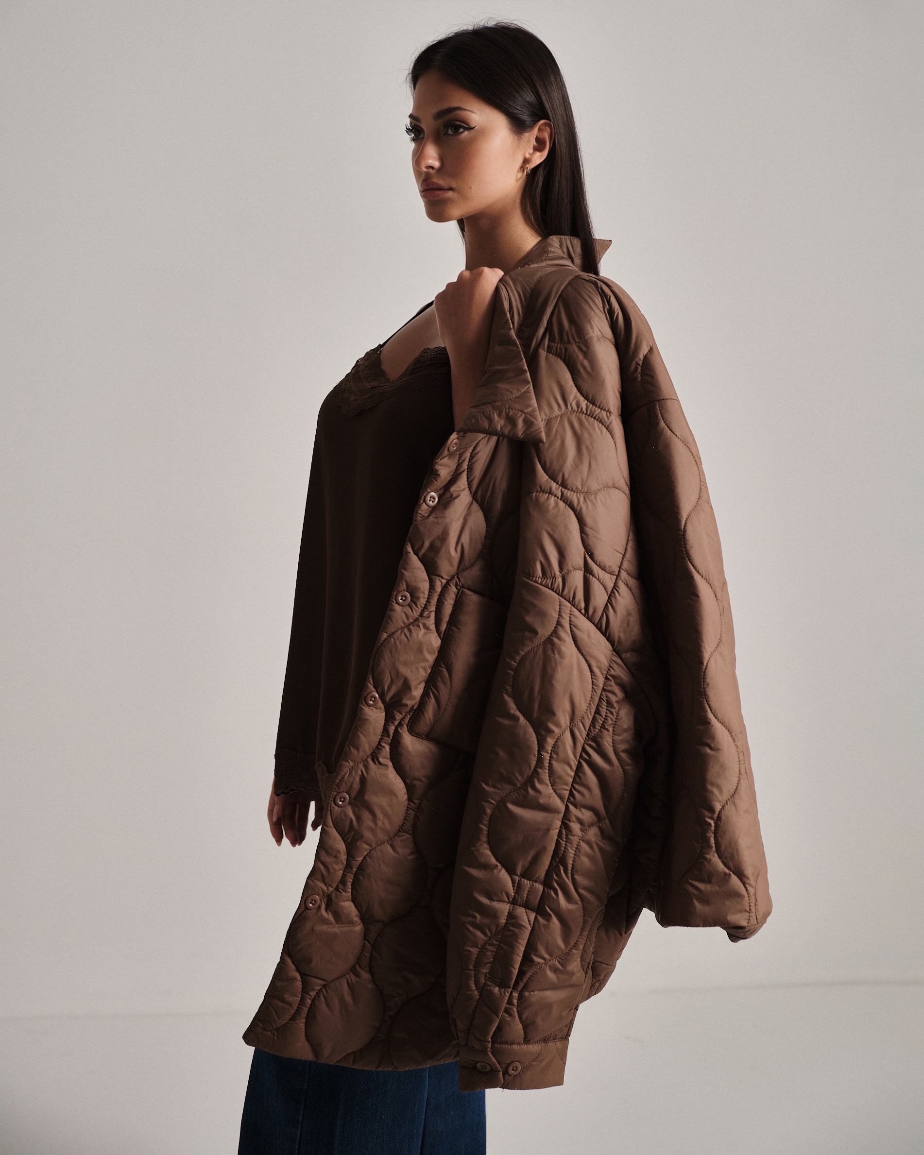 Piumino cento grammi oversize trapuntato con coulisse regolabile e bottoncini.