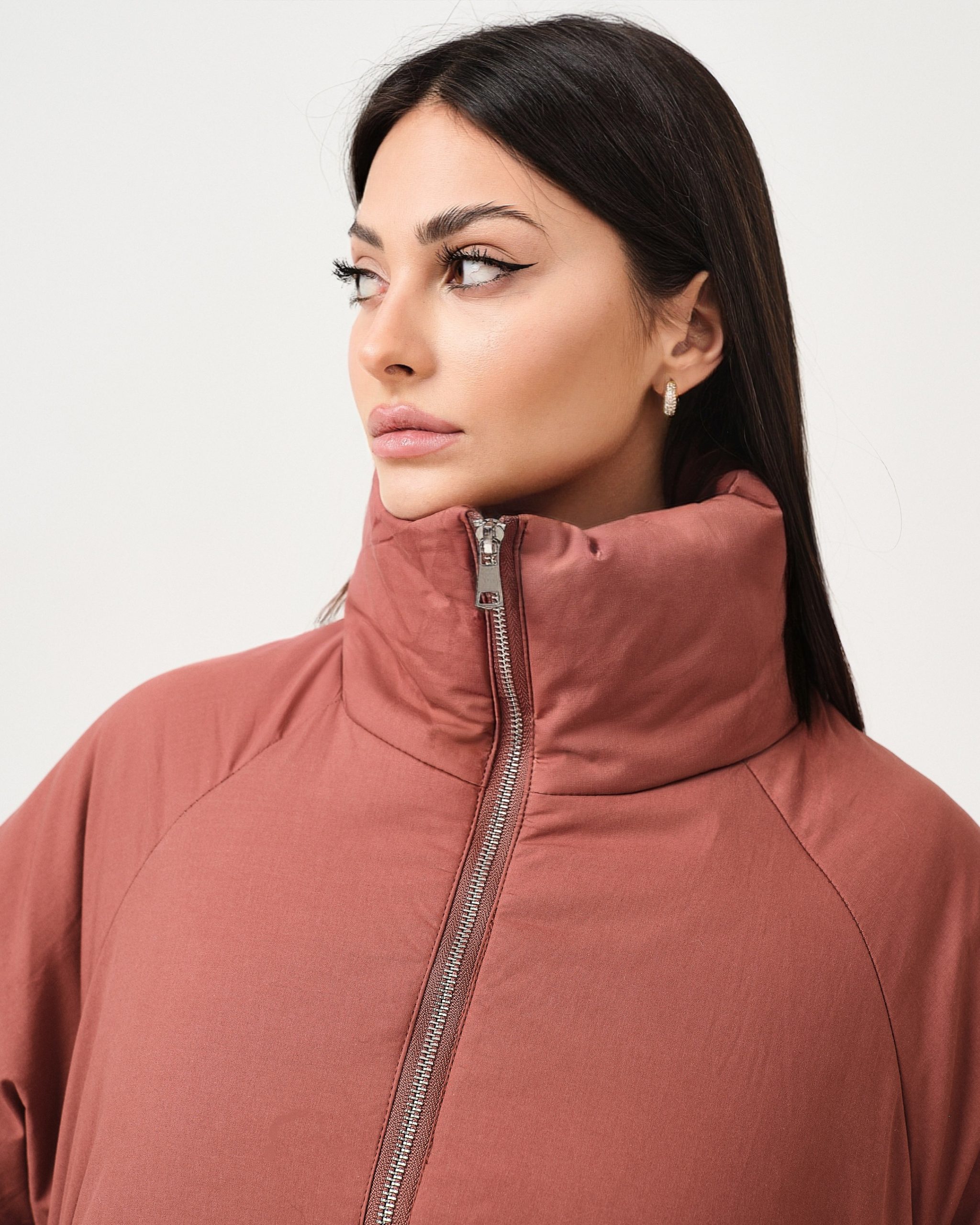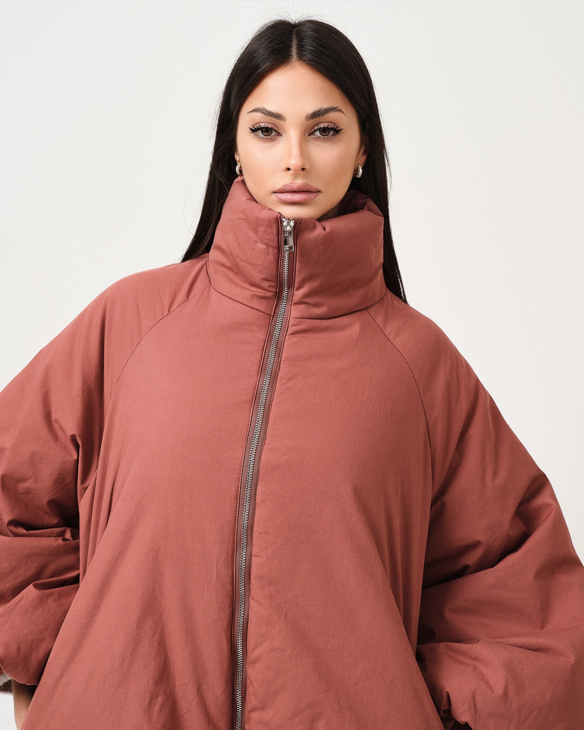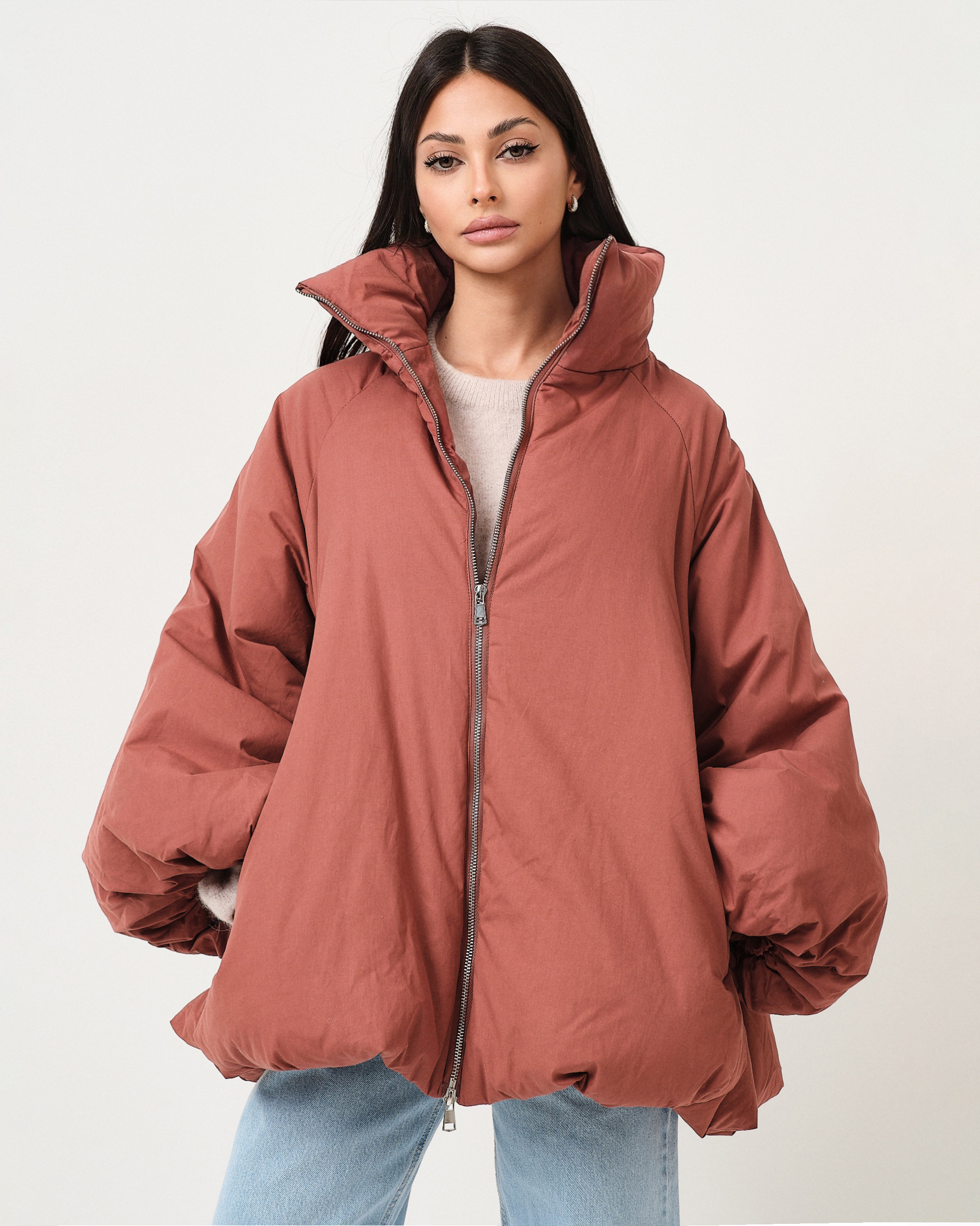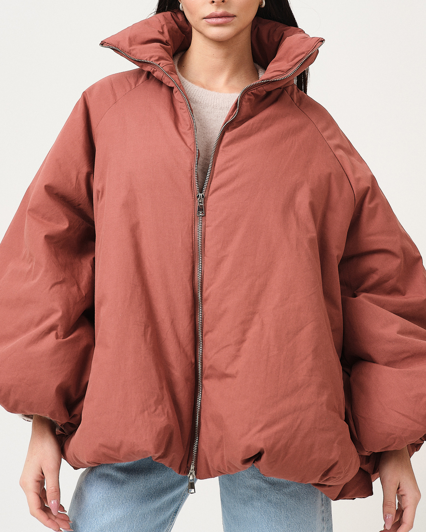 Piumino vestibilità oversize con maniche ampie e zip di chiusura.