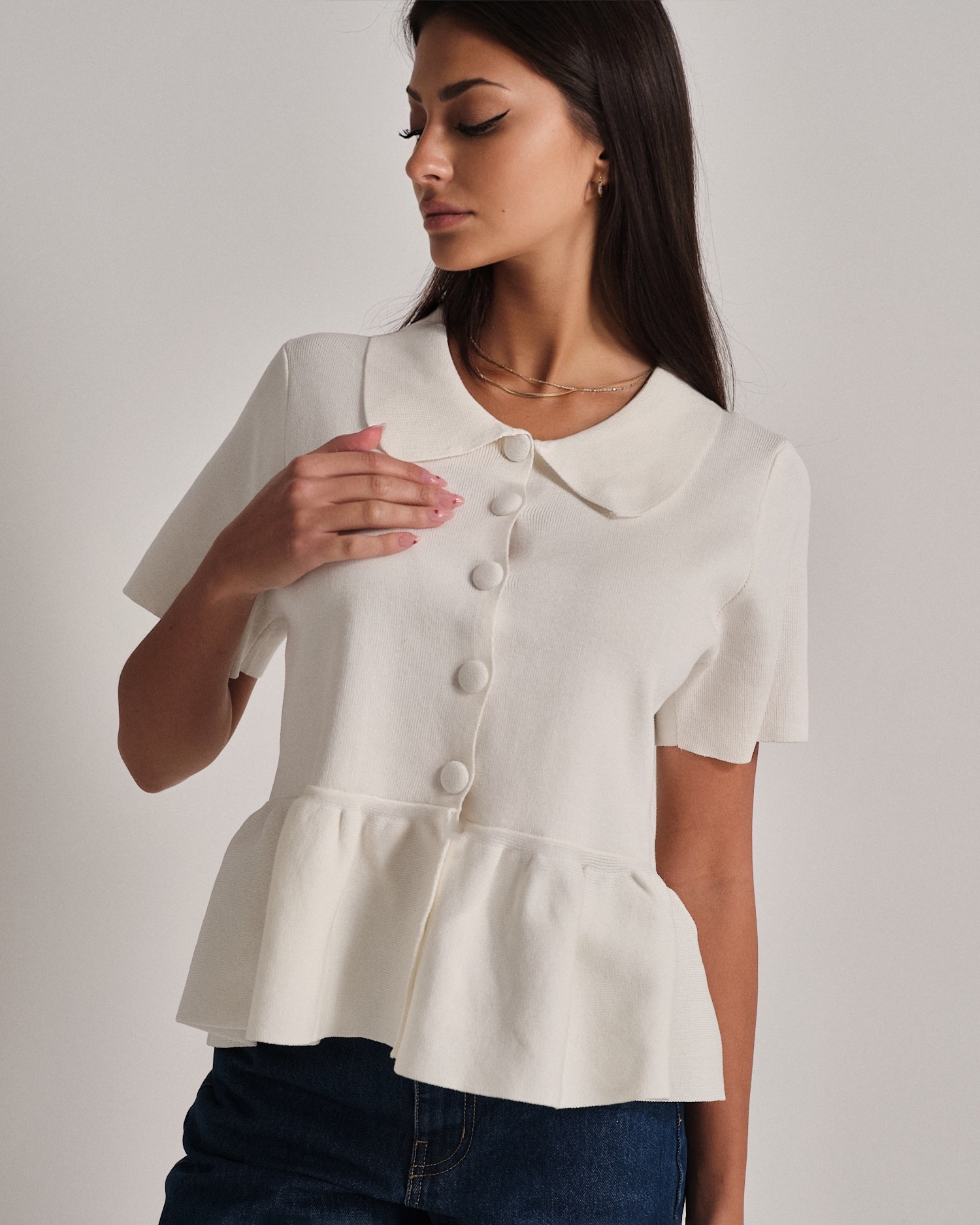 Polo in maglia a mezza manica con bottoncini tono su tono e volant sul fondo.