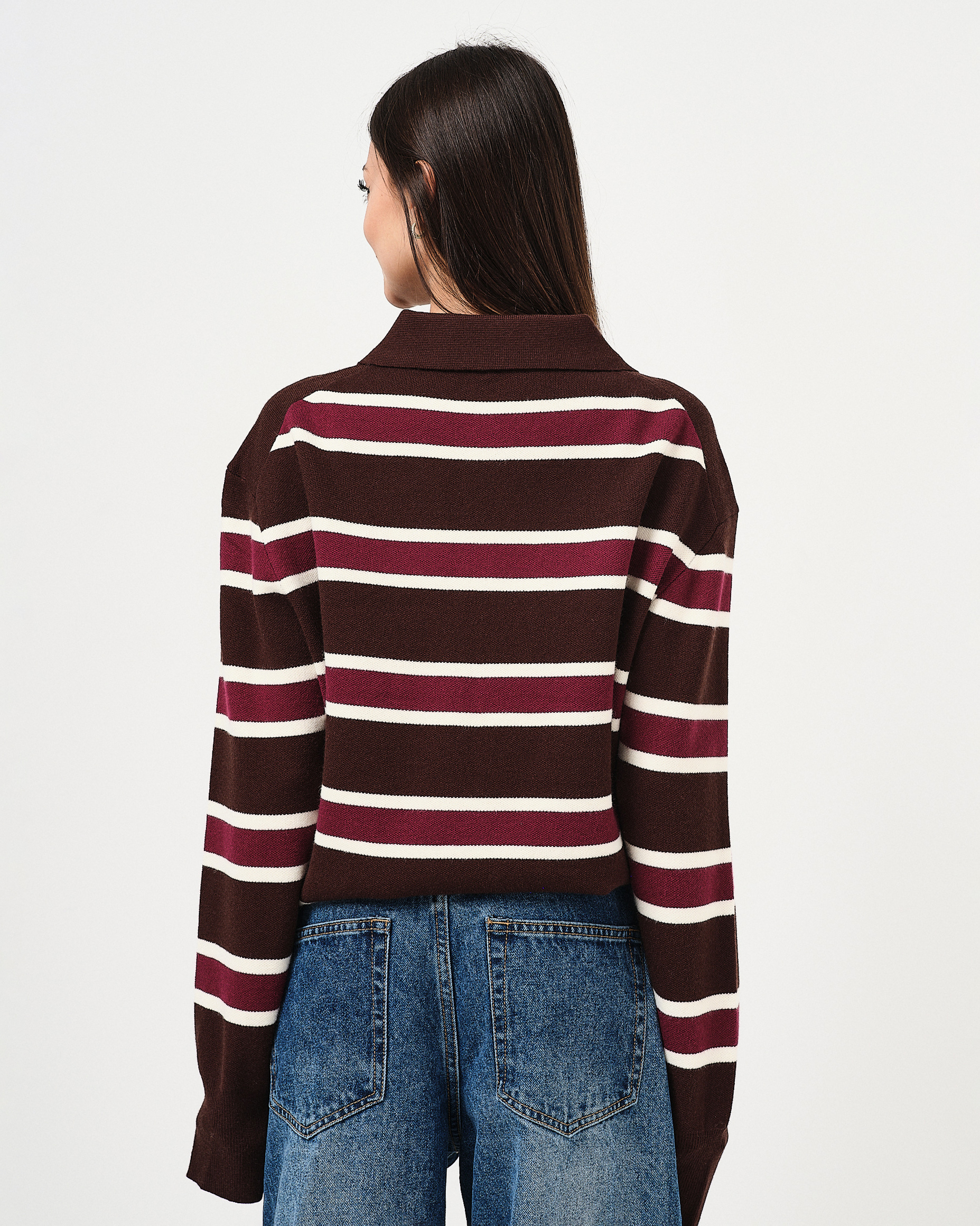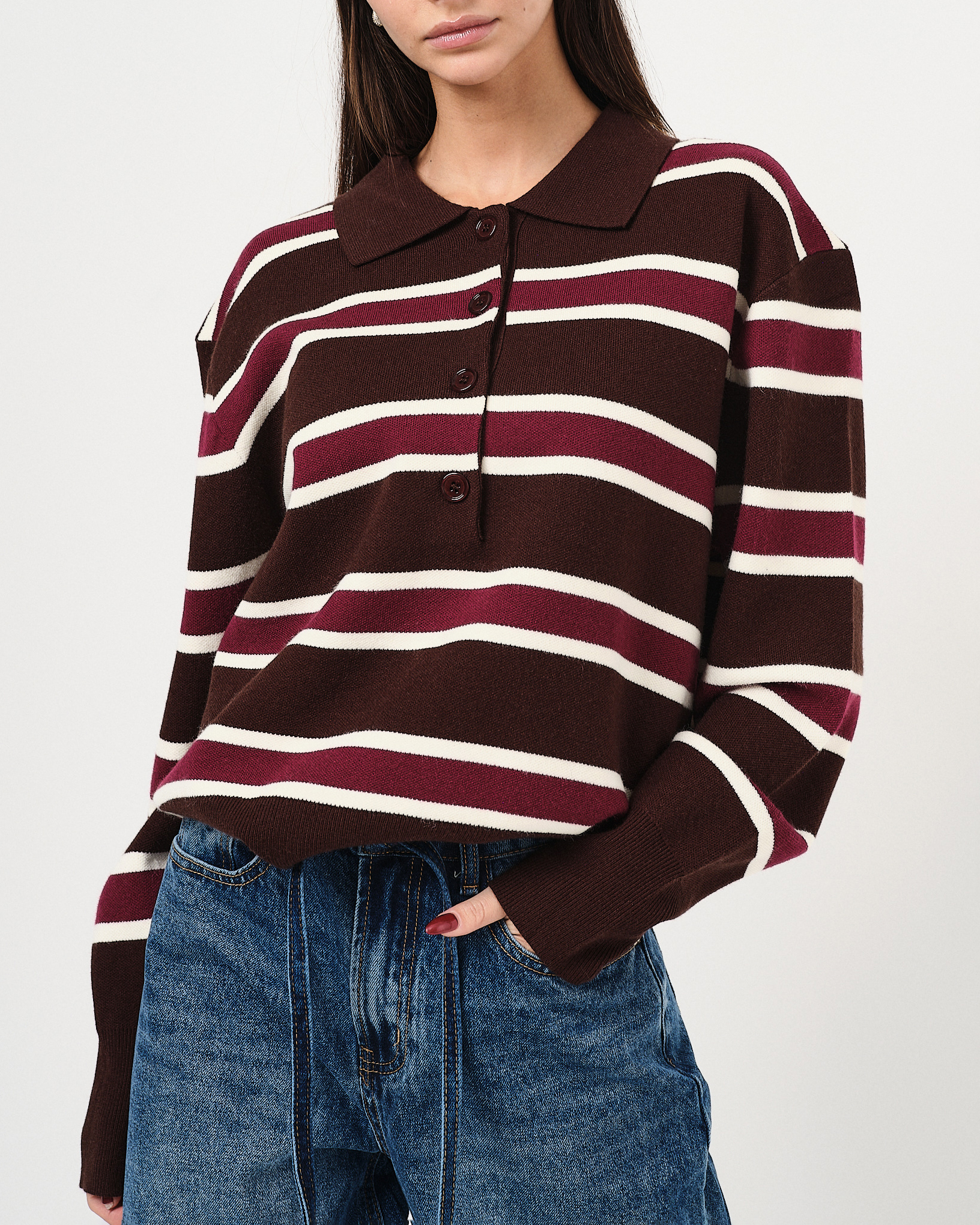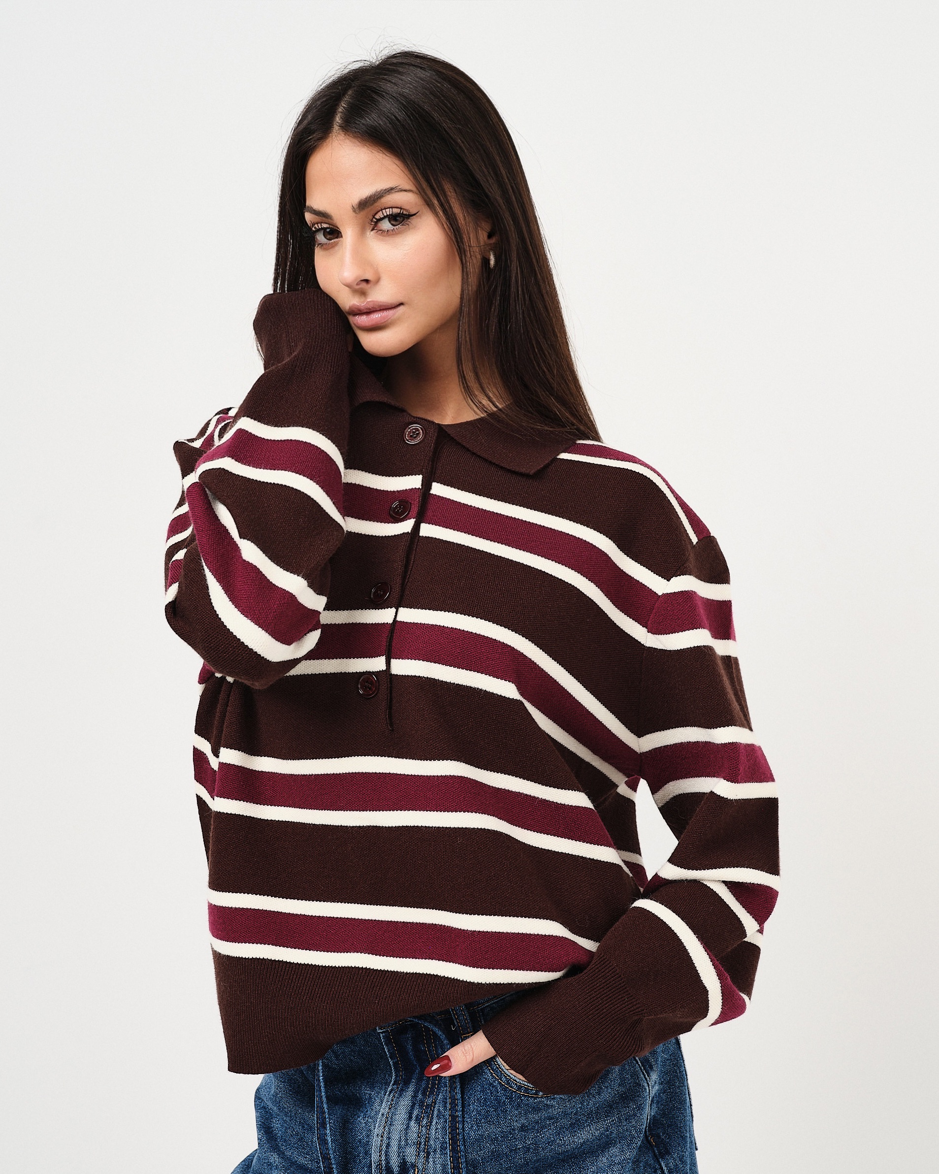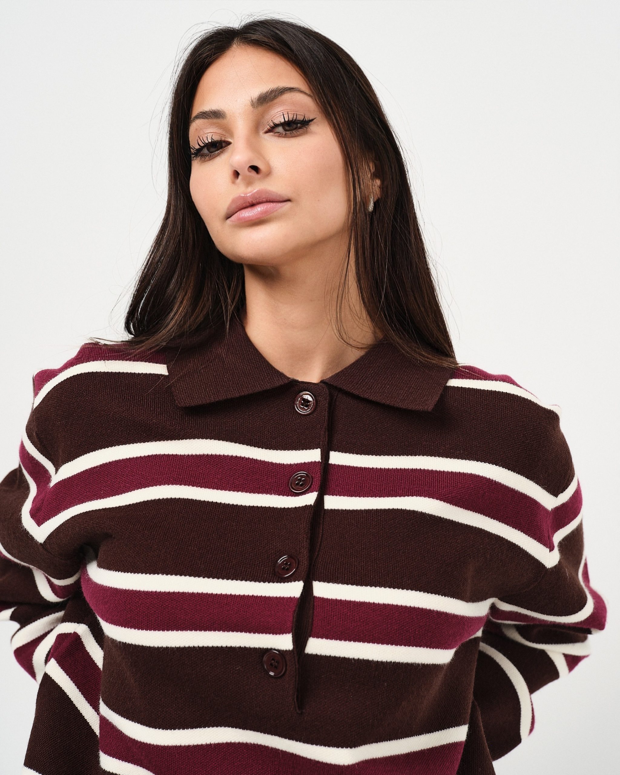 Polo oversize in maglia a righe con colletto e bottoncini.