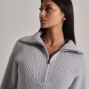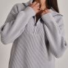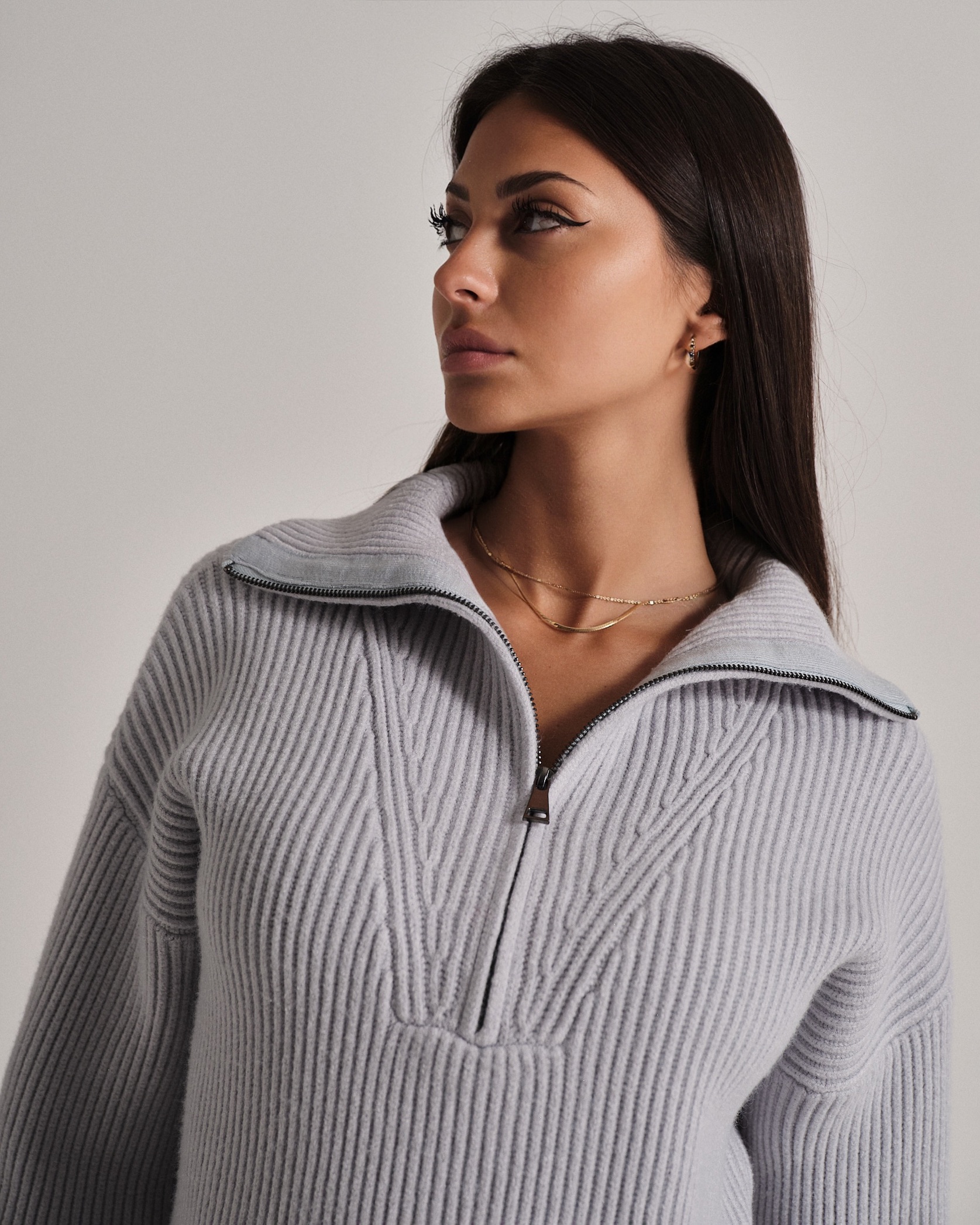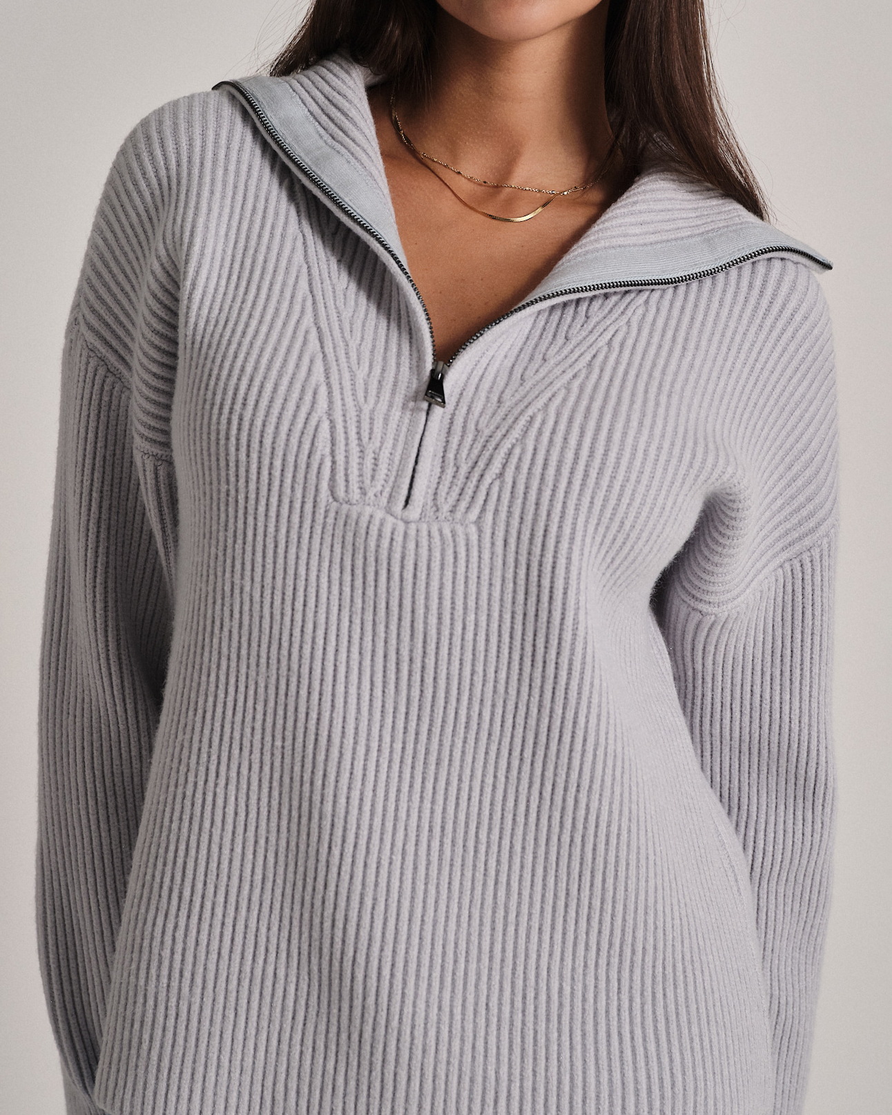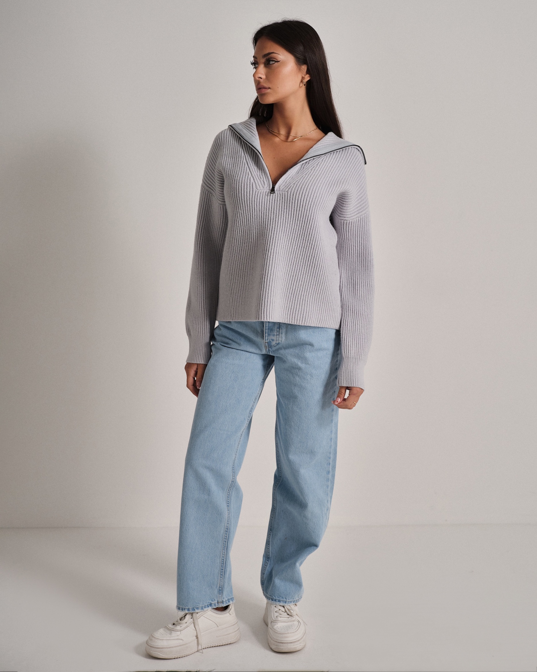 Maglione a coste in filato morbido e confortevole. Collo alto con zip per una vestibilità regolabile.
