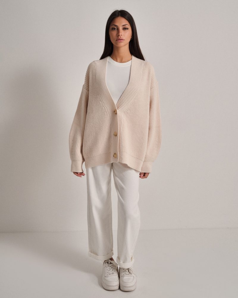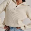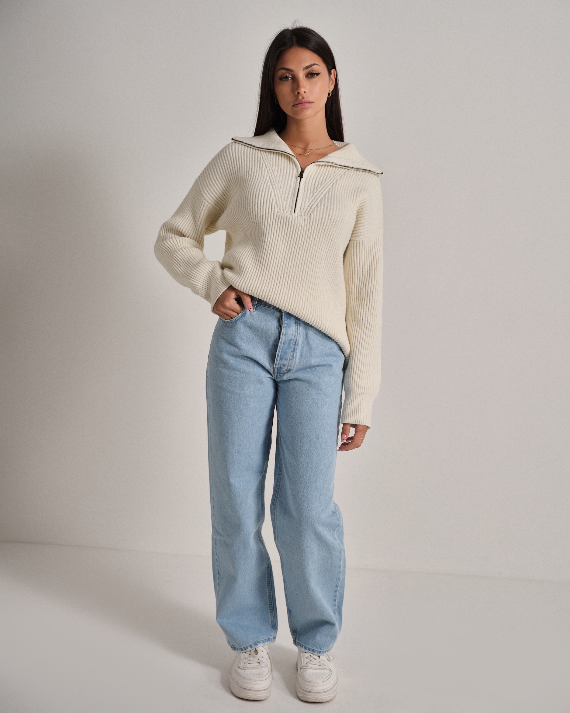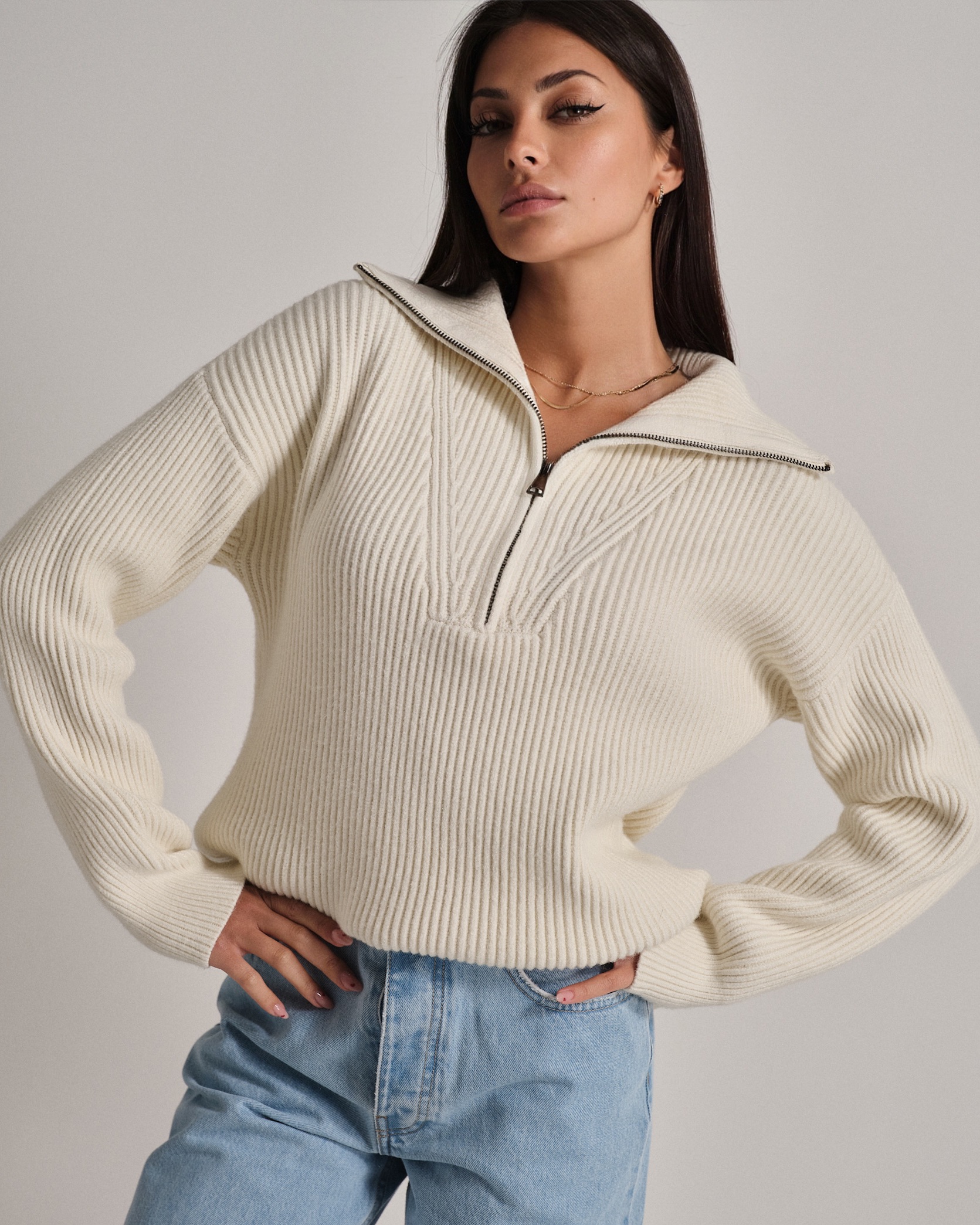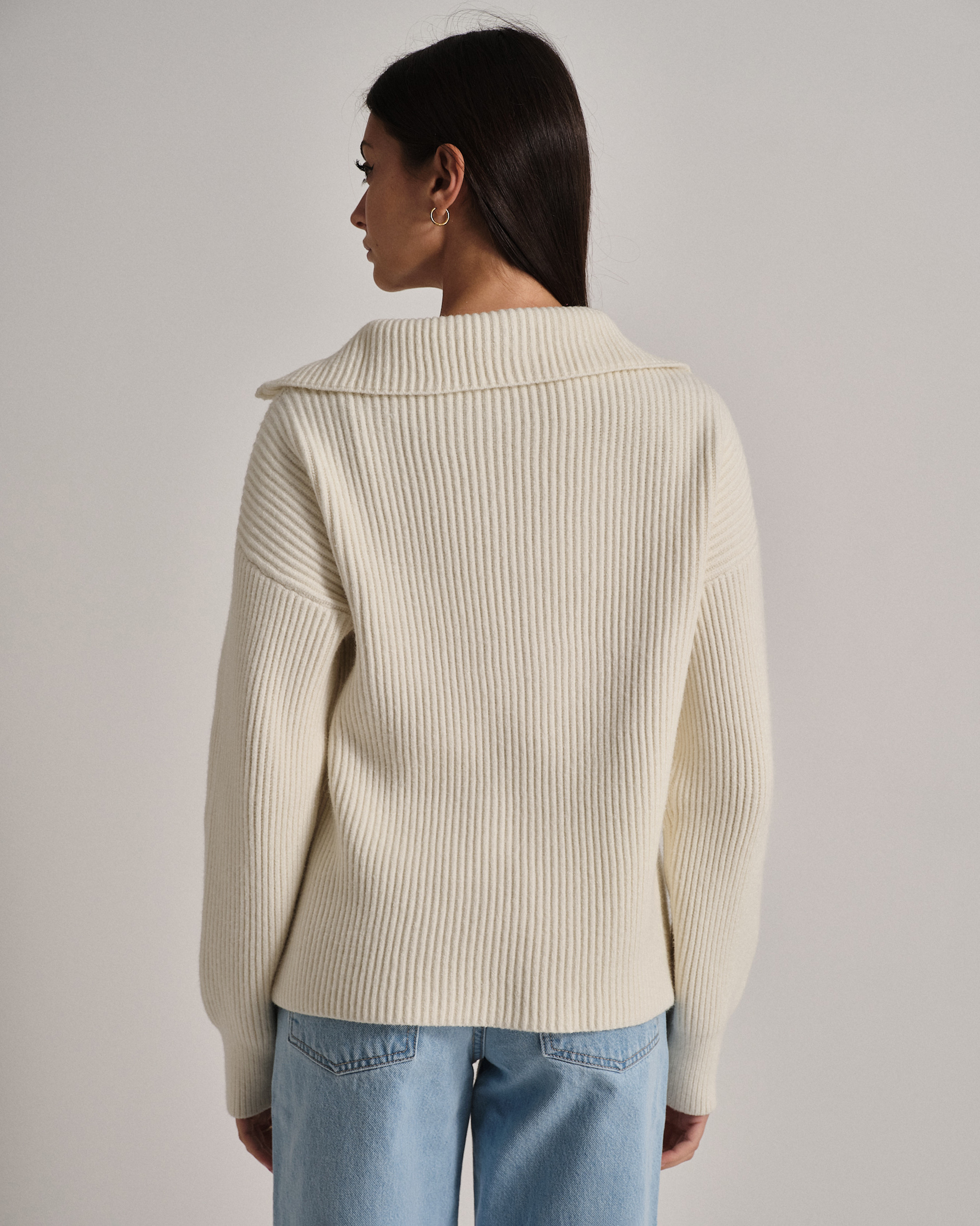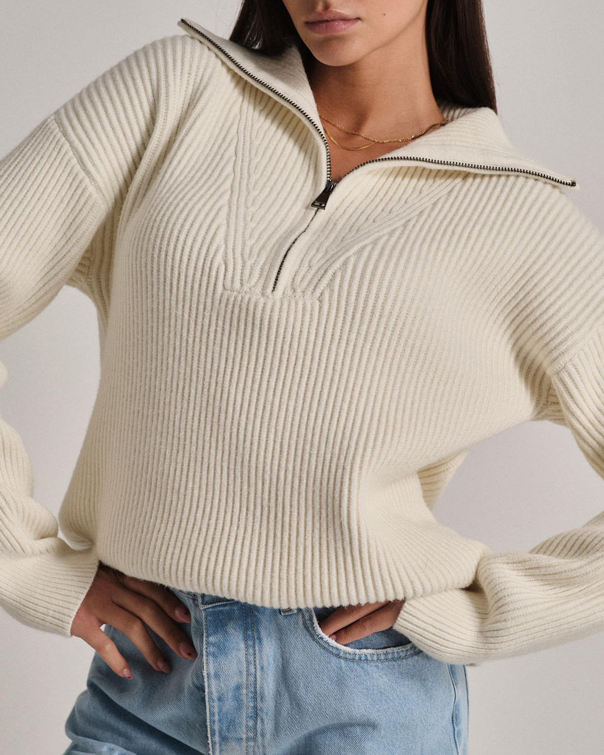 Maglione a coste in filato morbido e confortevole. Collo alto con zip per una vestibilità regolabile.