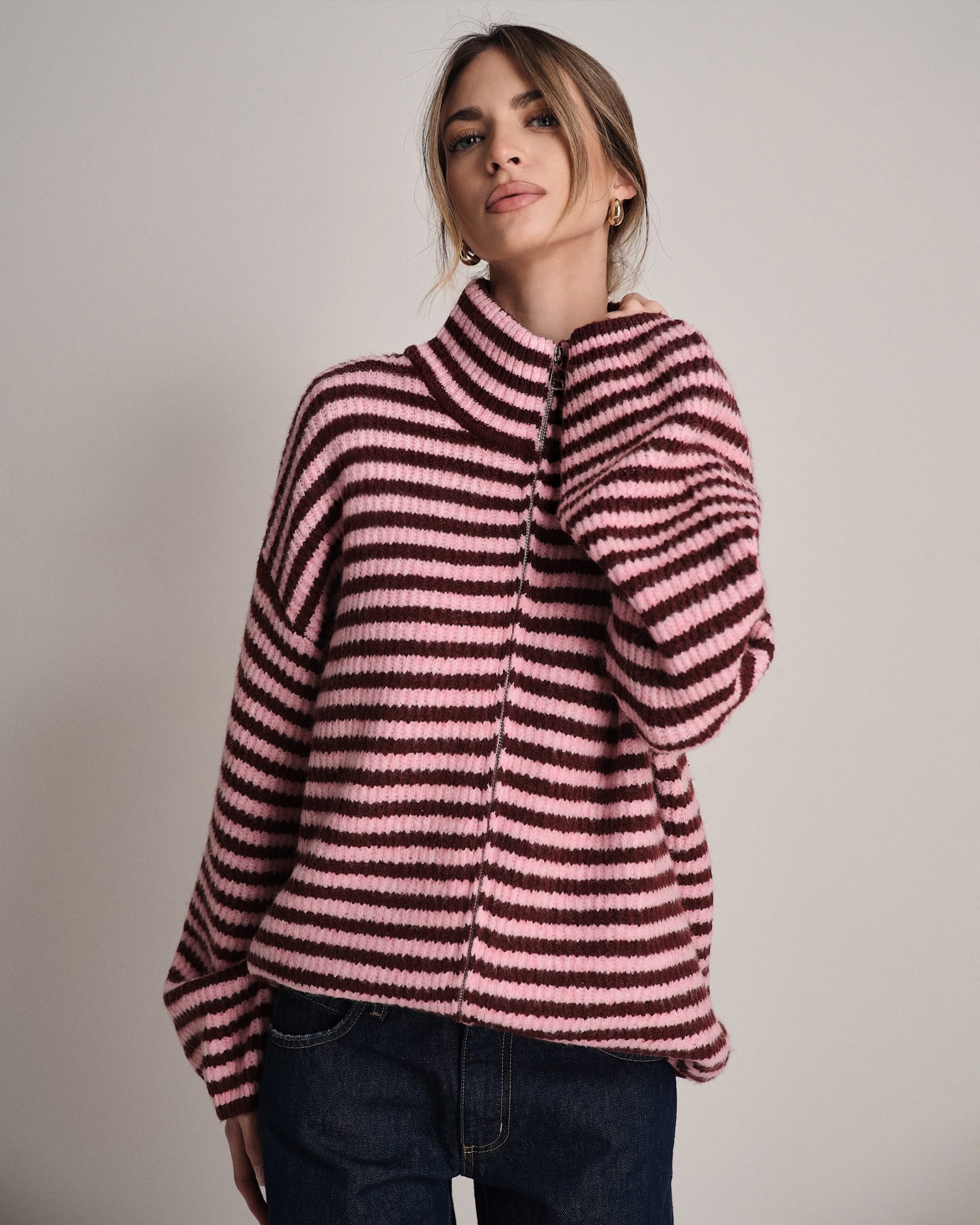Pullover a collo alto in maglia tricot a righe con zip e manica ampia.