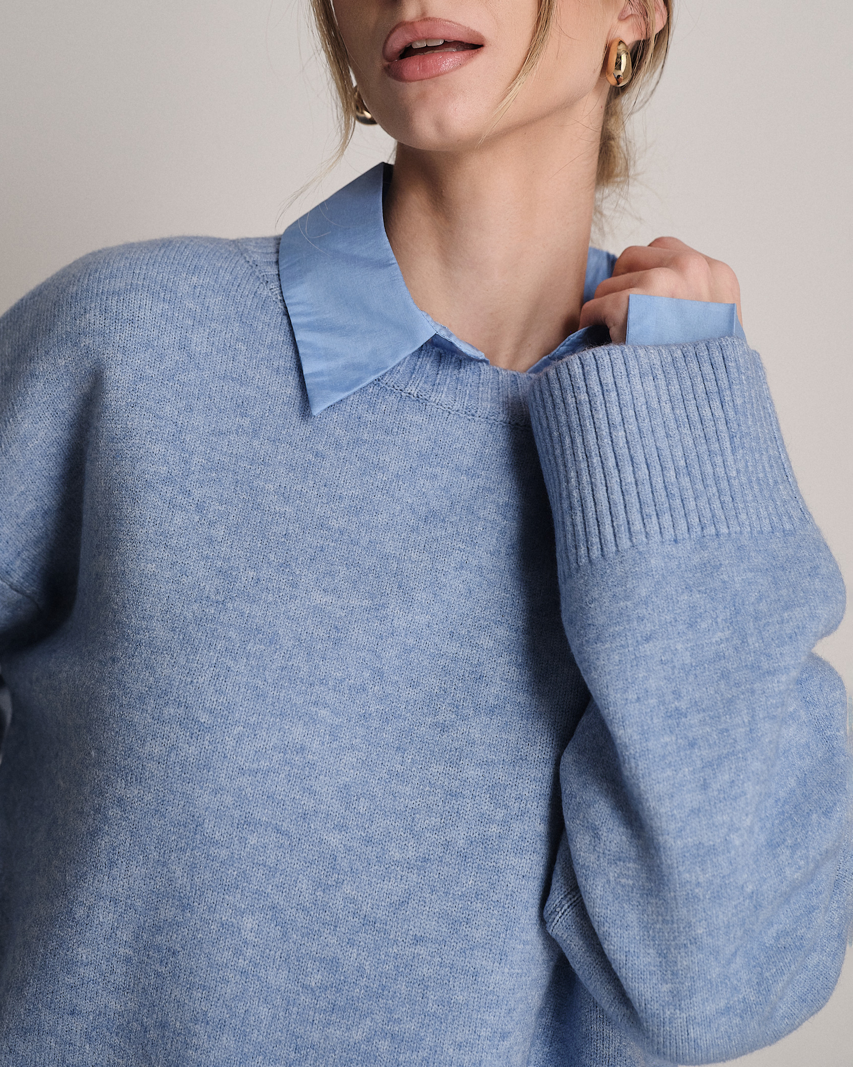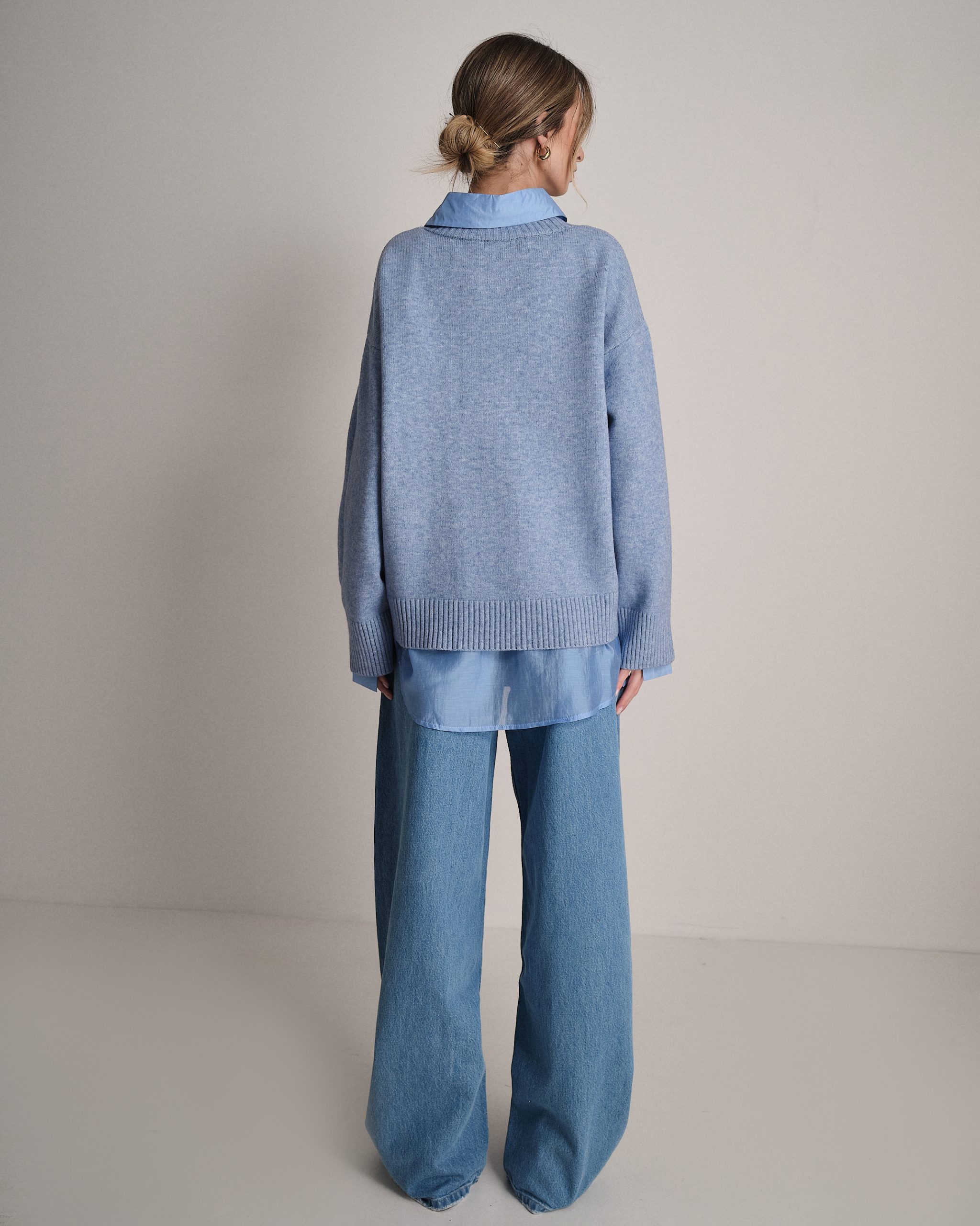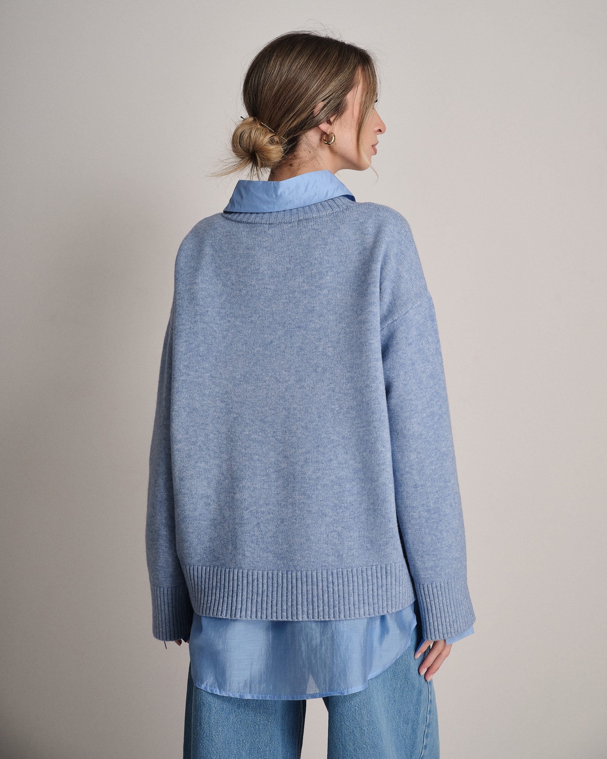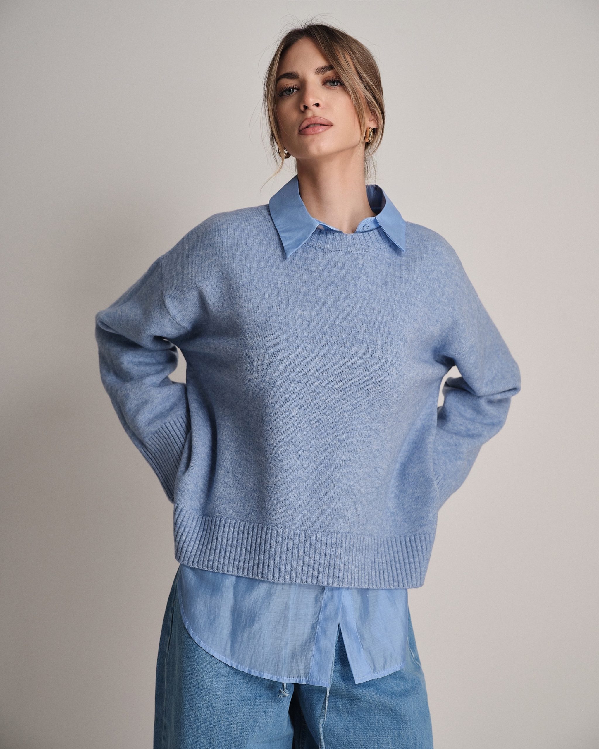 Pullover ampio a girocollo con fondo svasato e manica larga.