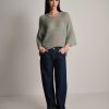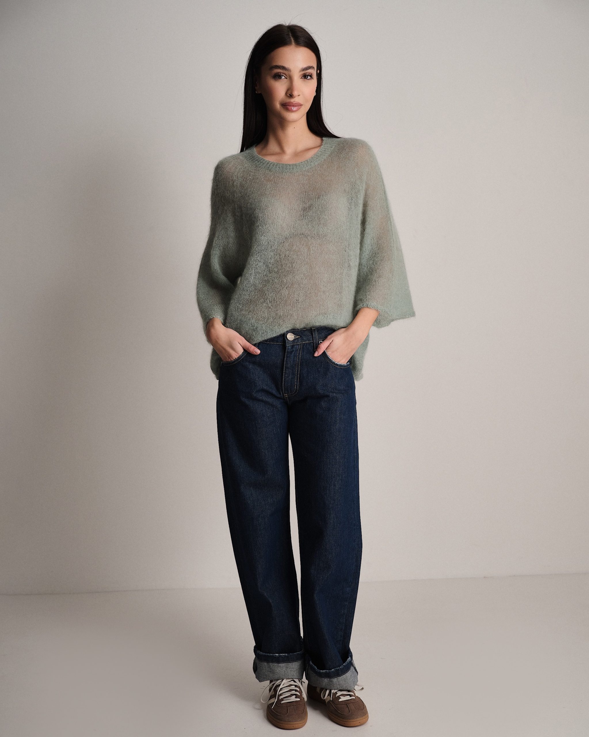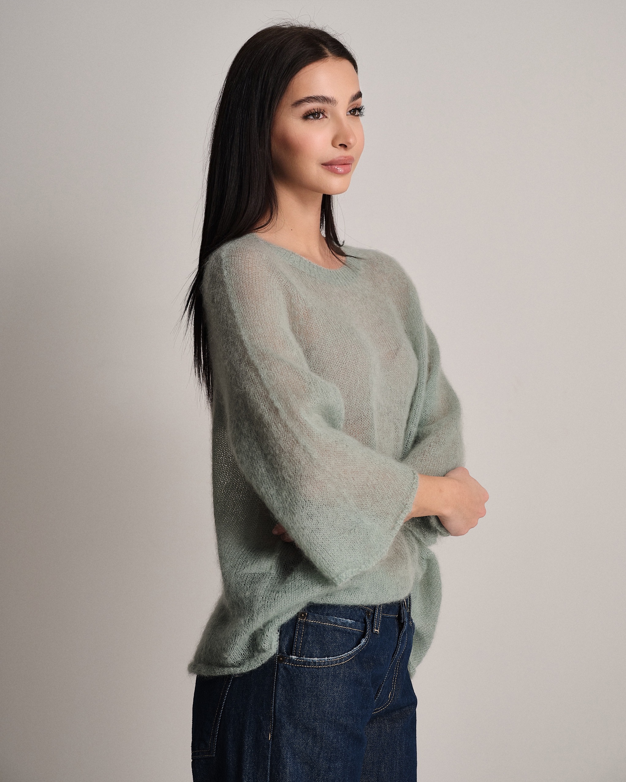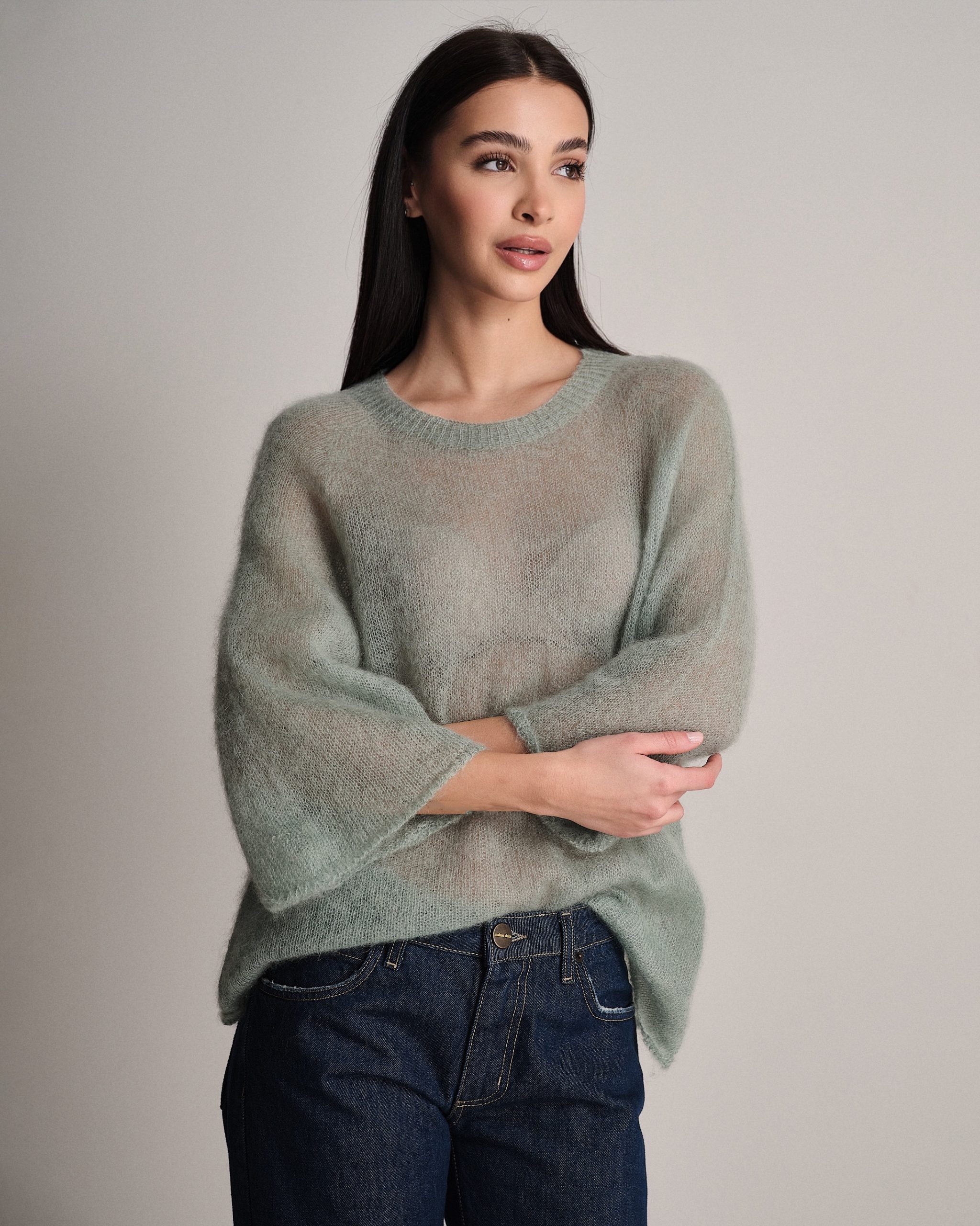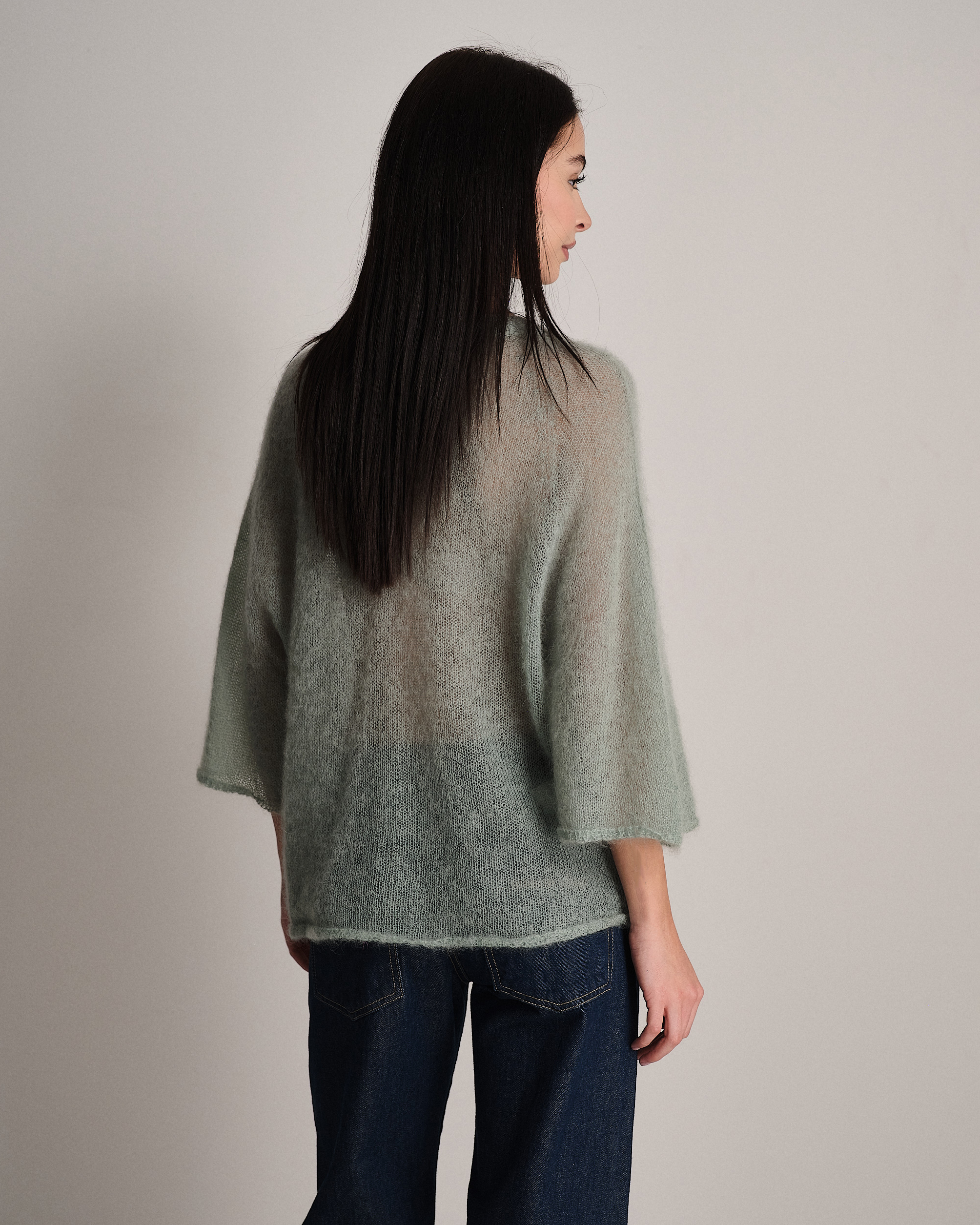 Pullover in kid mohair superfine con scollo a barchetta e manica svasata a tre quarti.