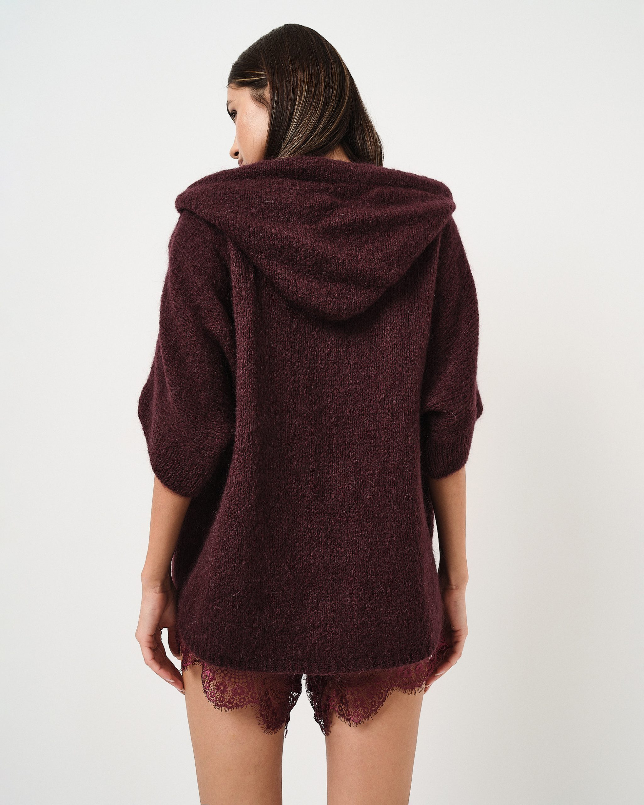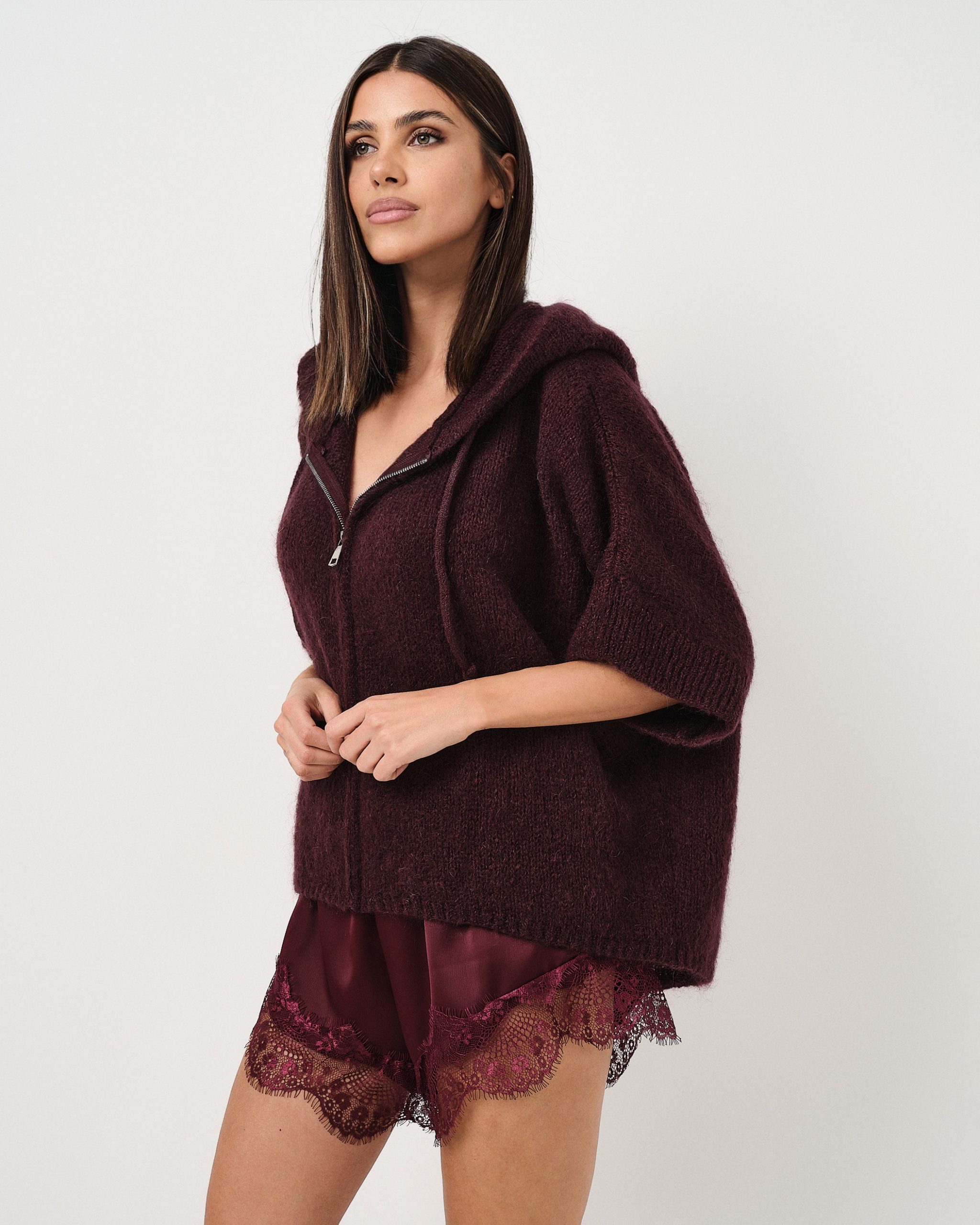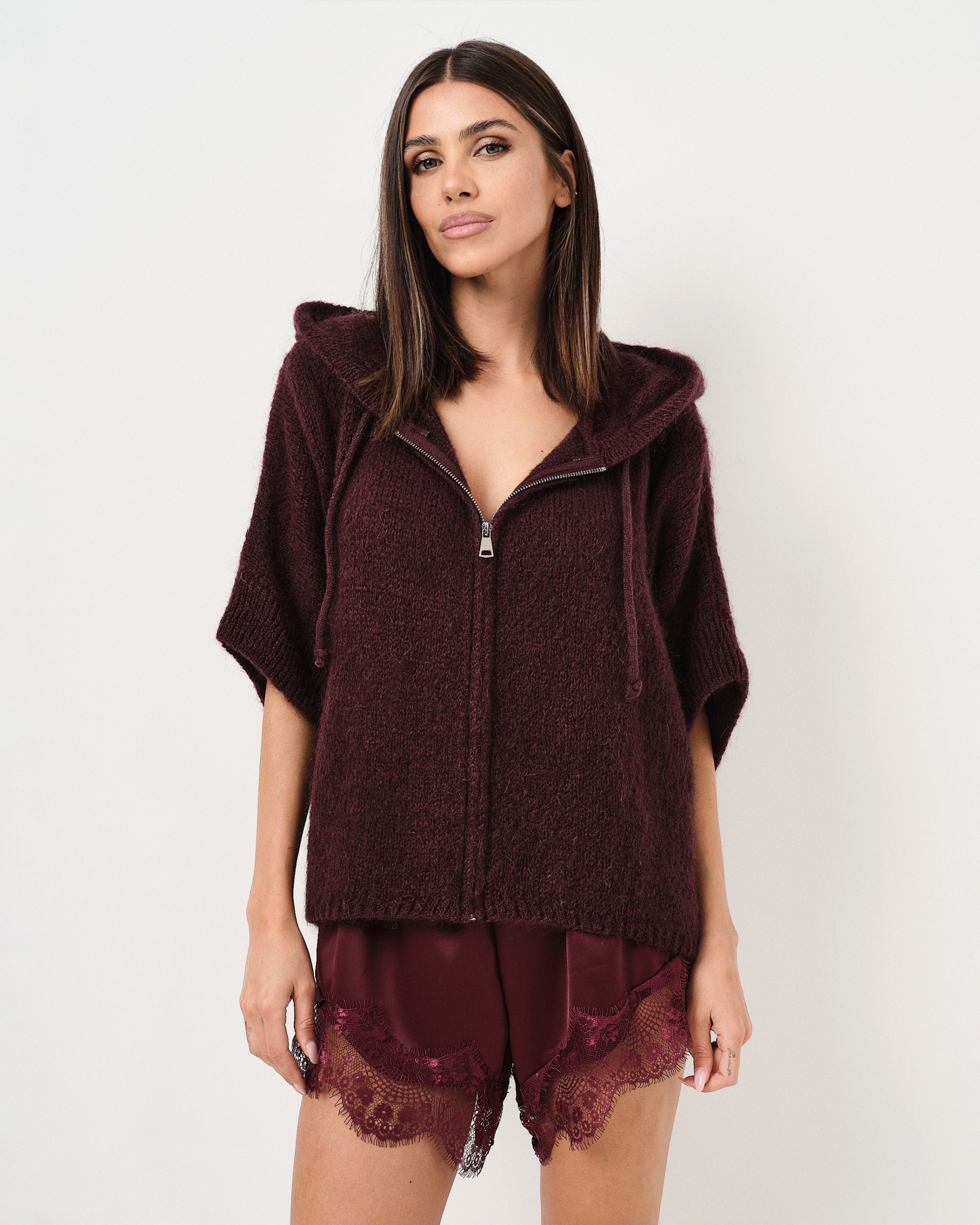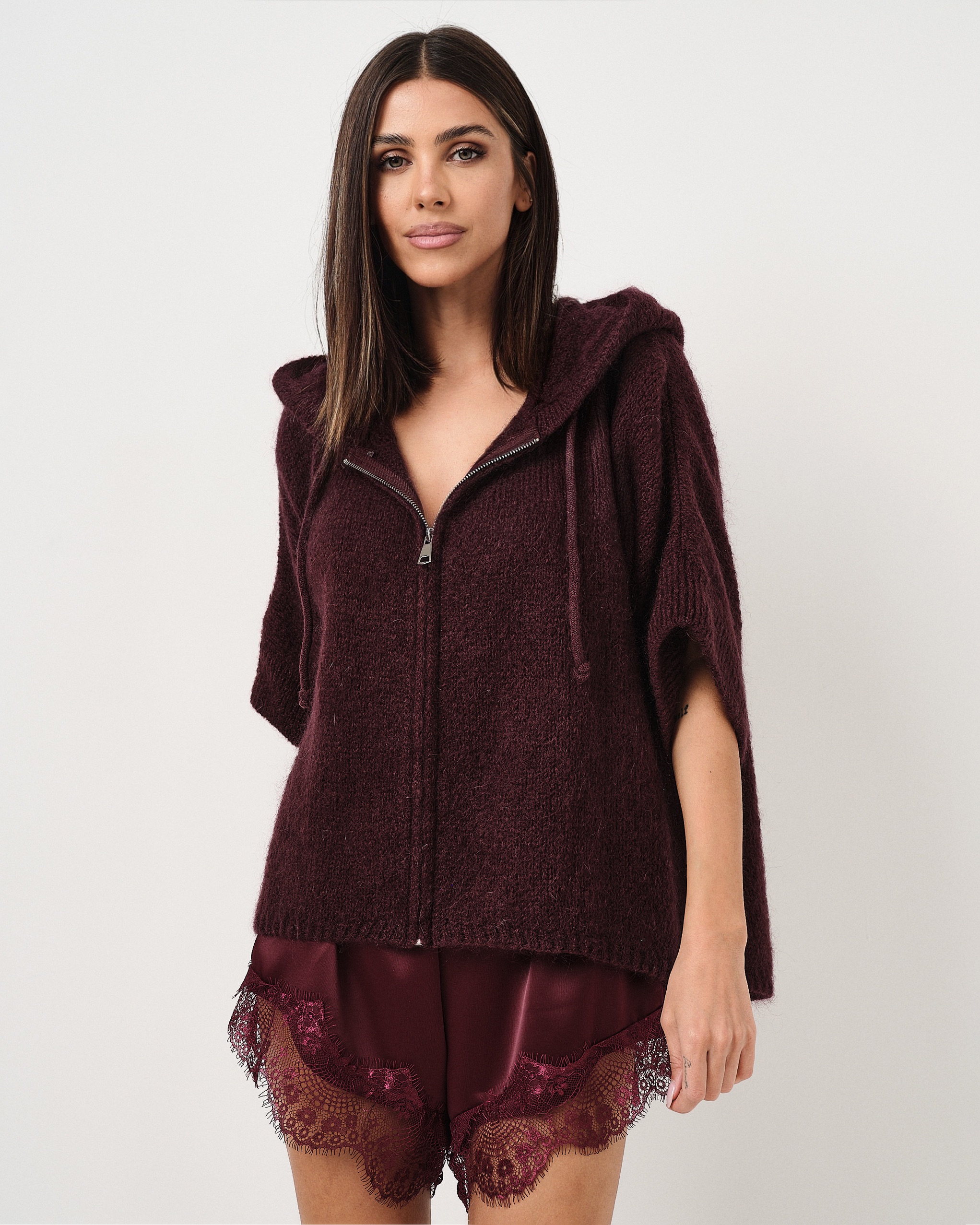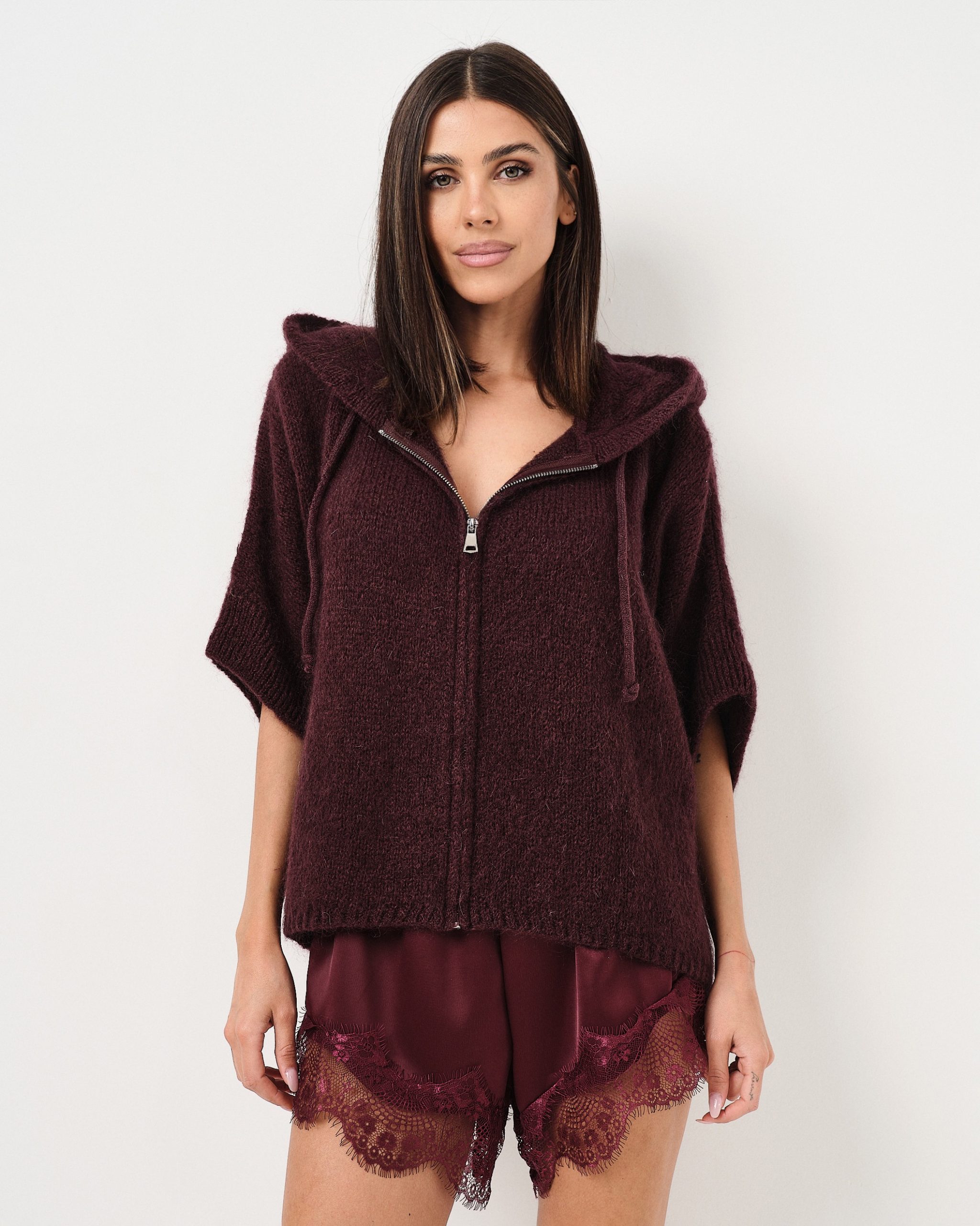 Pullover fluffy oversize con manica a tre quarti, zip e cappuccio.