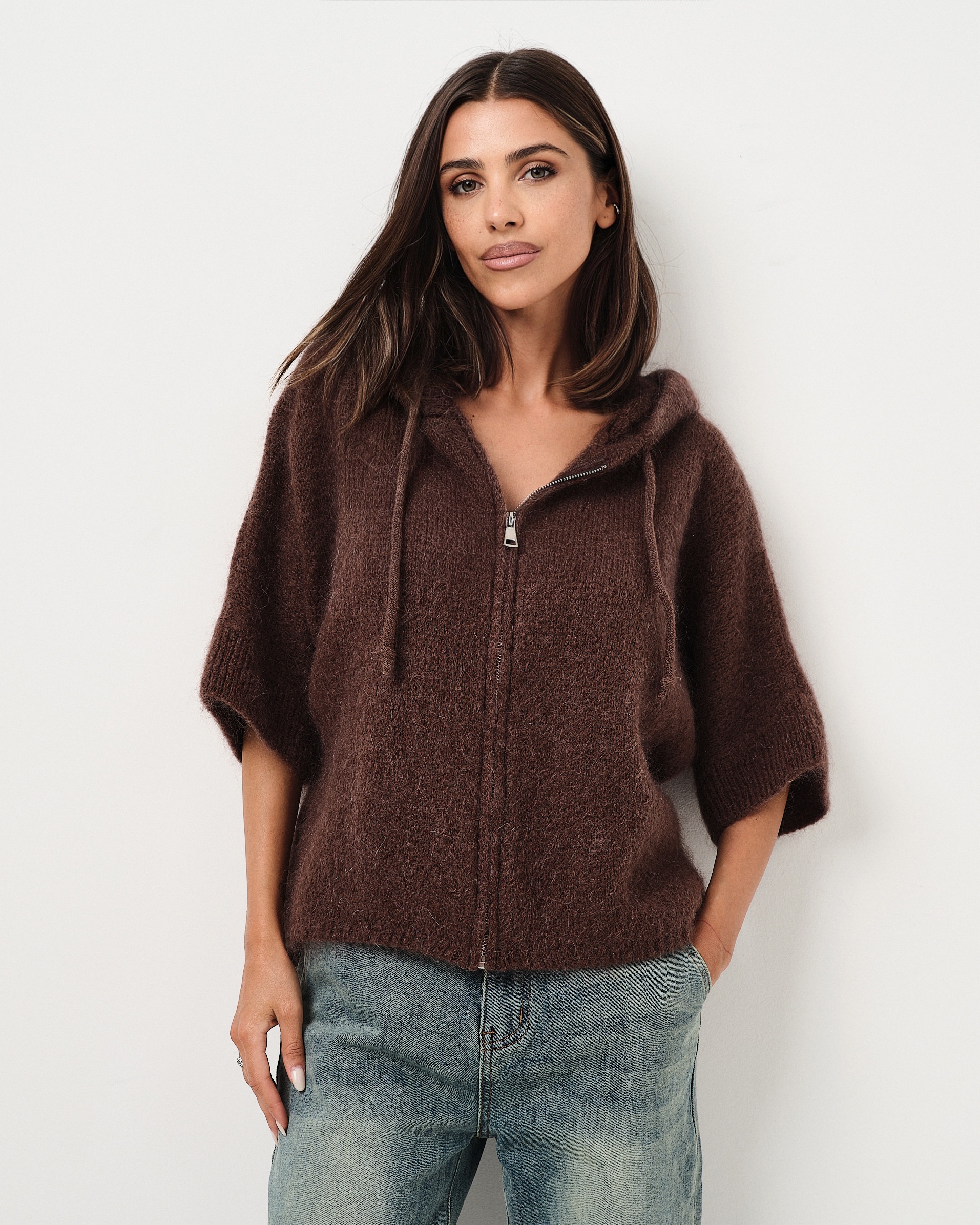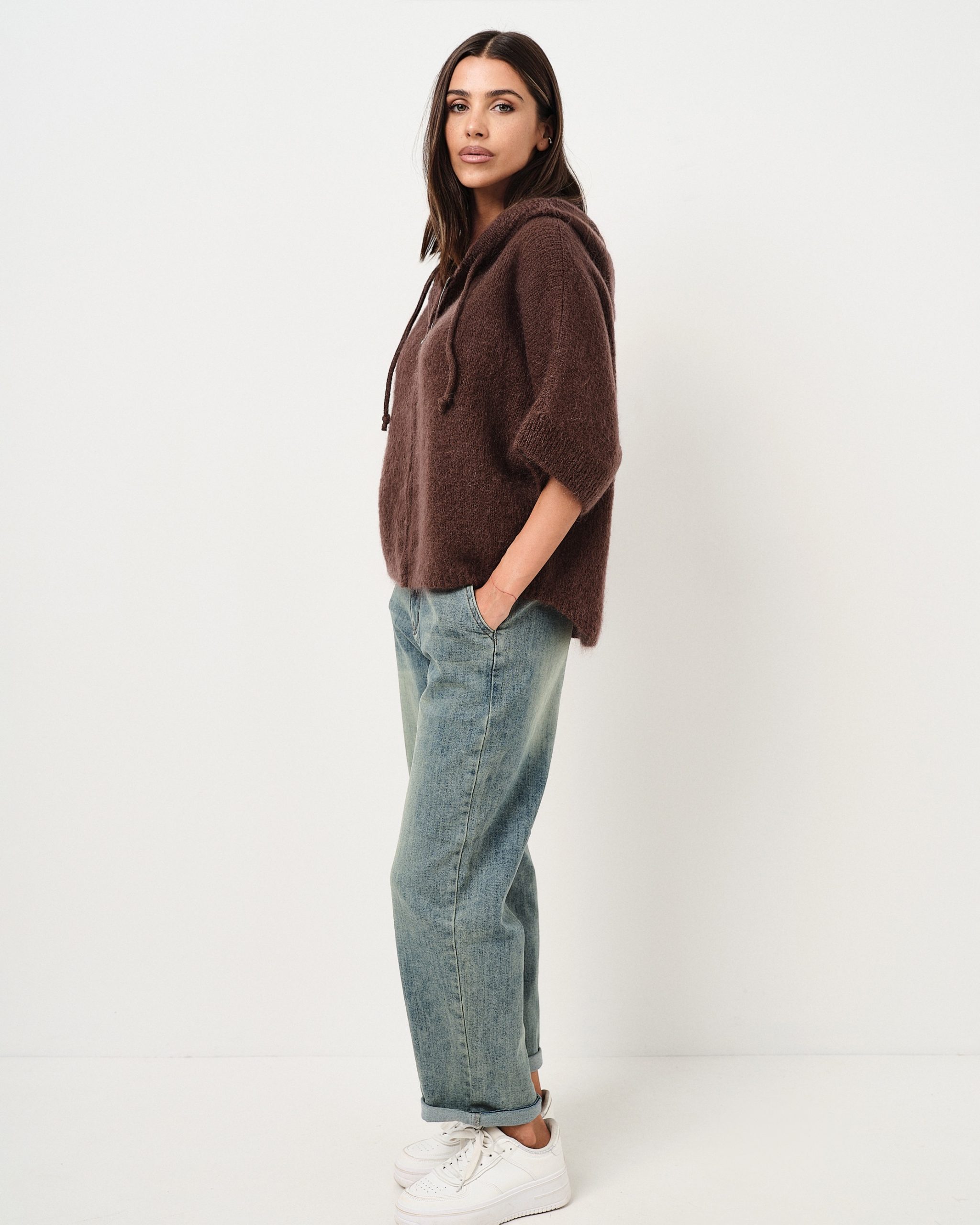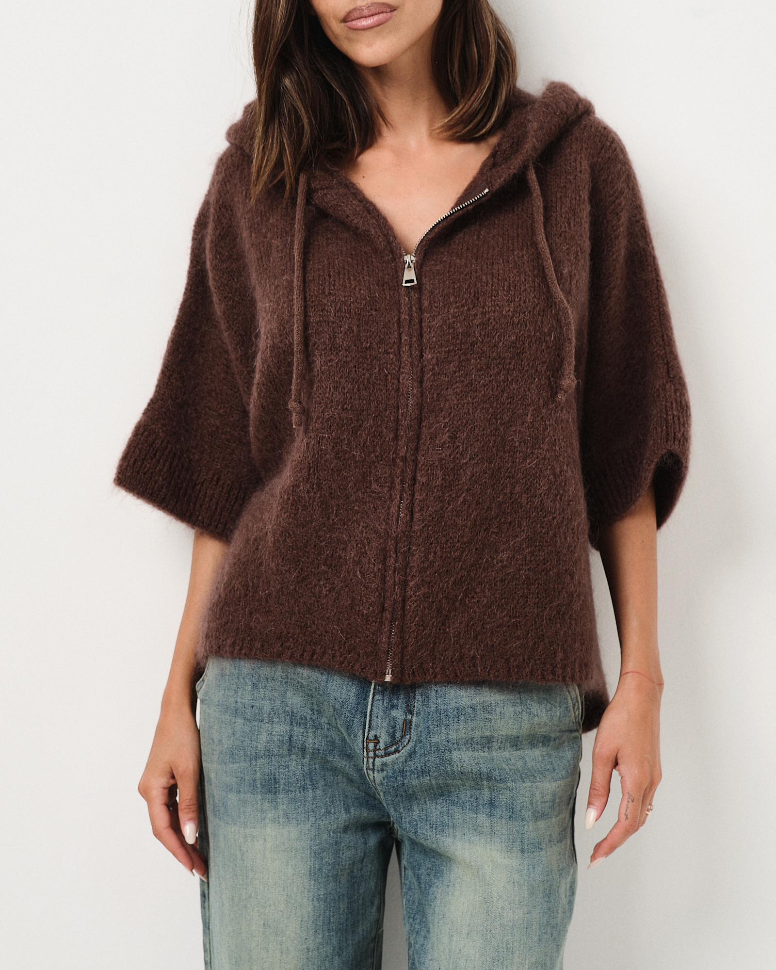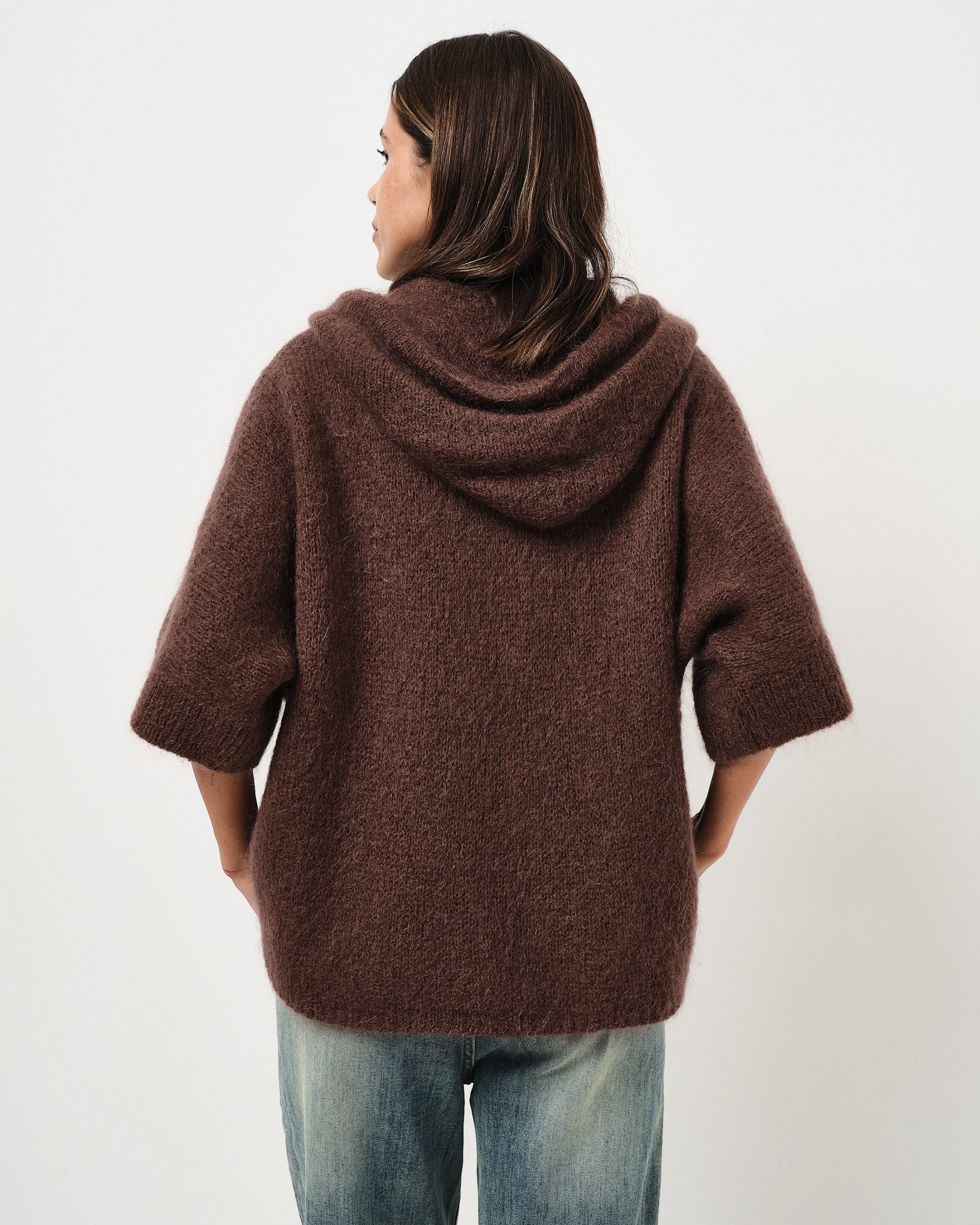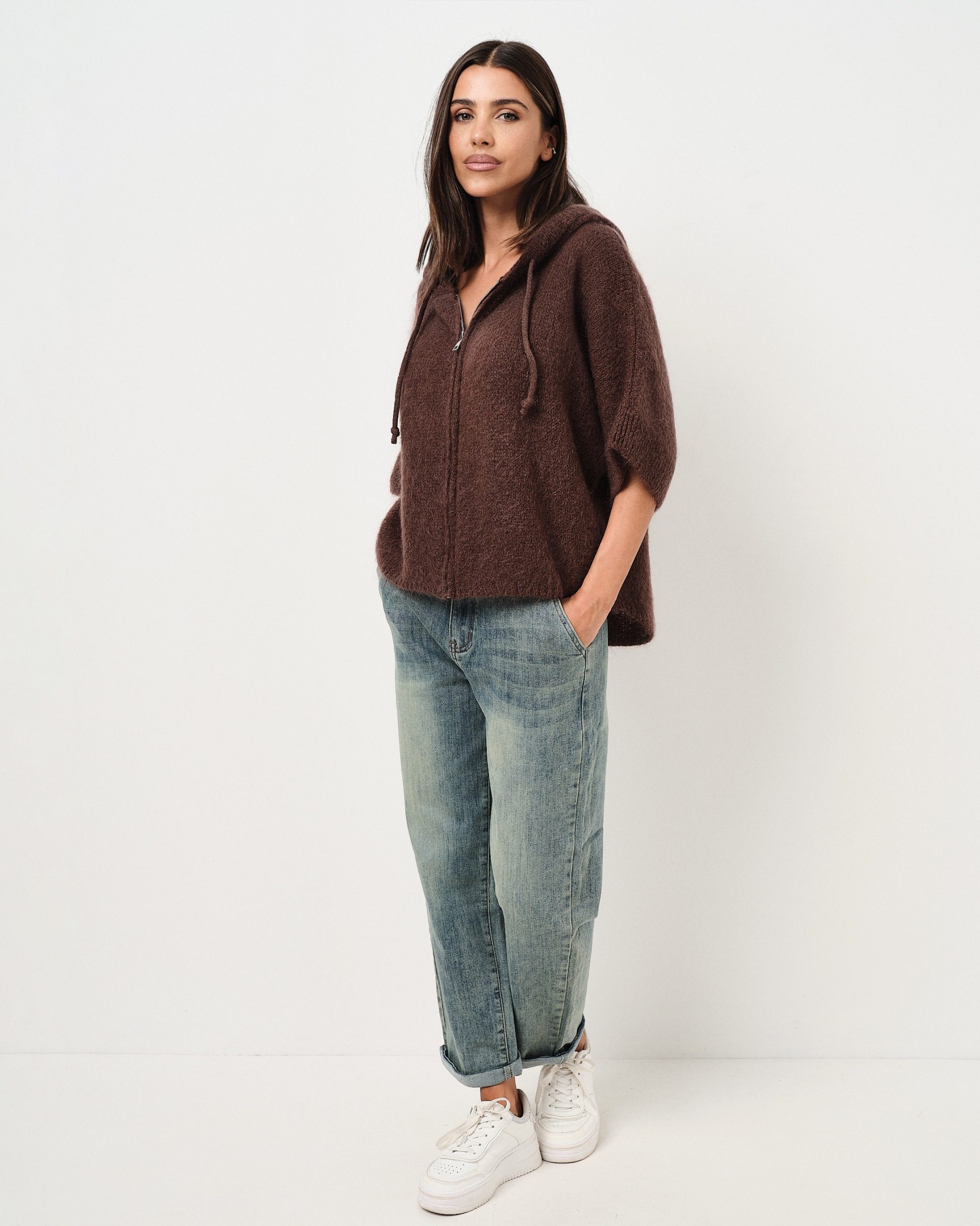 Pullover fluffy oversize con manica a tre quarti, zip e cappuccio.