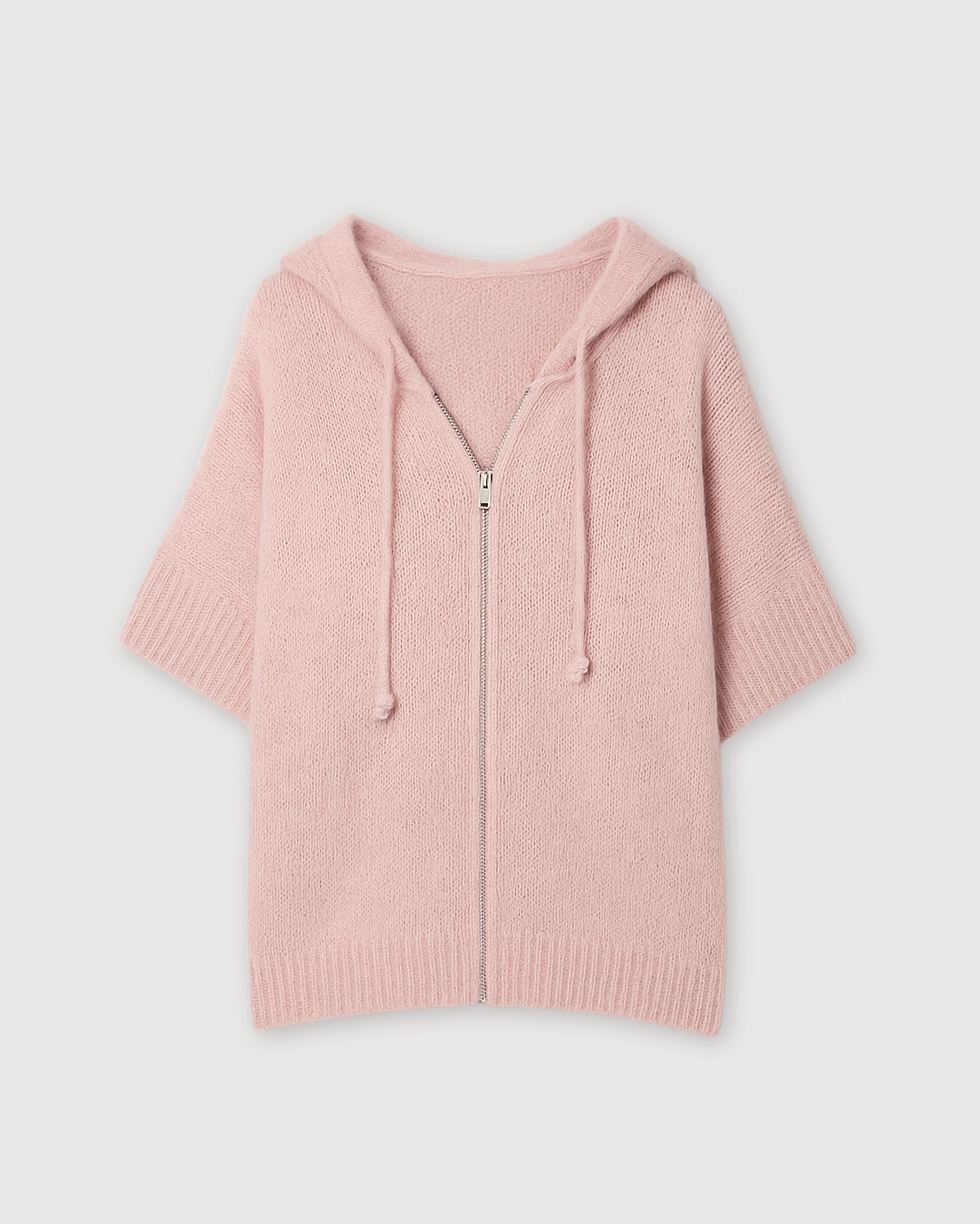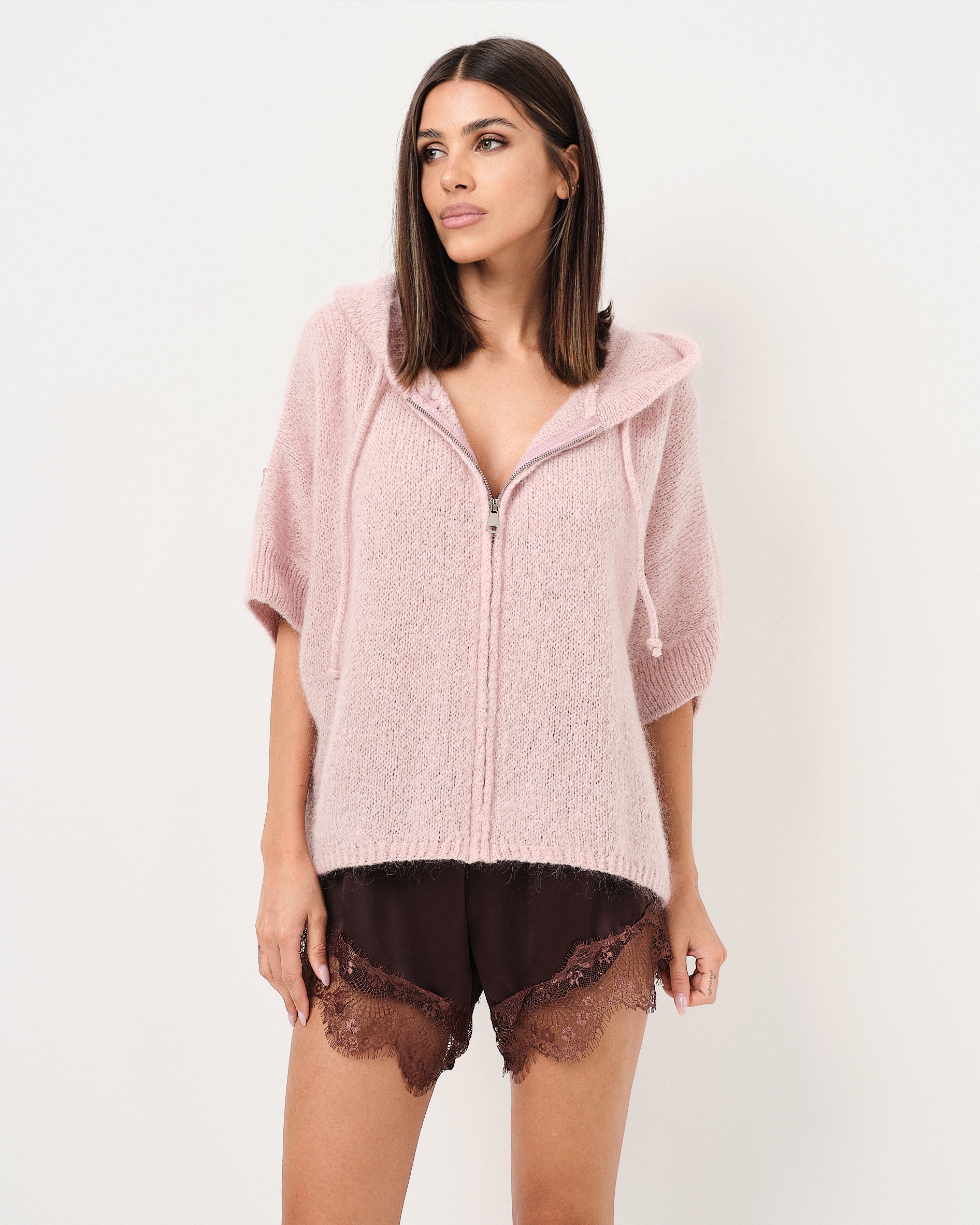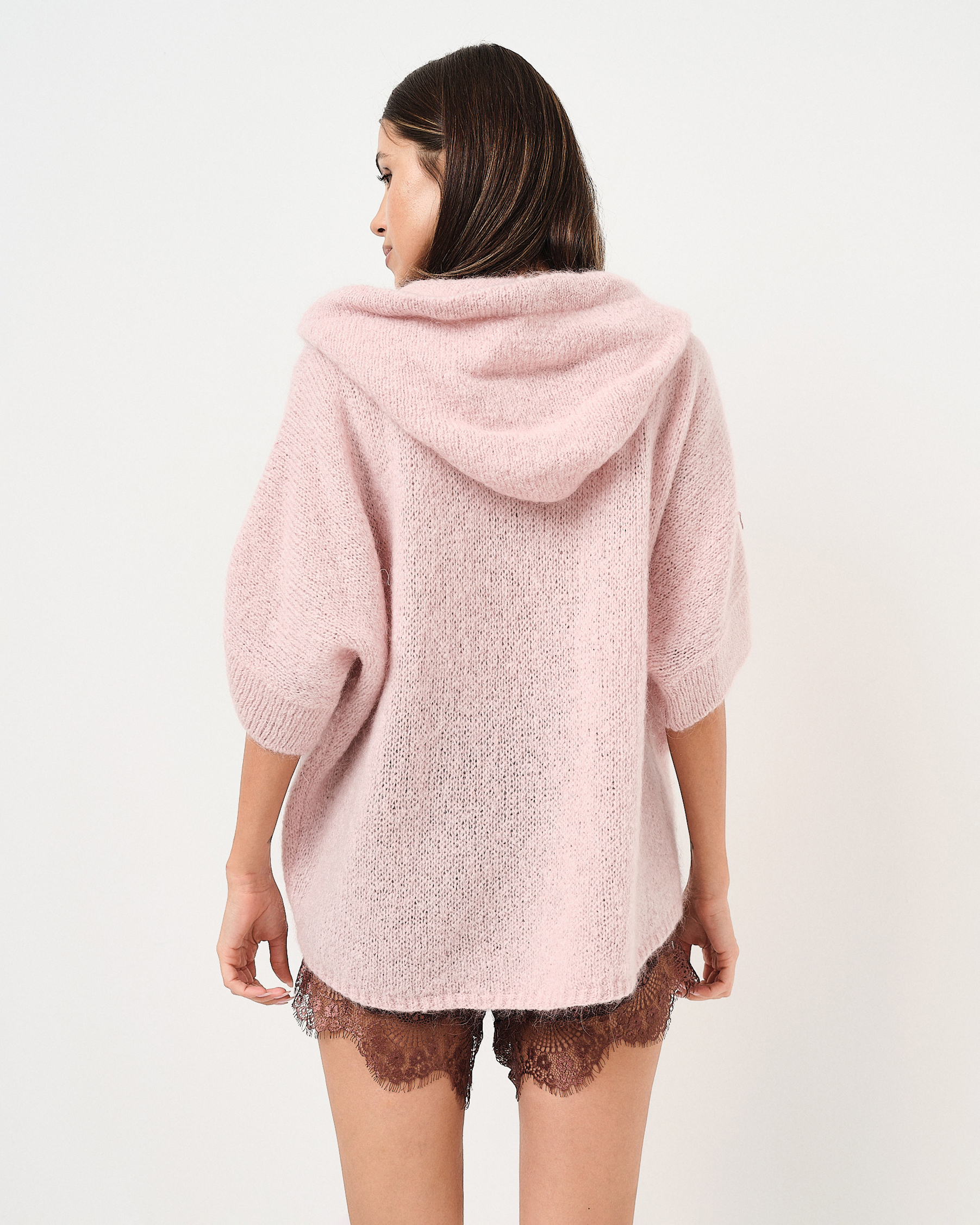 Pullover fluffy oversize con manica a tre quarti, zip e cappuccio.