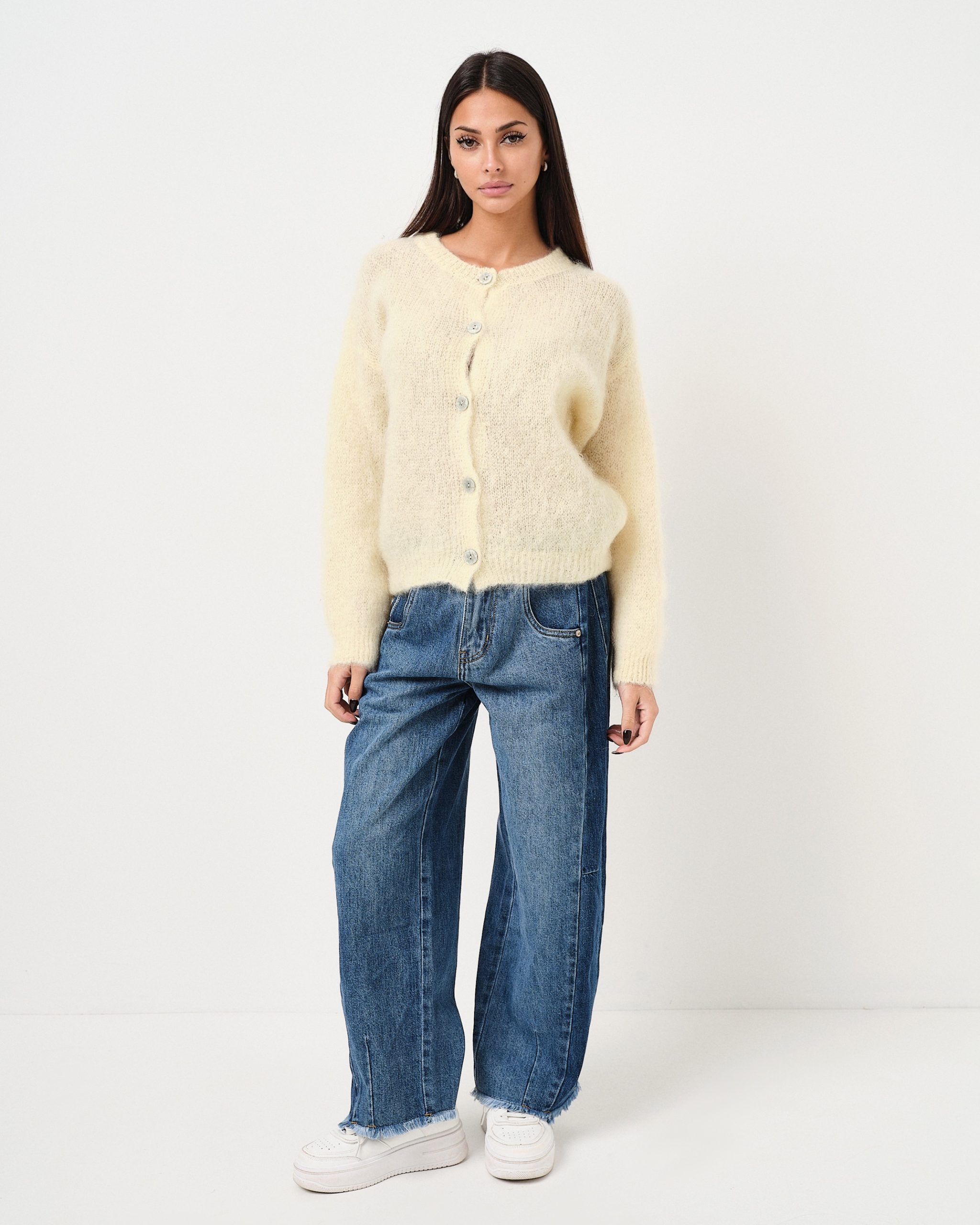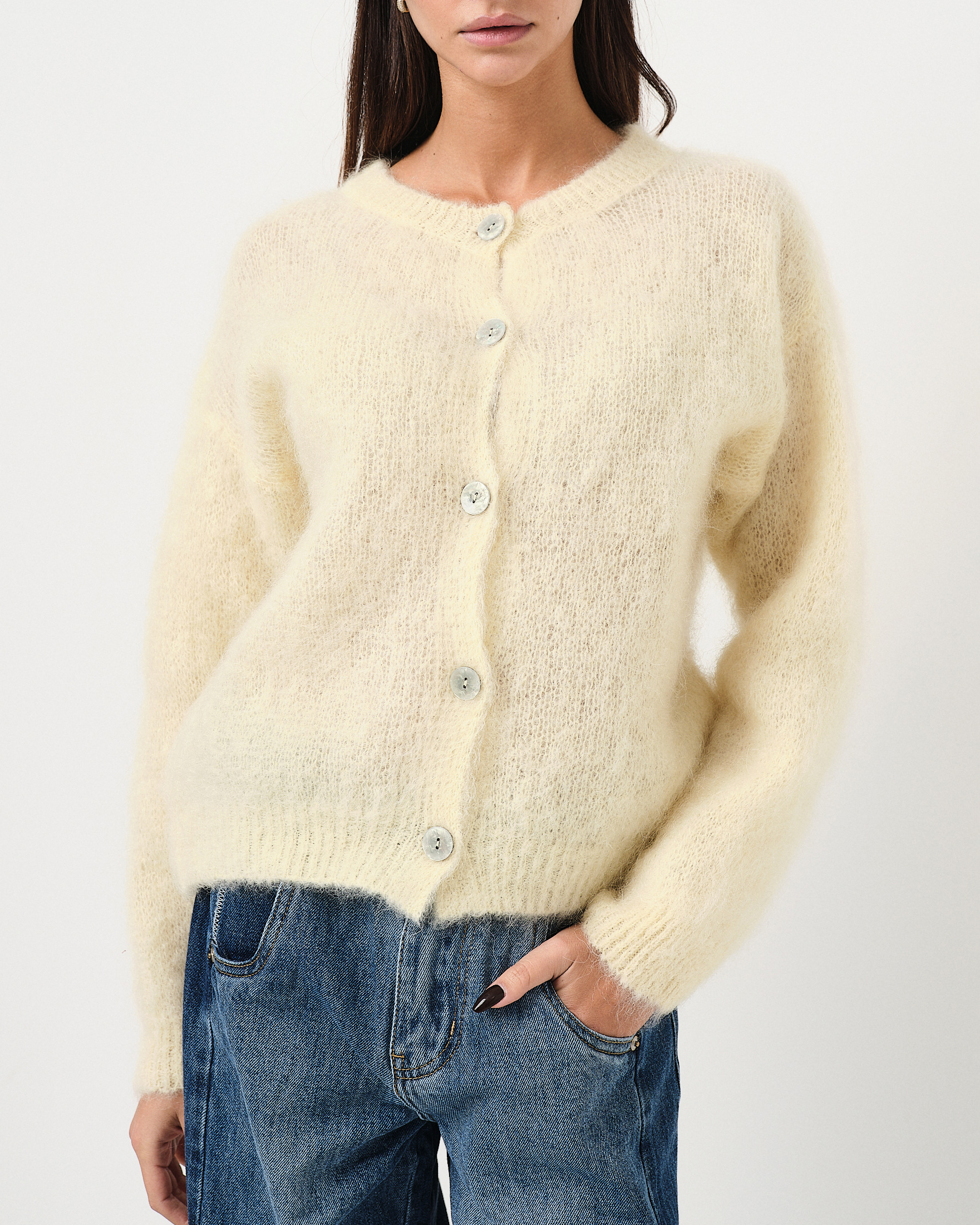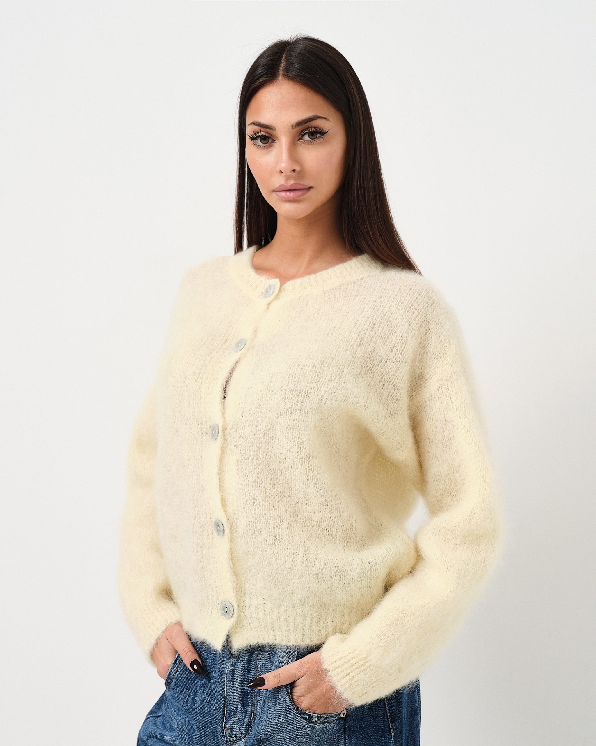 Maglione in mohair effetto fluffy con bottoni.