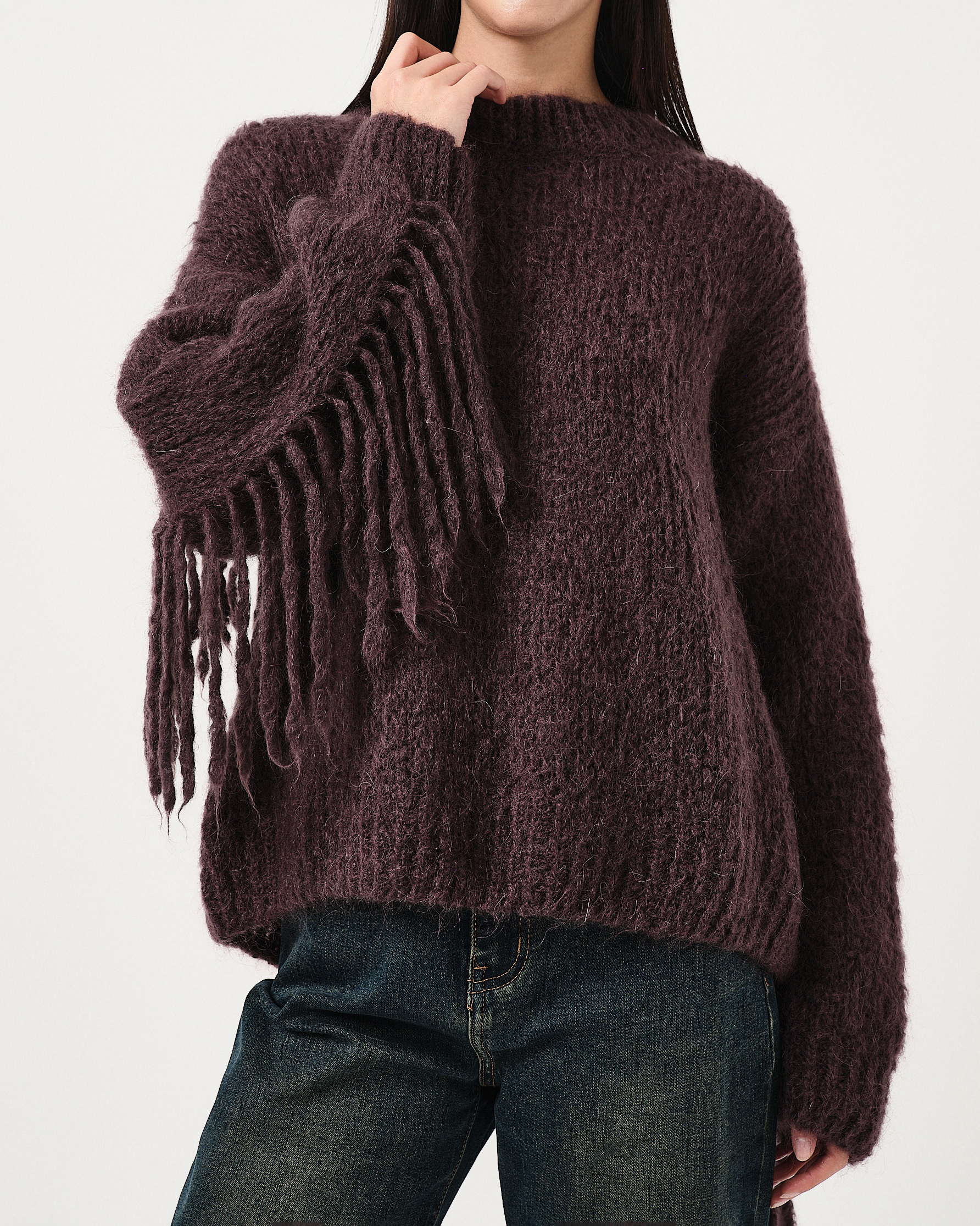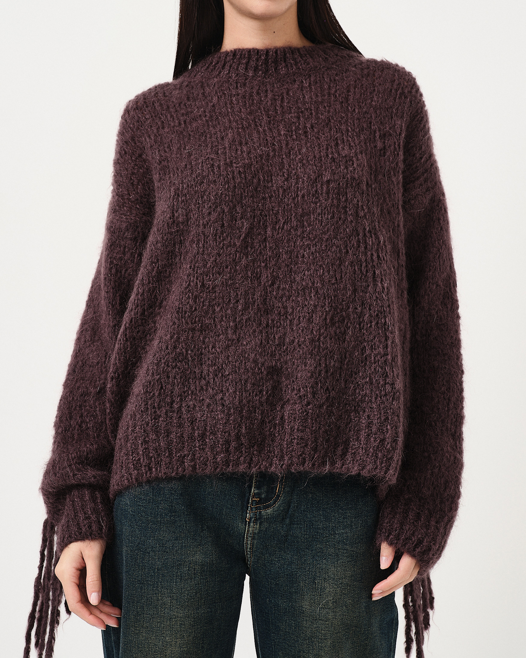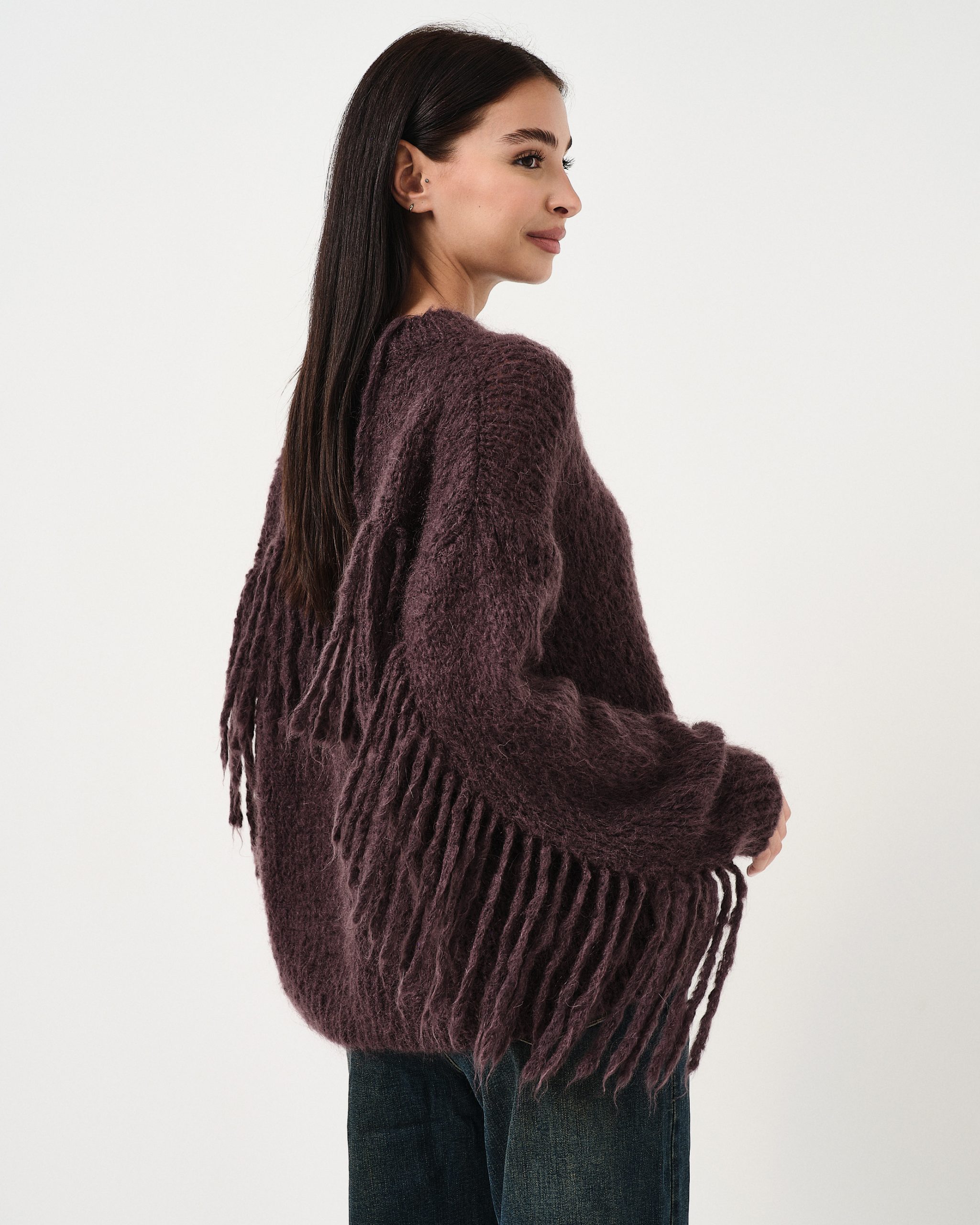 Pullover in lana mohair girocollo effetto fluffy con frange.