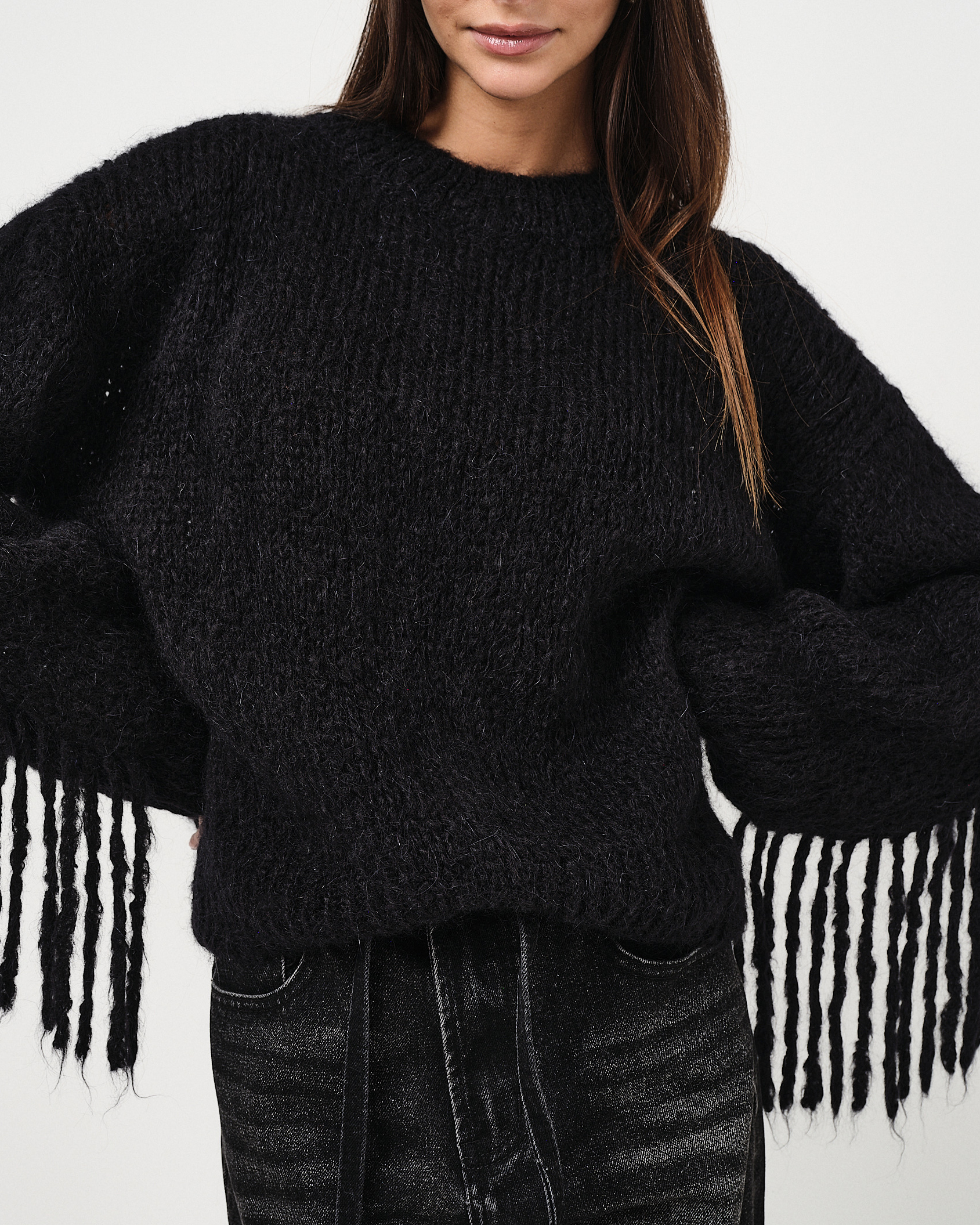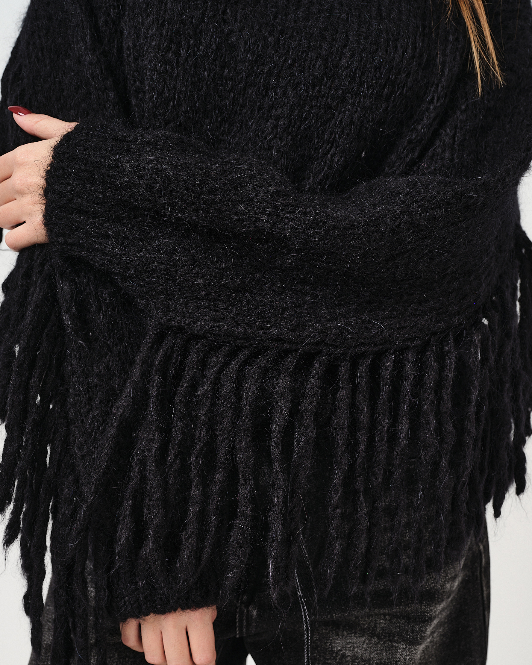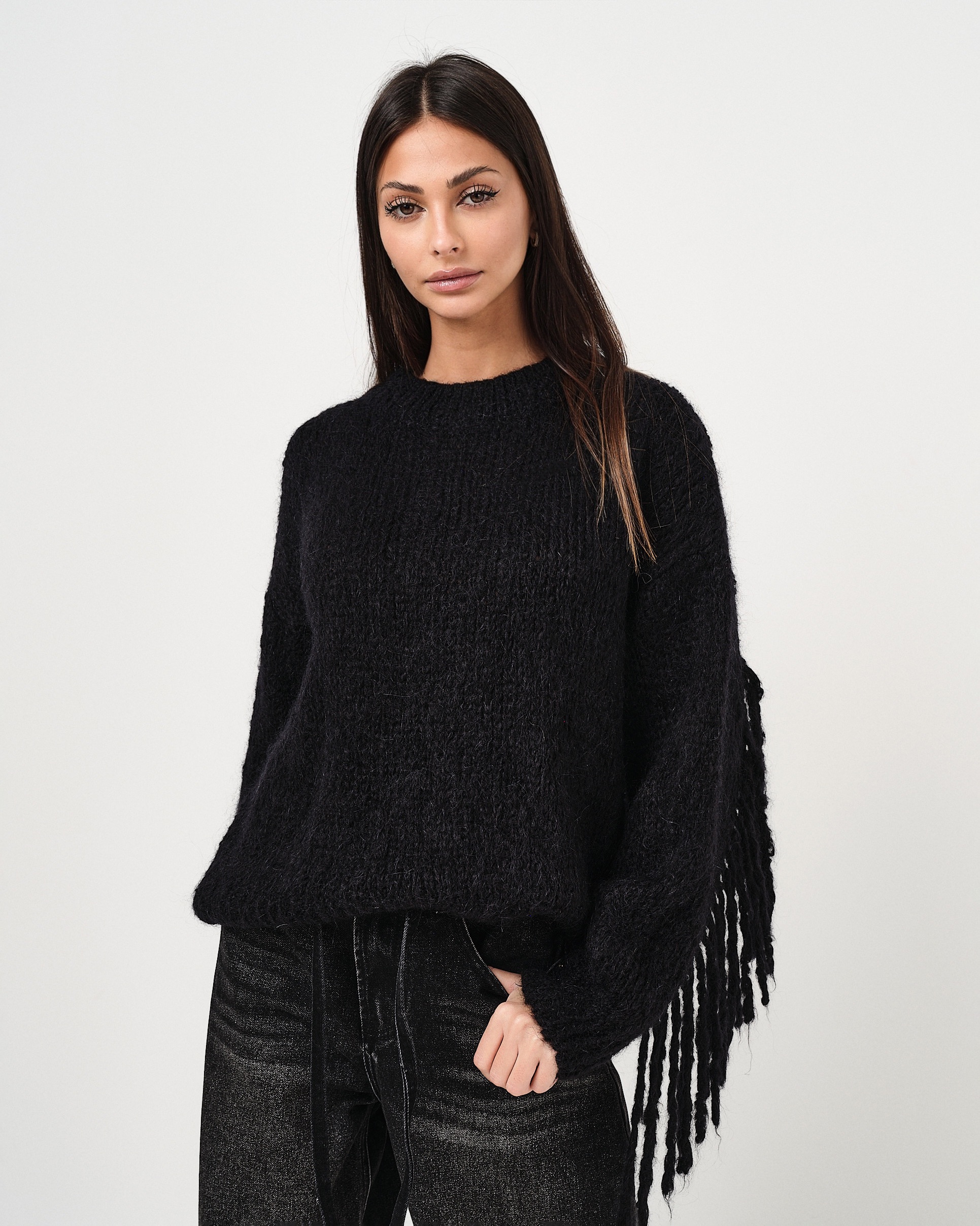 Pullover in lana mohair girocollo effetto fluffy con frange.