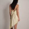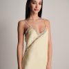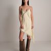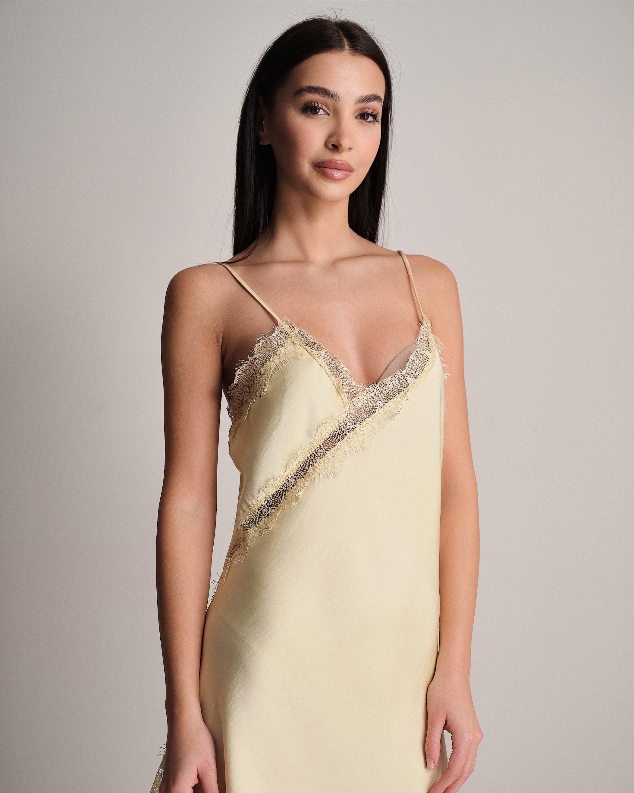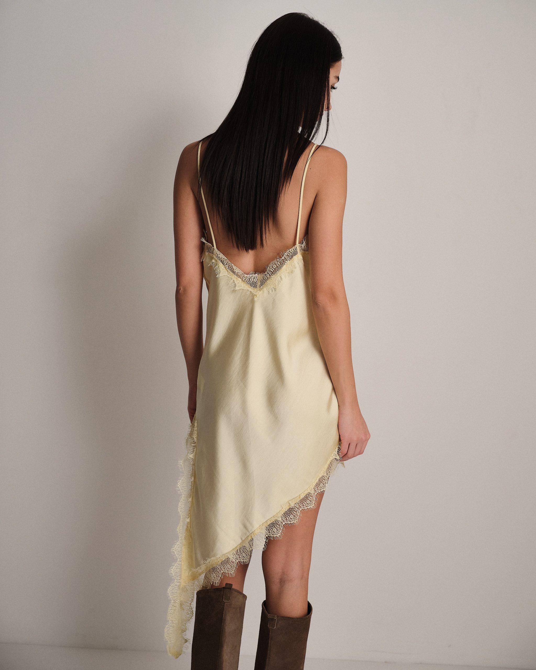 Abito asimmetrico in raso con scollatura e fondo in pizzo ricamato.
