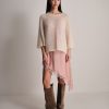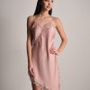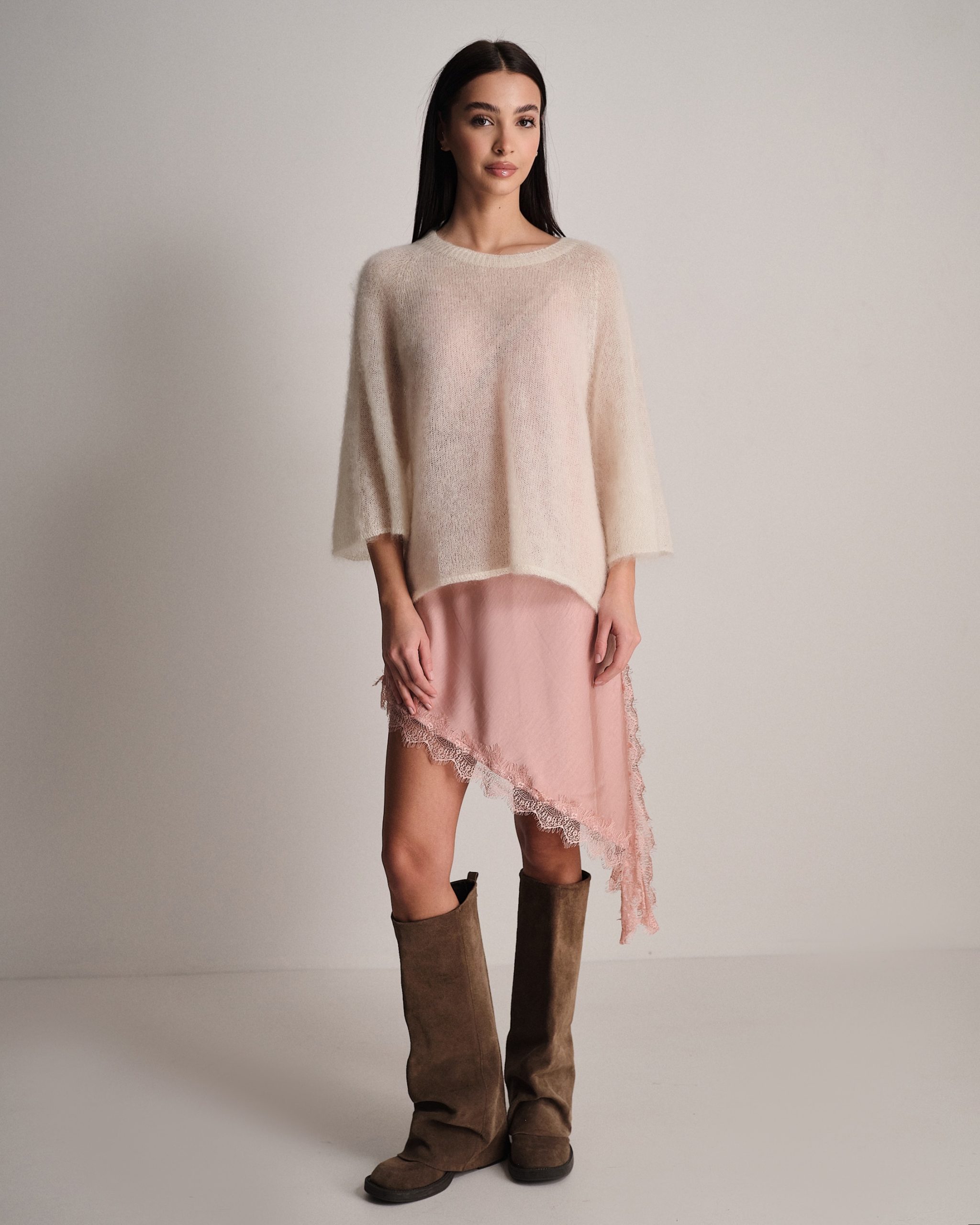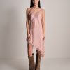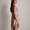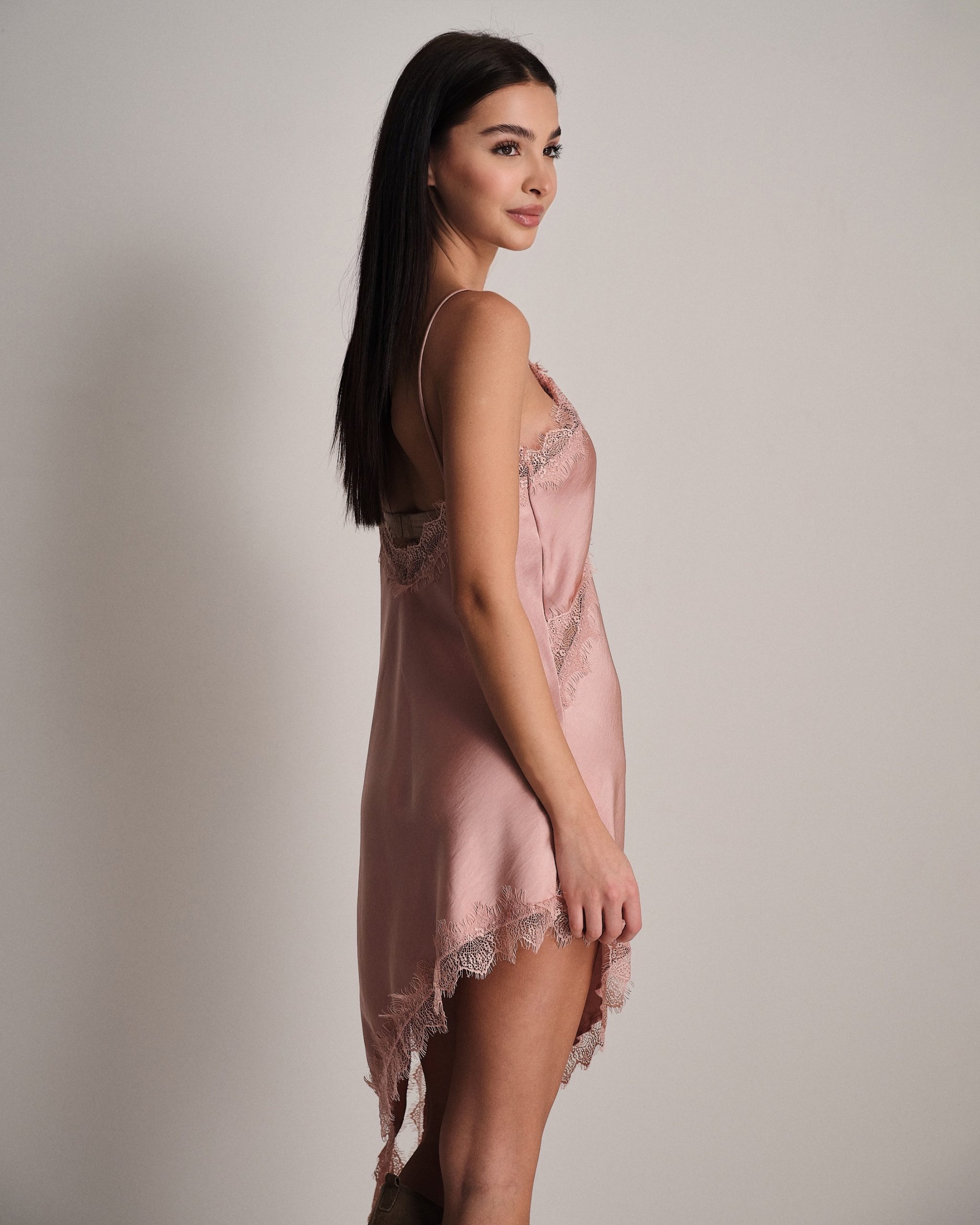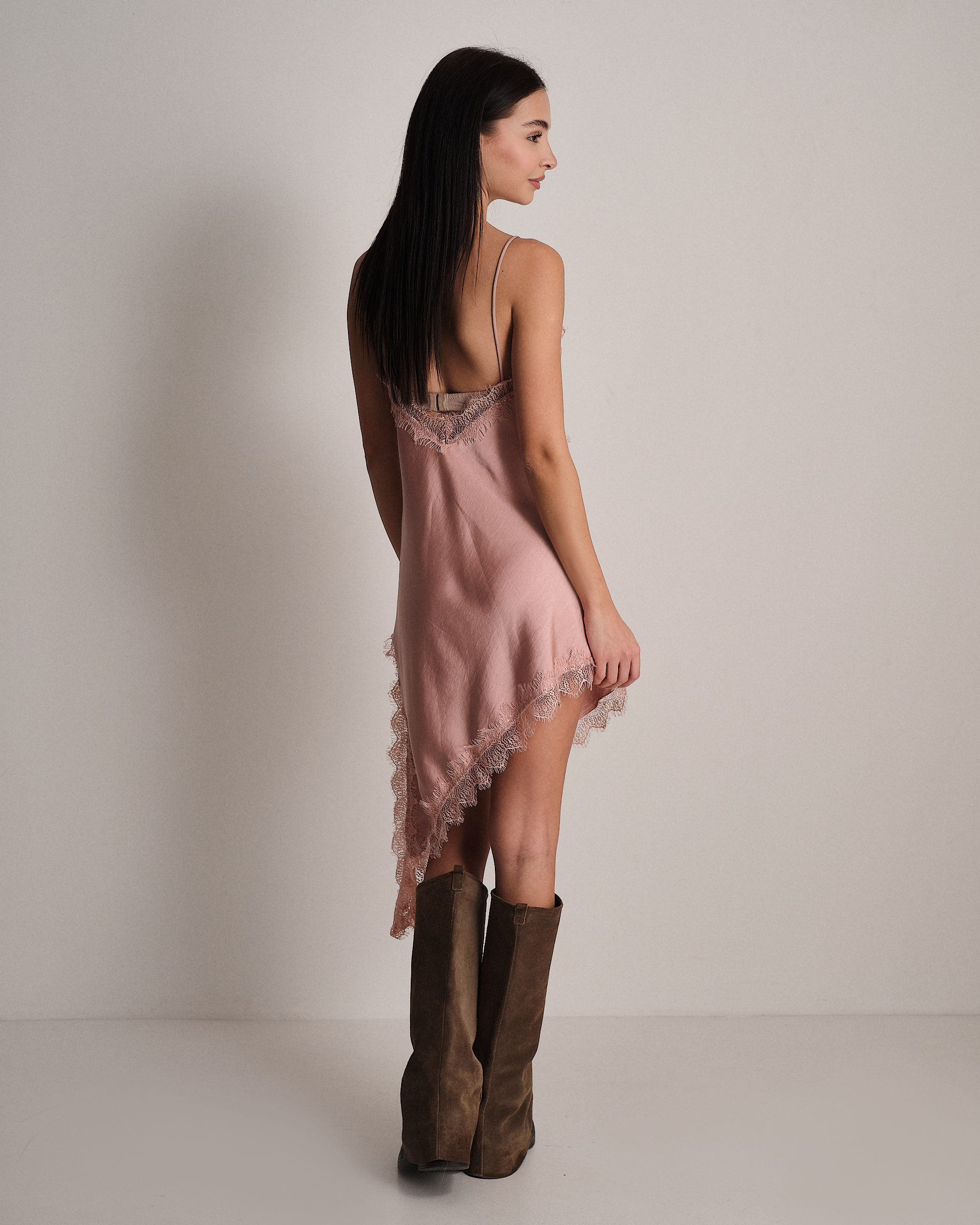 Abito asimmetrico in raso con scollatura e fondo in pizzo ricamato.