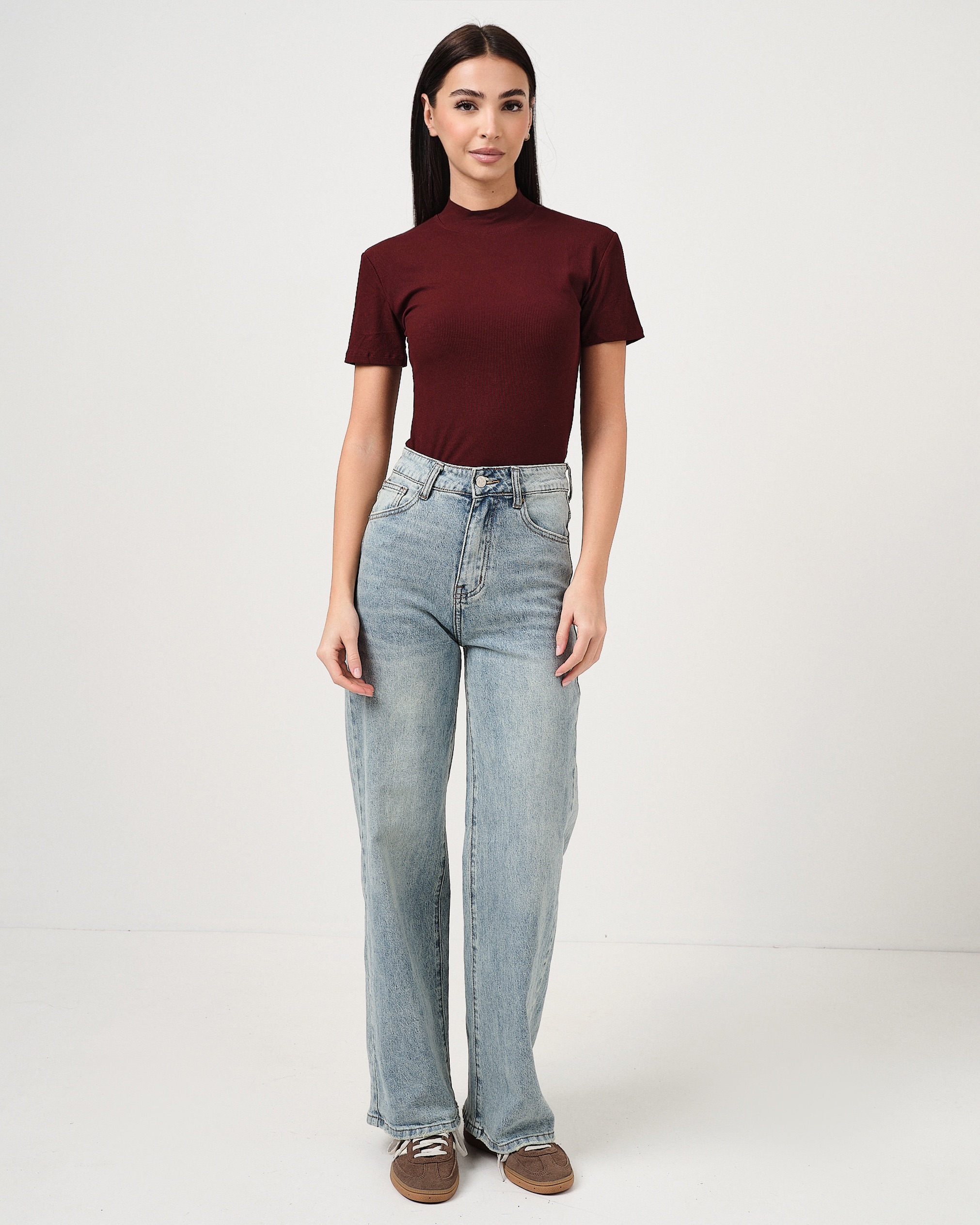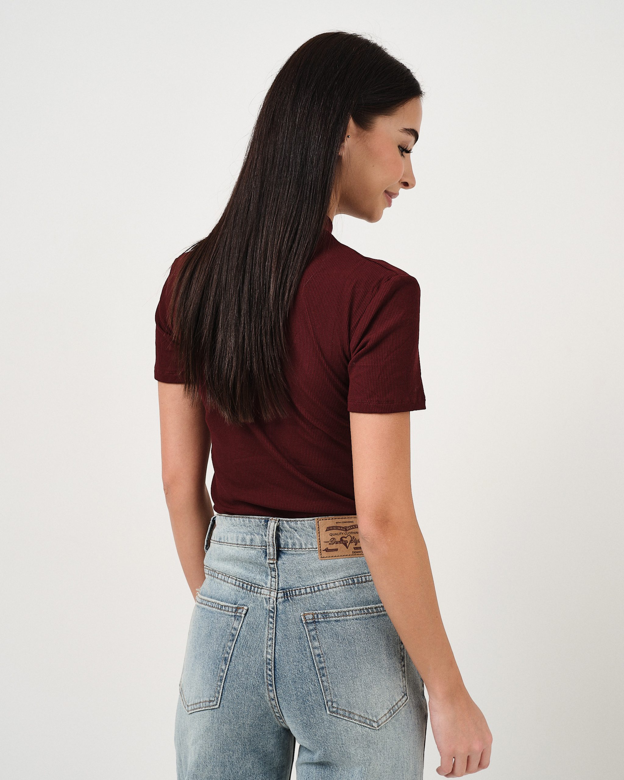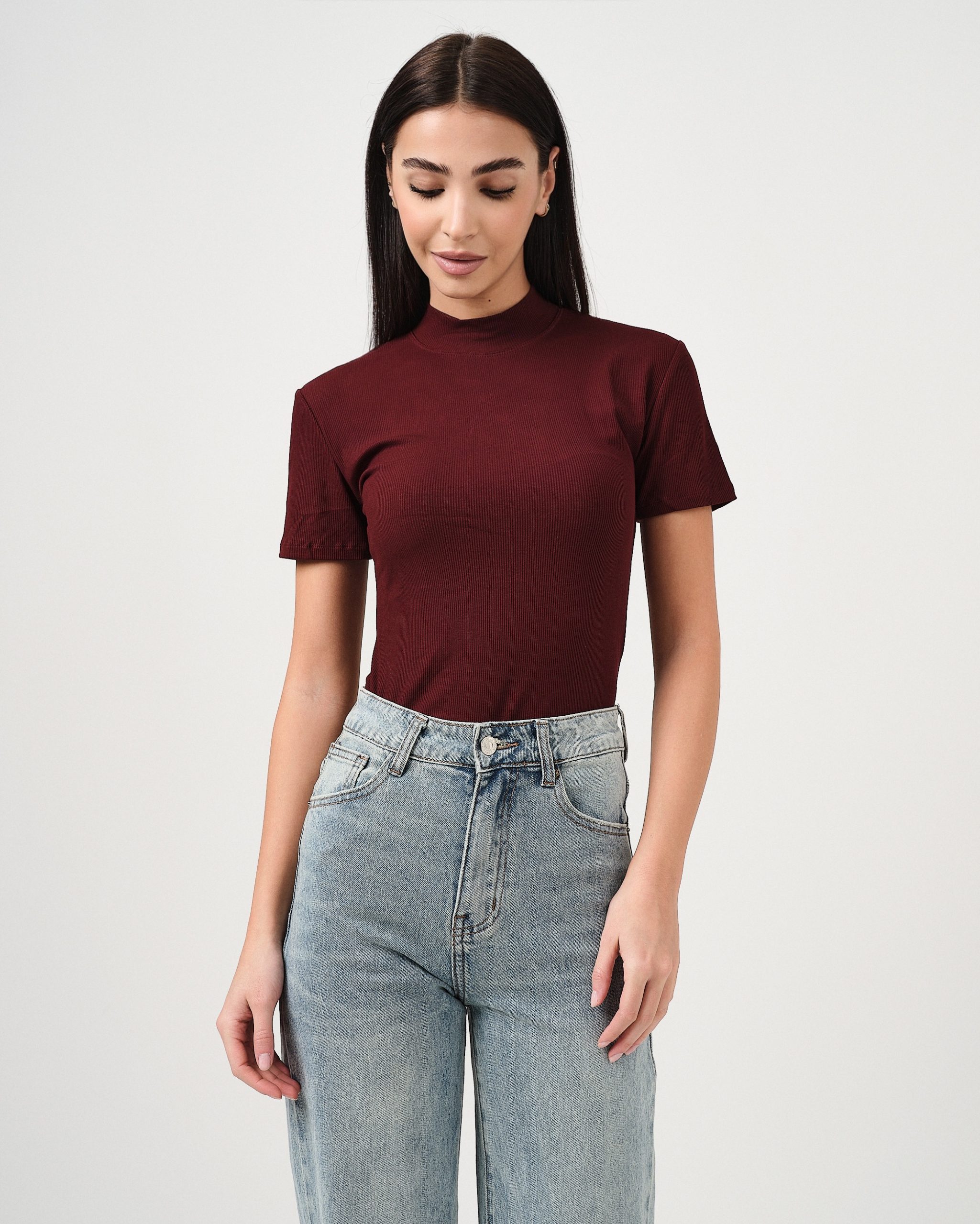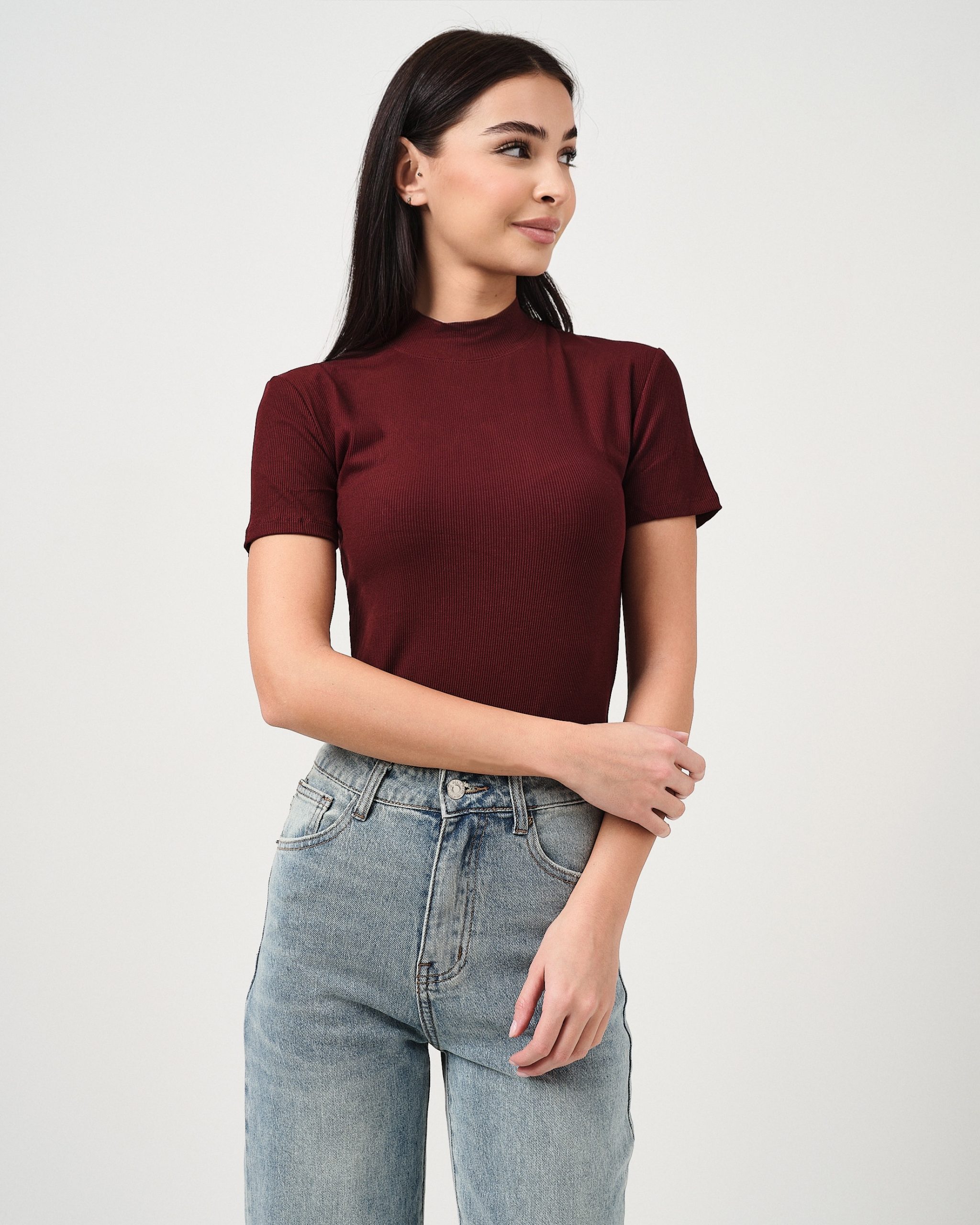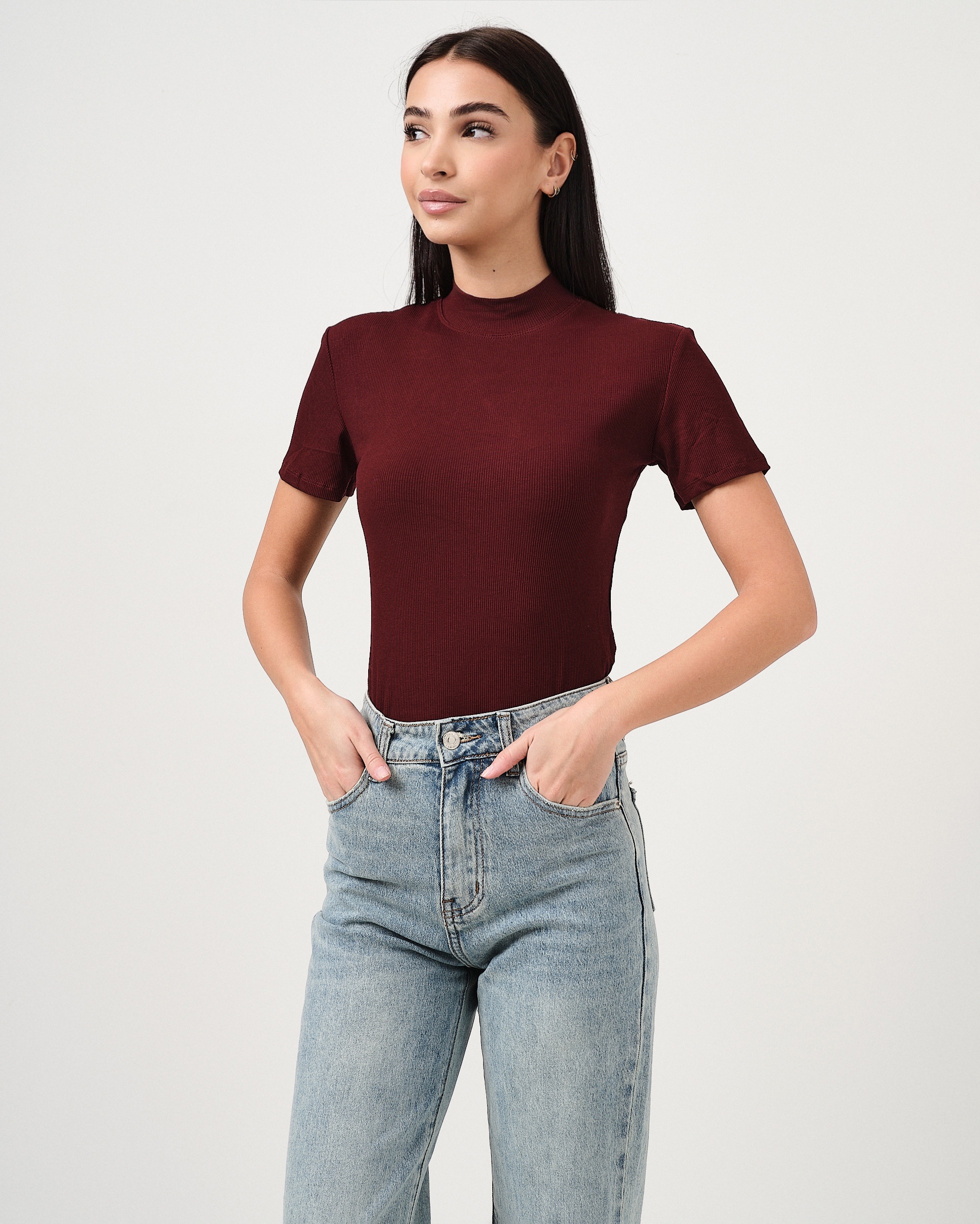 T-shirt basic in maglia elasticizzata a mezza manica con collo a lupetto.