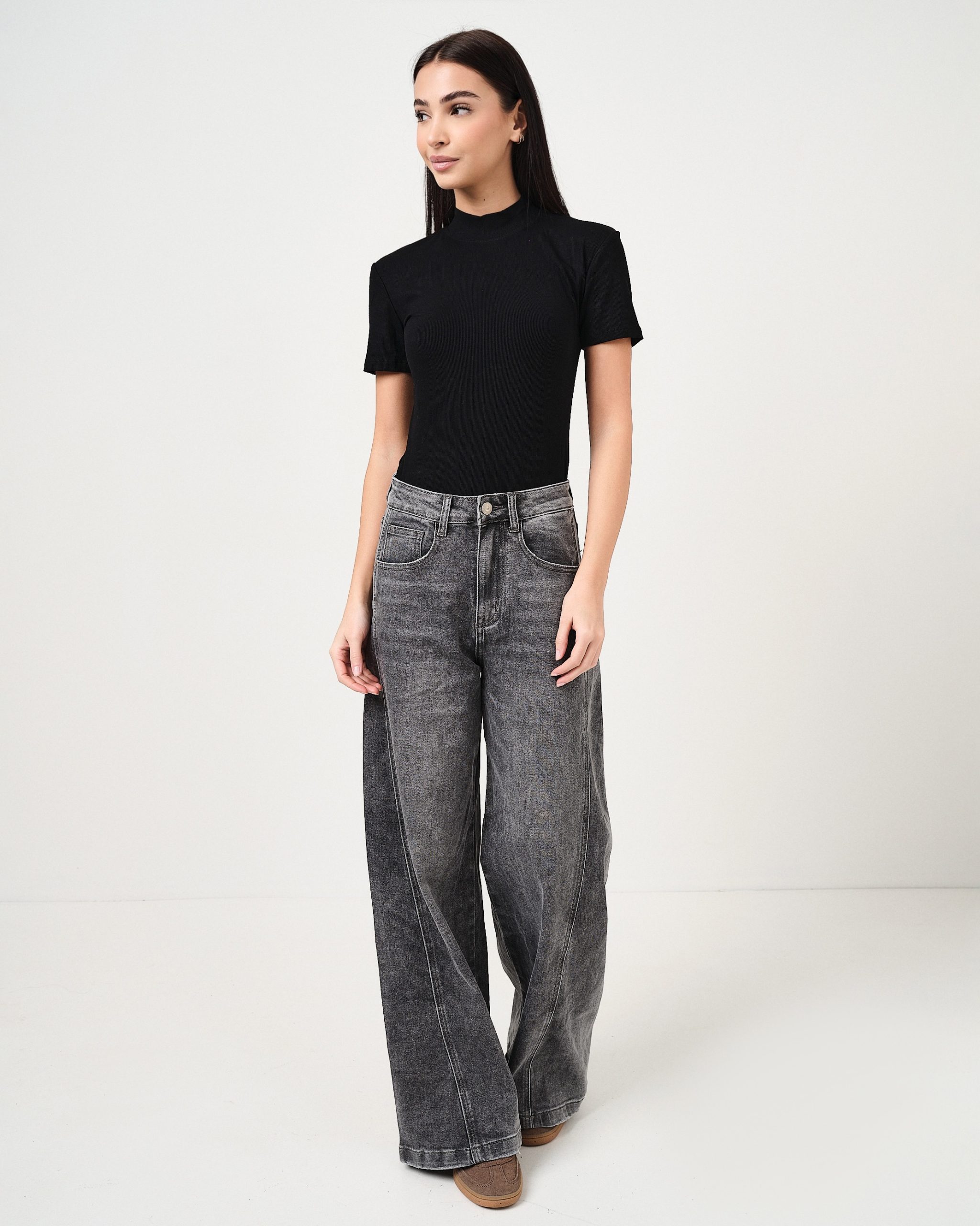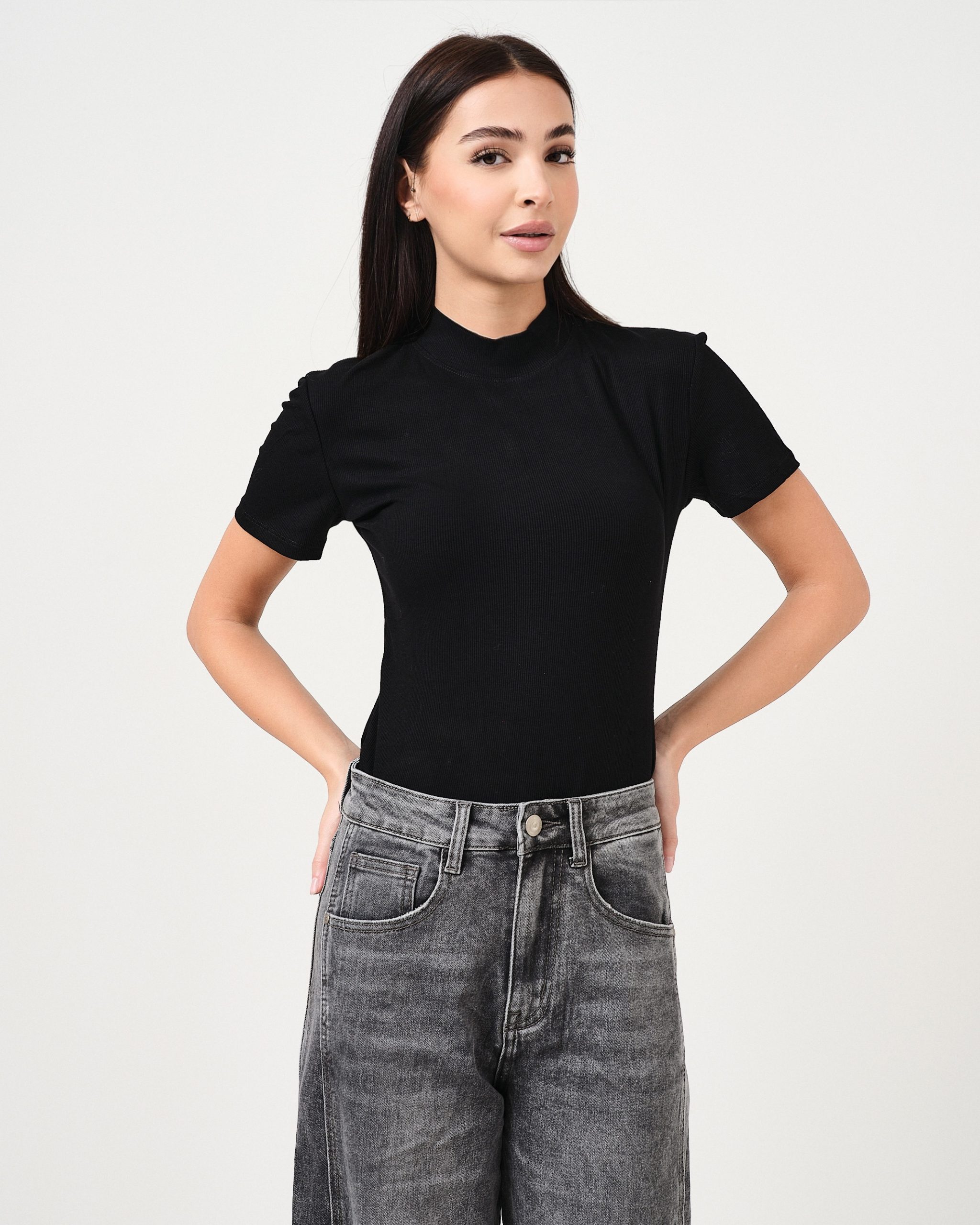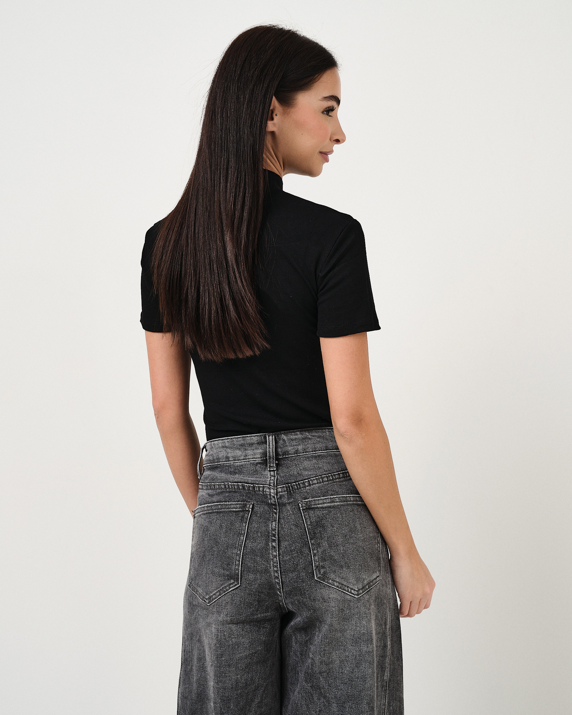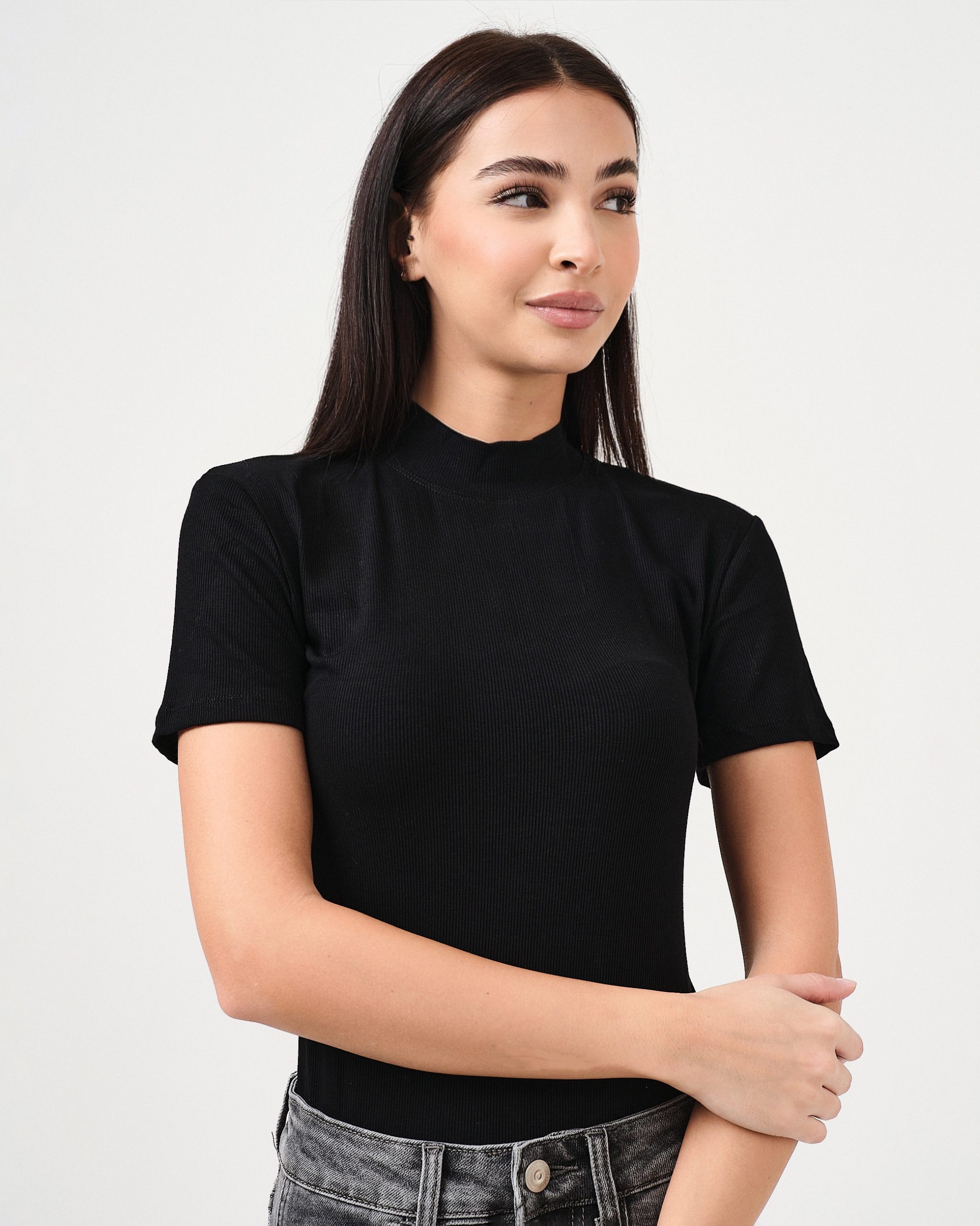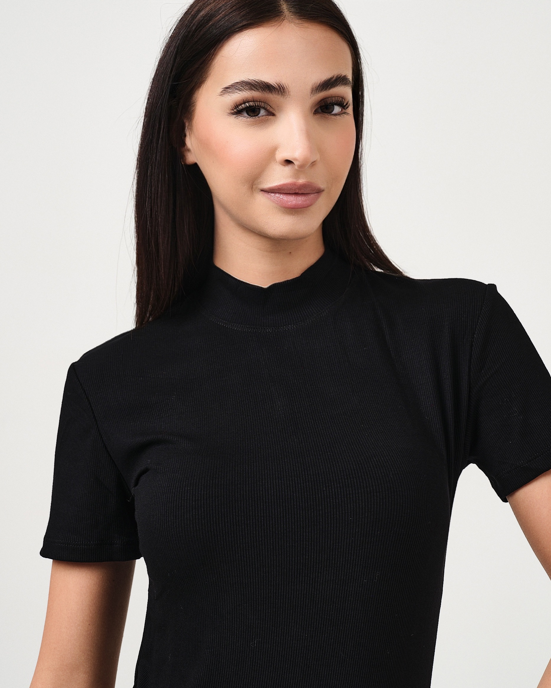 T-shirt basic in maglia elasticizzata a mezza manica con collo a lupetto.