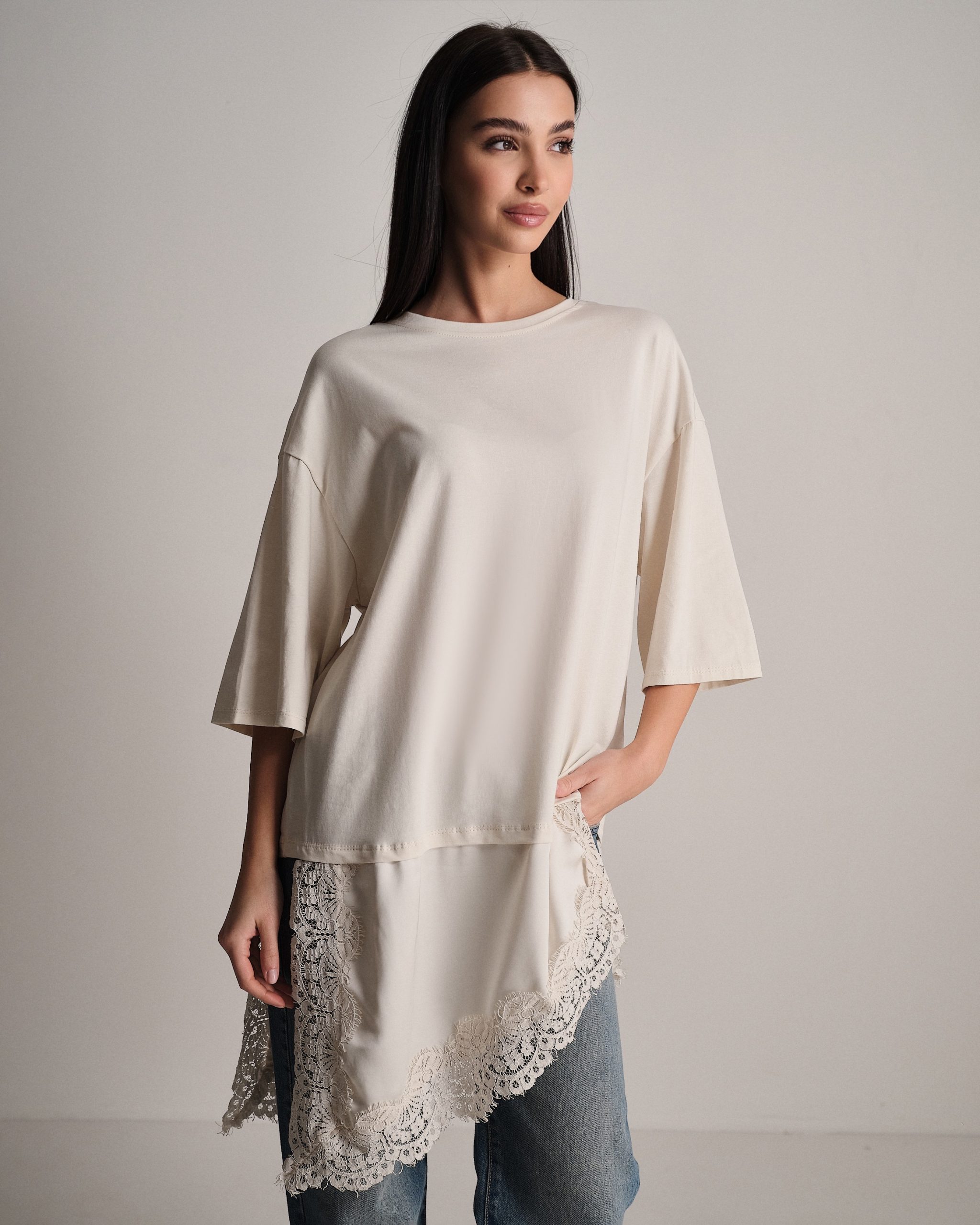 Maxi t-shirt oversize con manica a tre quarti e balza sul fondo in raso e pizzo.