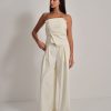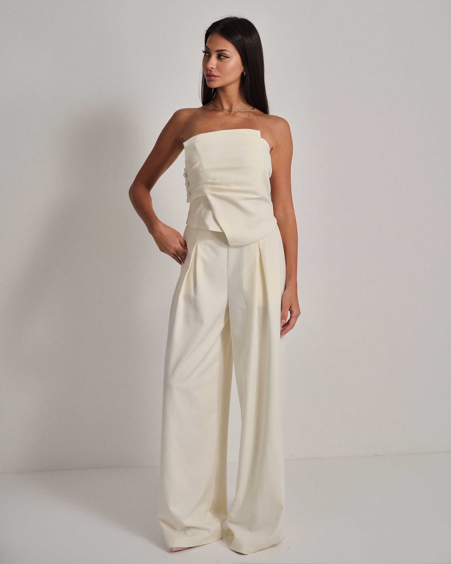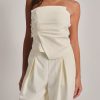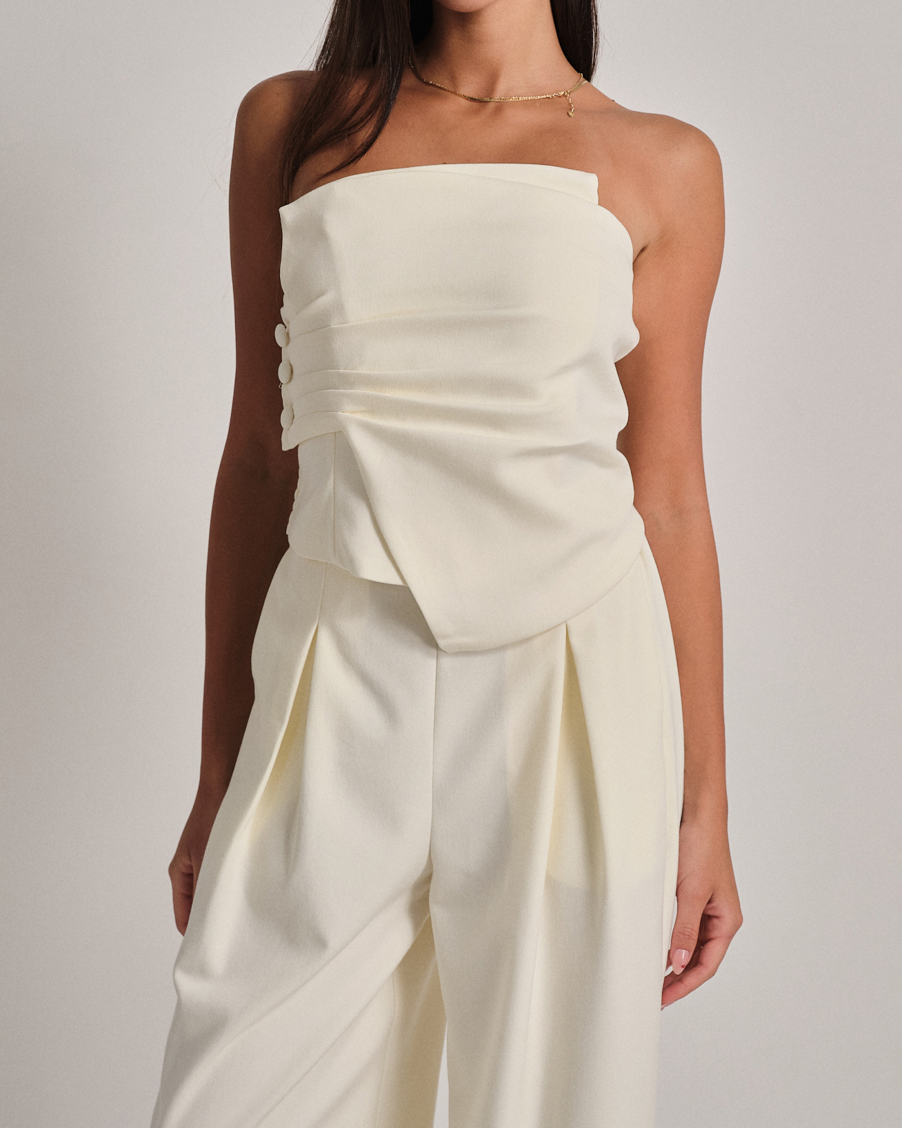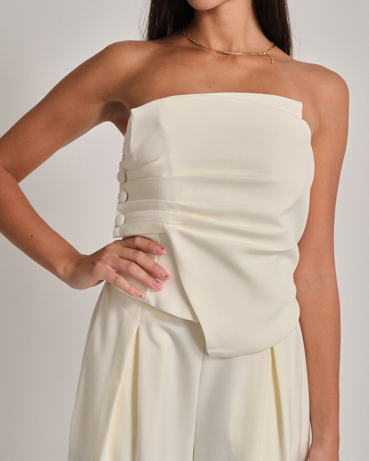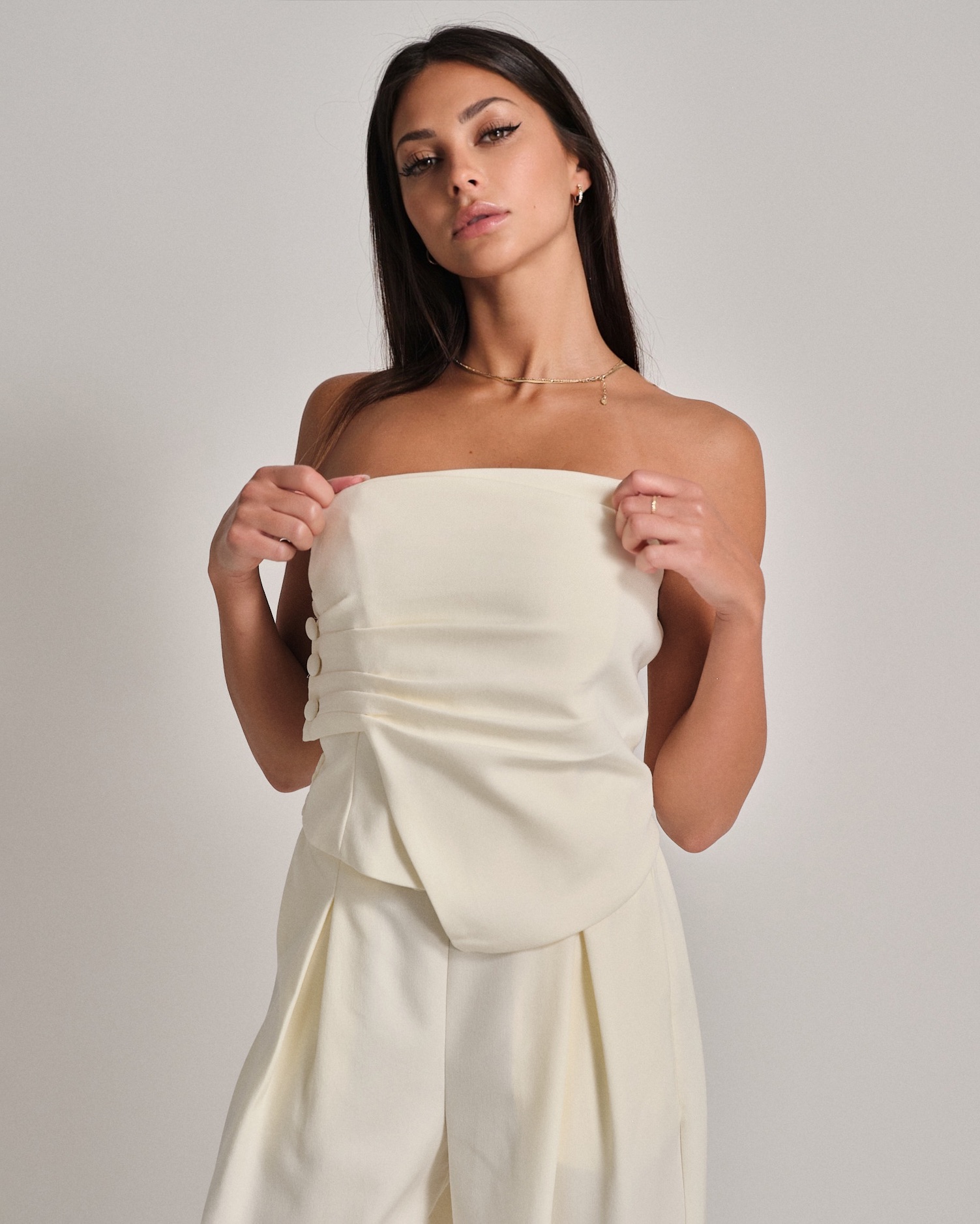 Top senza spalline dal design strutturato con bottoncini tono su tono e arricciatura.