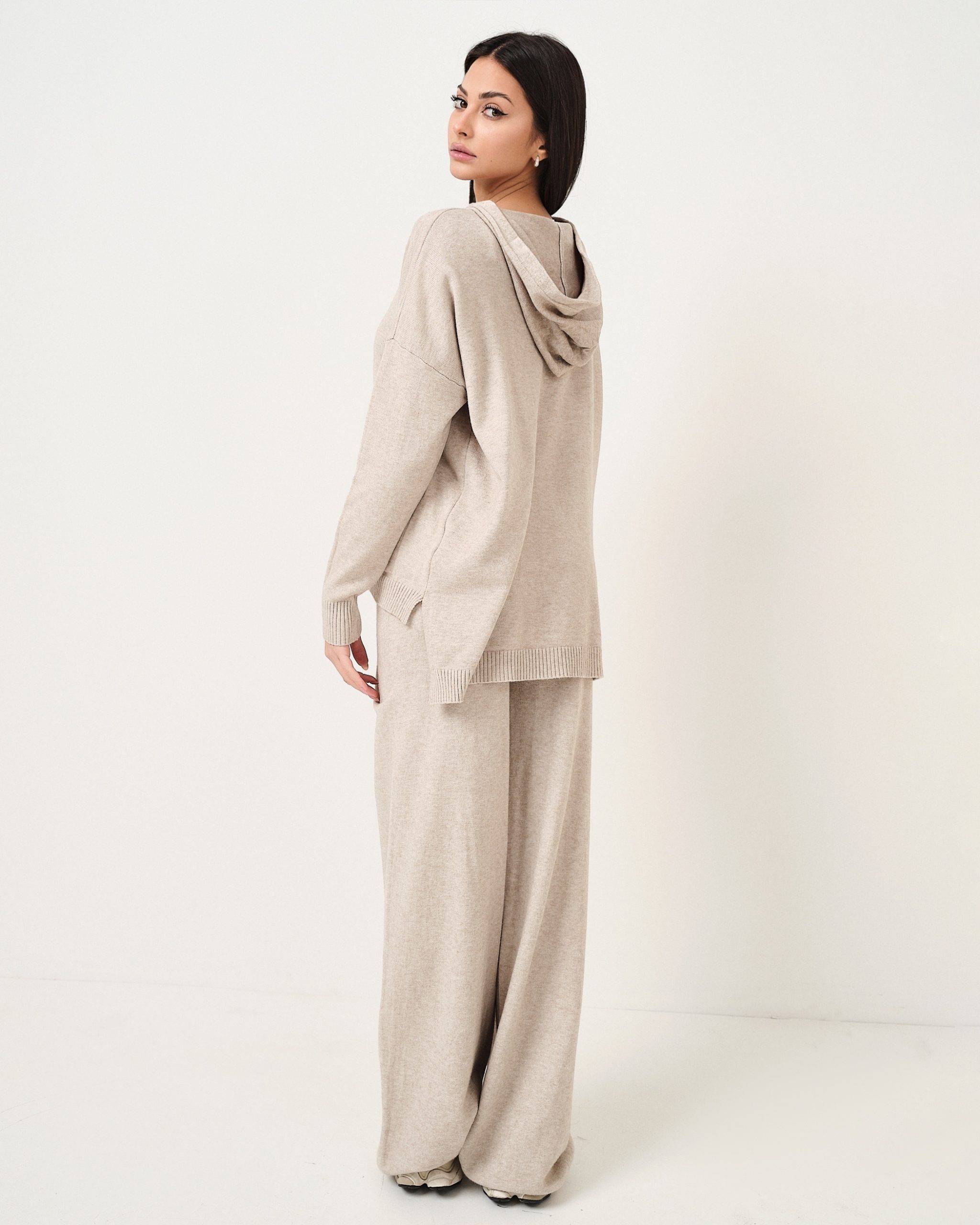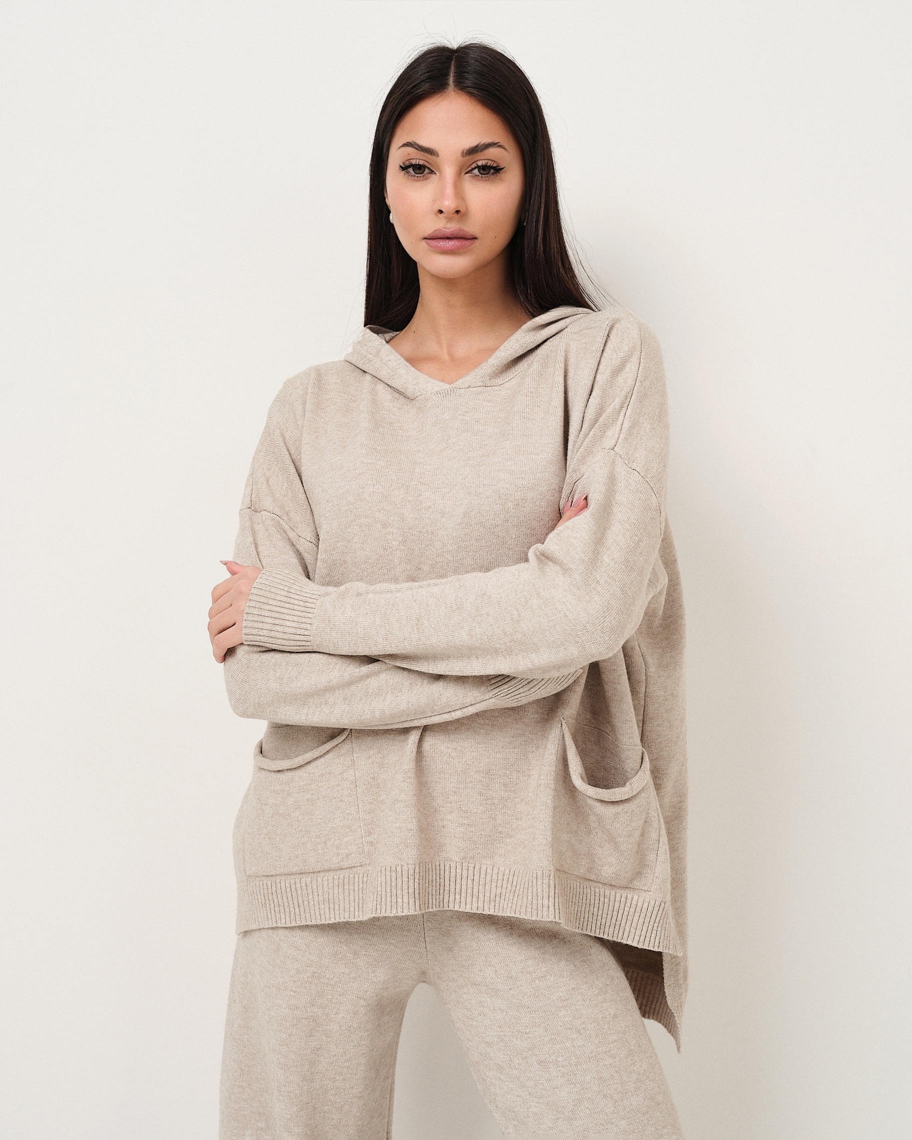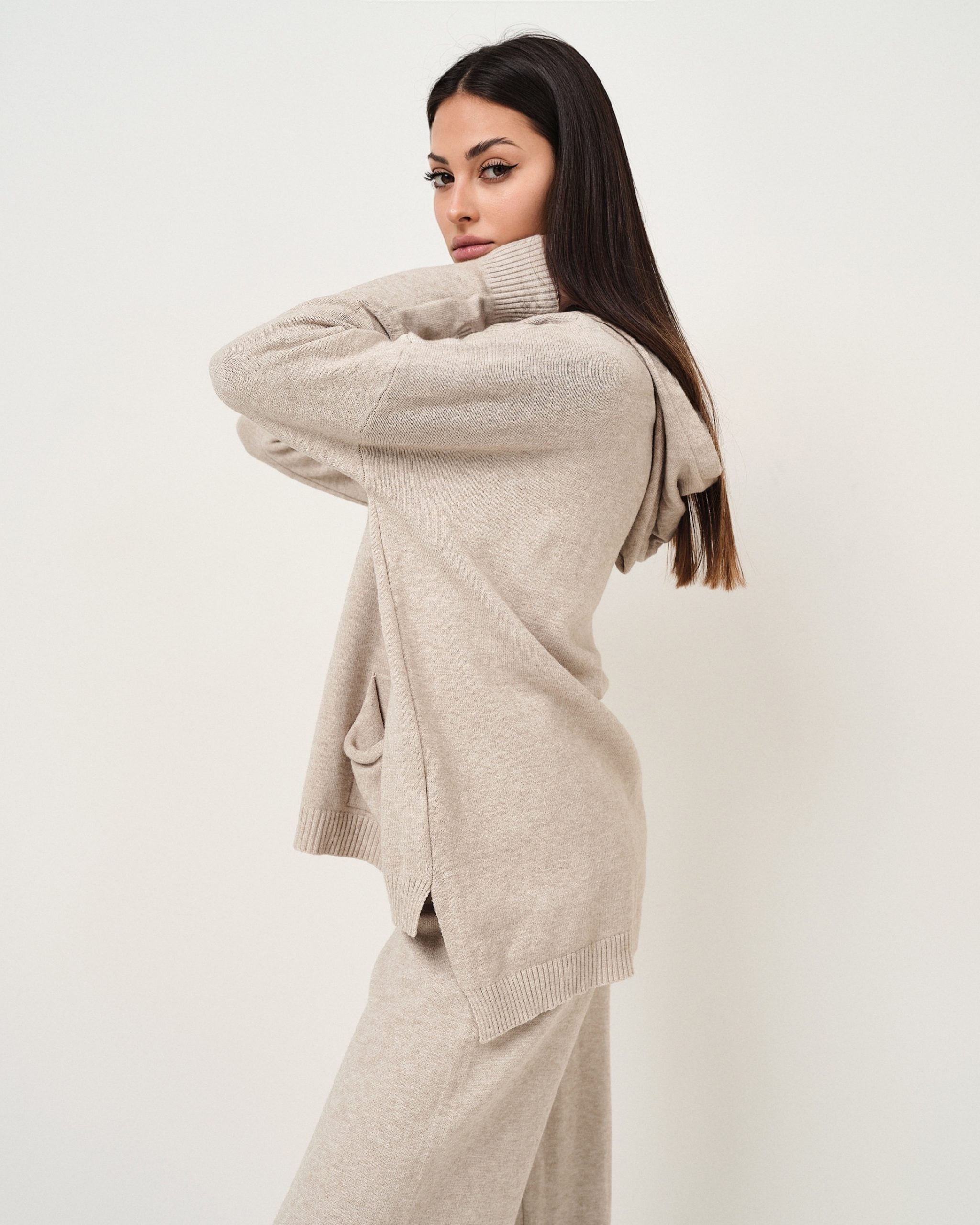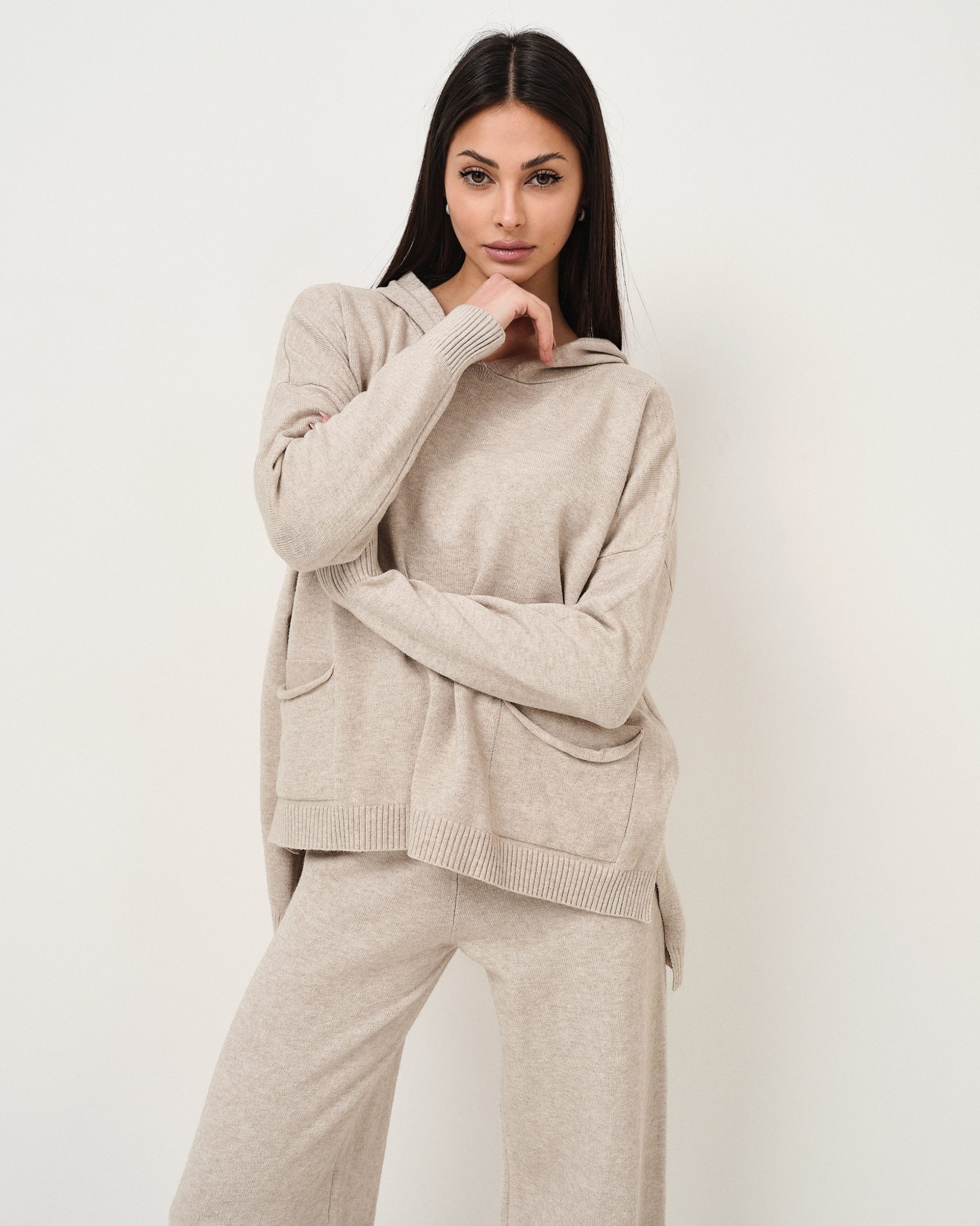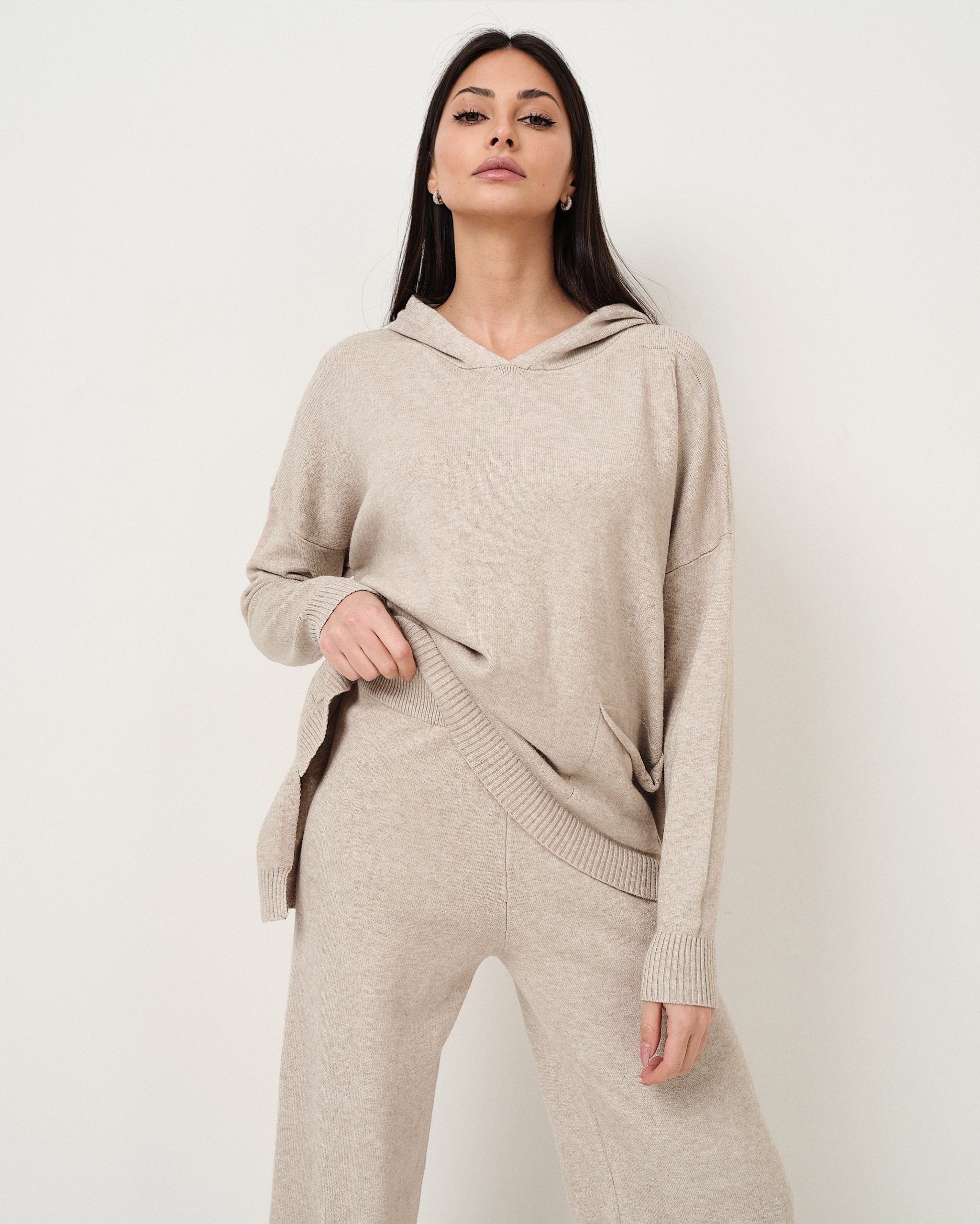 Set coordinato in maglia elasticizzato composto da maxi maglia asimmetrica con cappuccio, tasche e spacchetti laterali e pantalone morbido con elastico in vita.