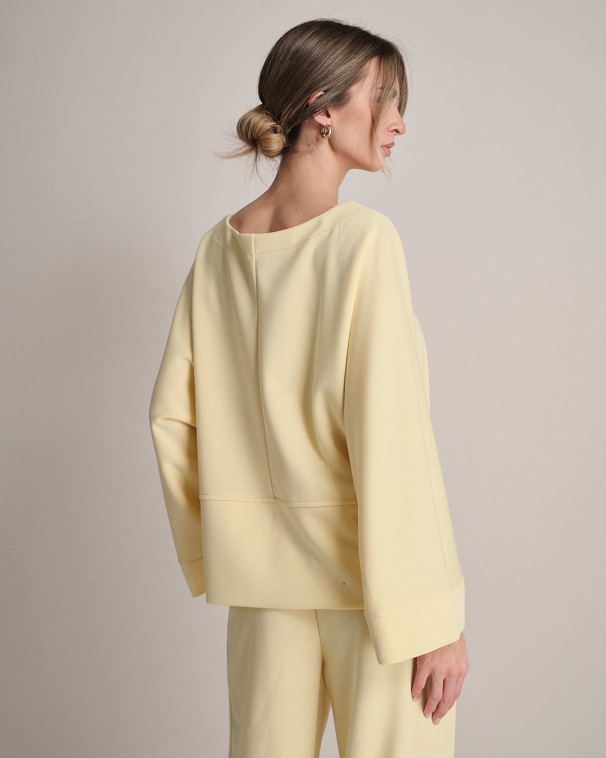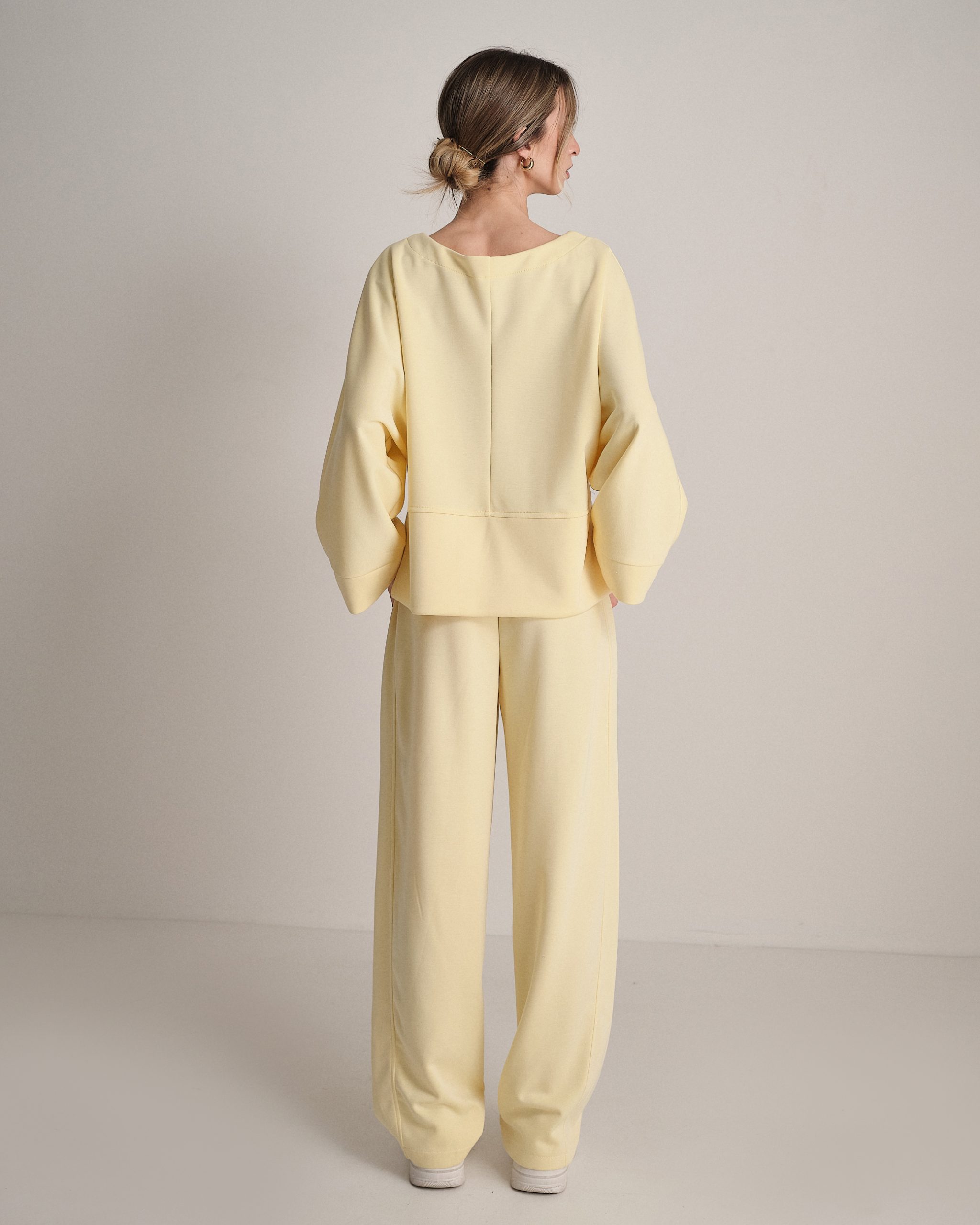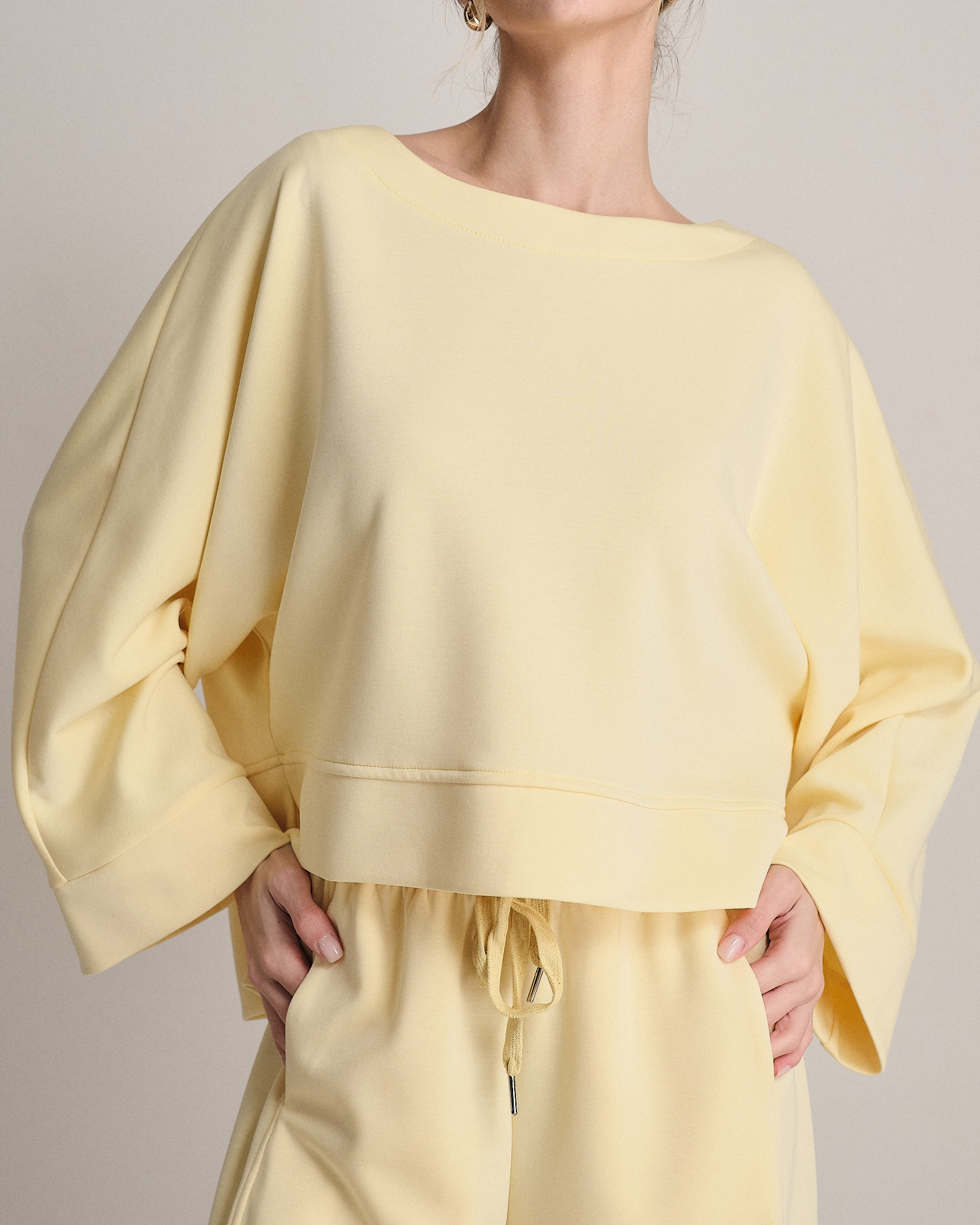 Set coordinato in neoprene con felpa svasata e jogger elasticizzato.