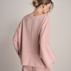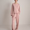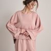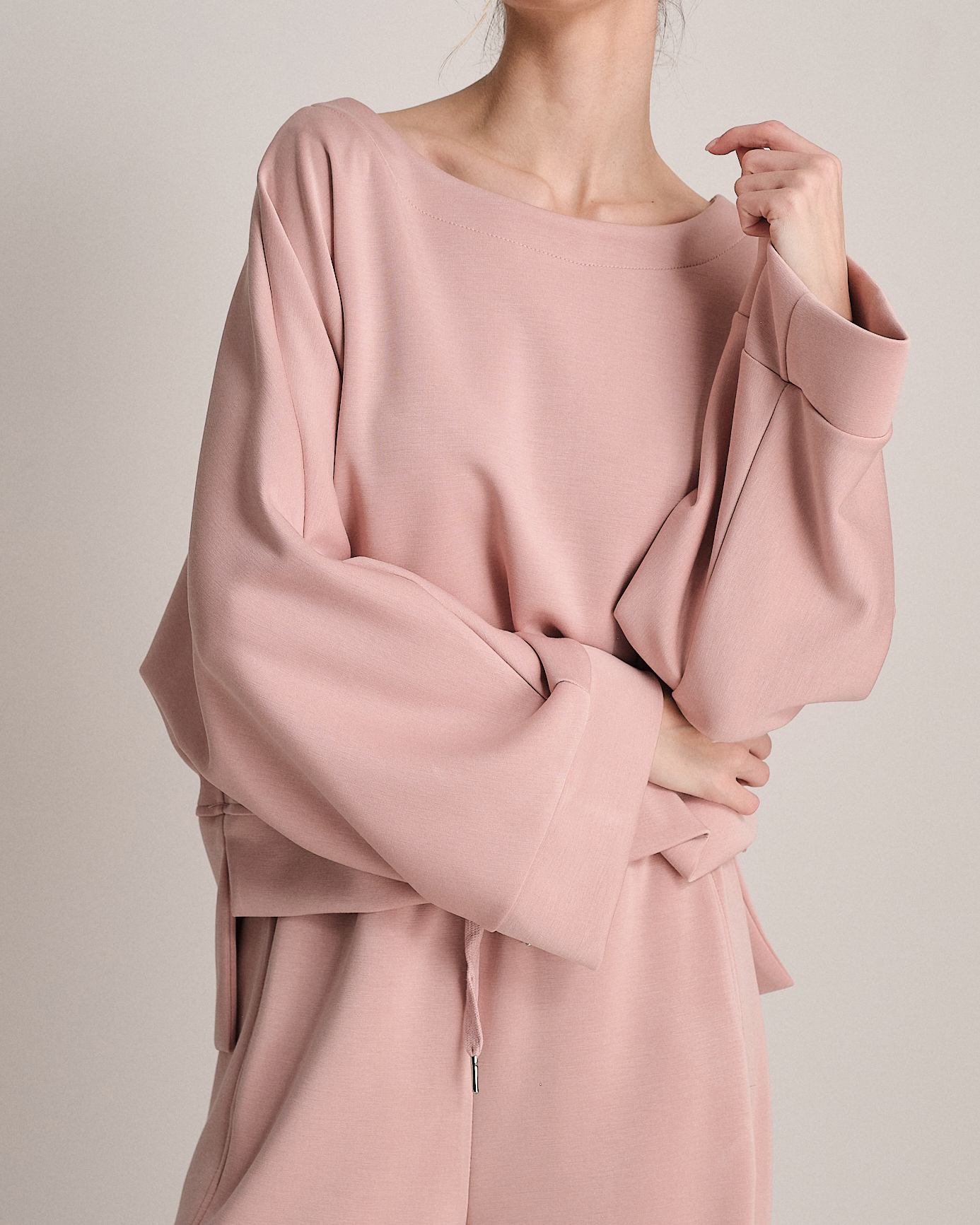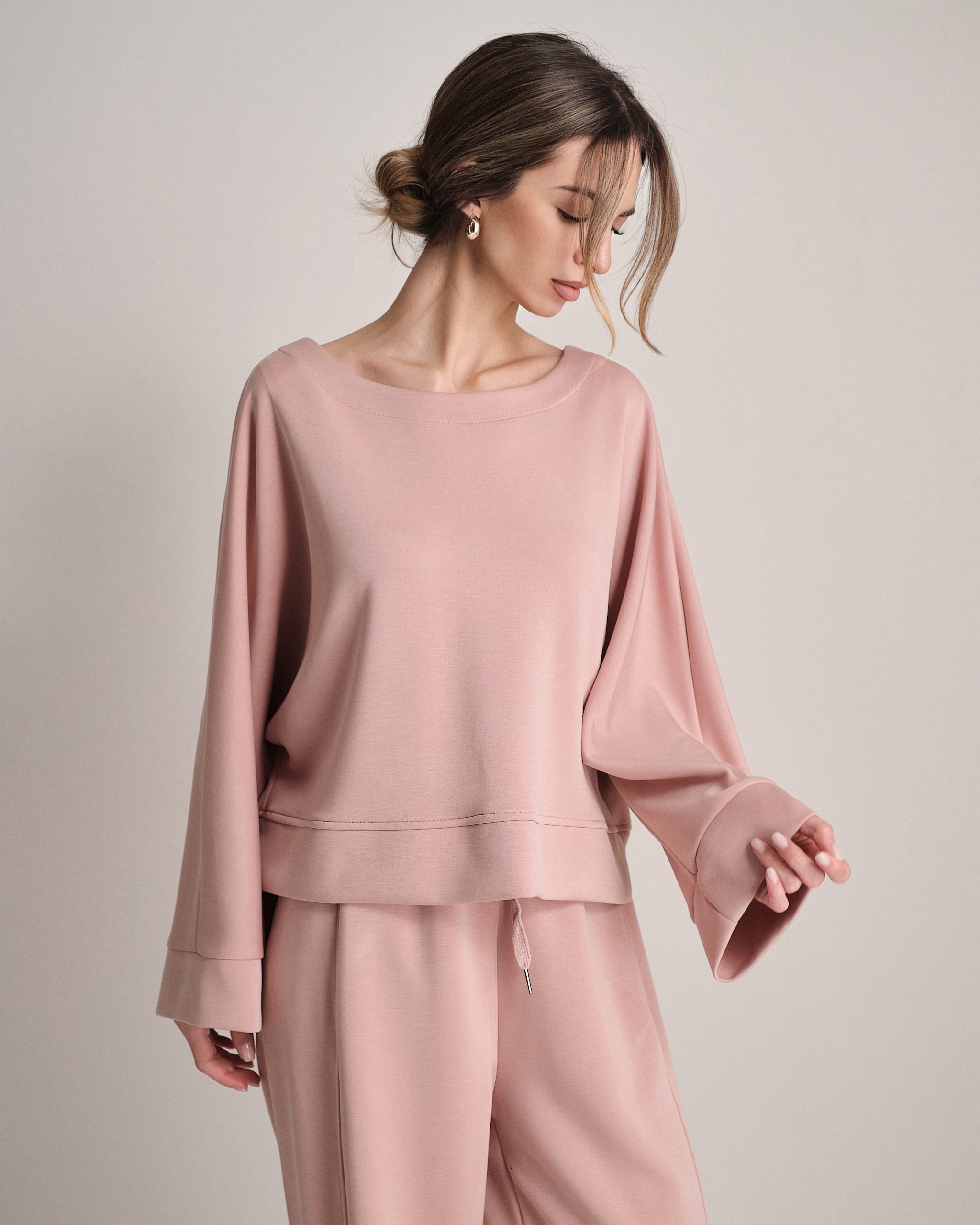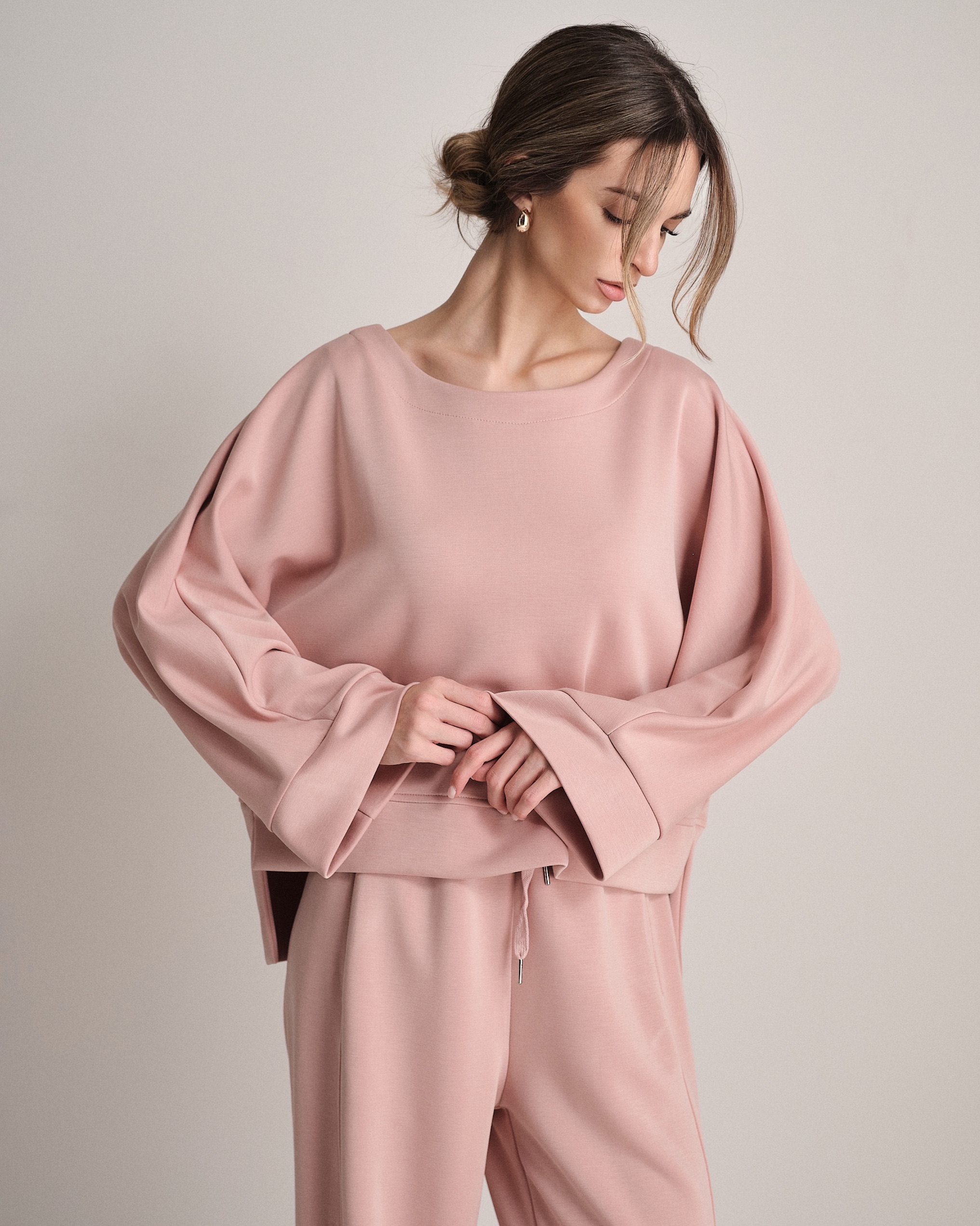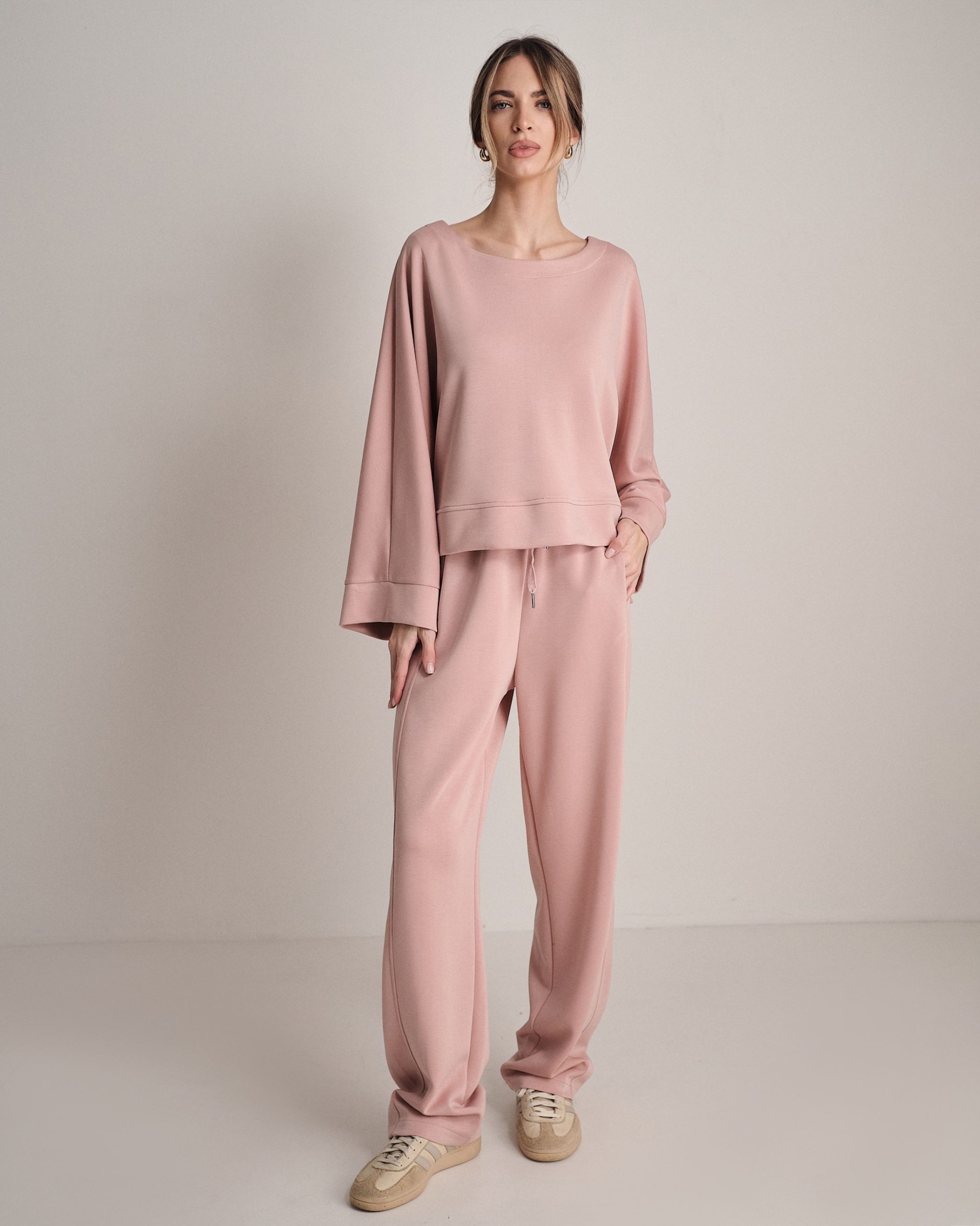 Set coordinato in neoprene con felpa svasata e jogger elasticizzato.