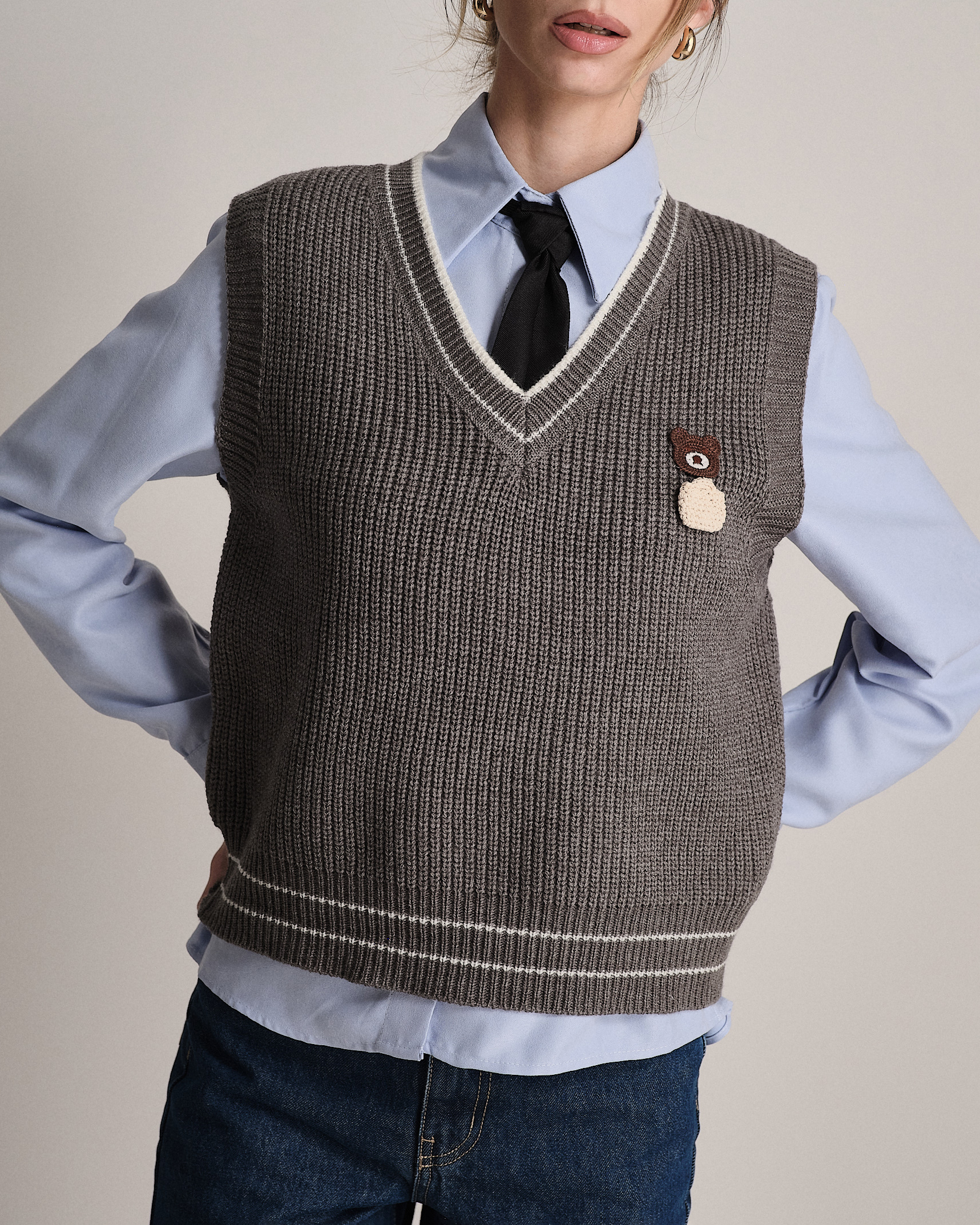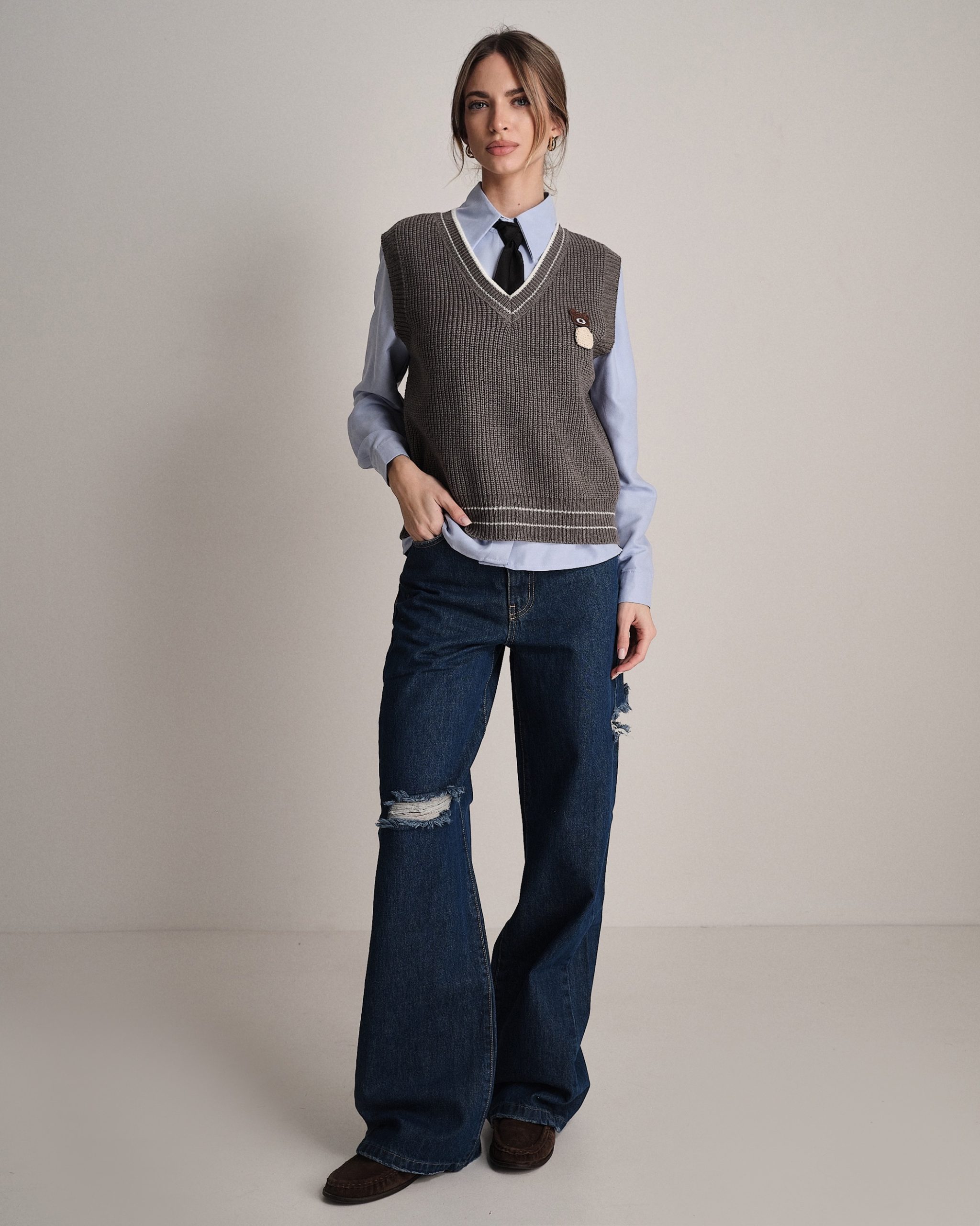 Completo composto da camicia in tessuto morbido, gilet in maglia con ricamo e cravatta regolabile.