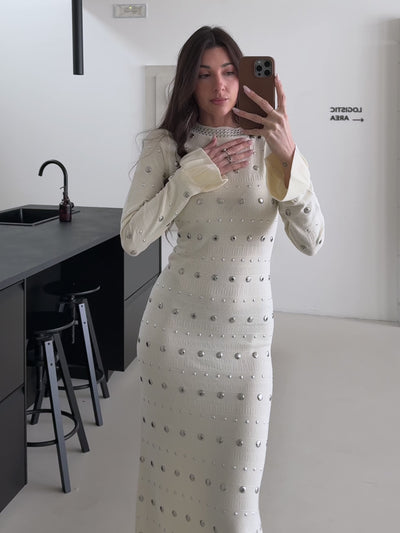 Abito lungo a maniche lunghe in maglia con applicazione di borchie e fondo svasato con balza.